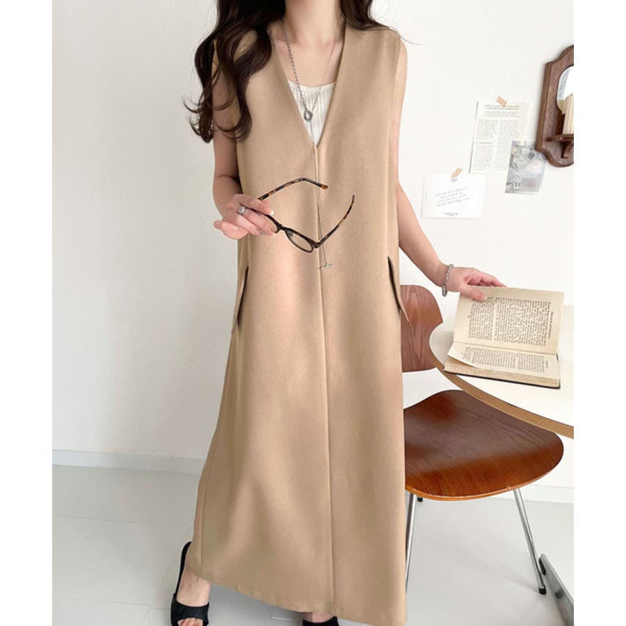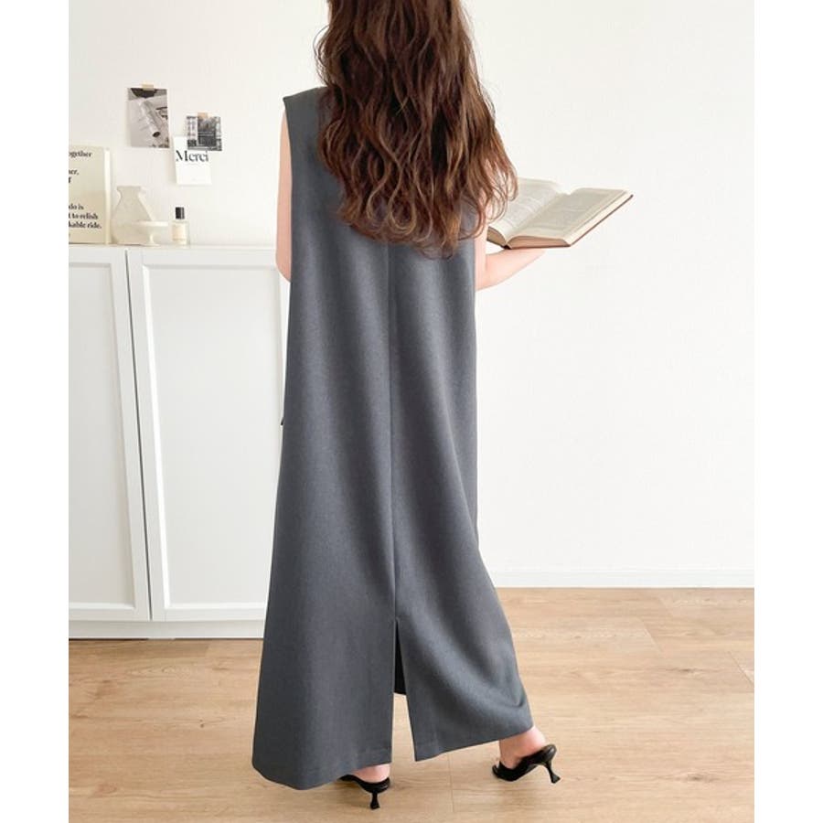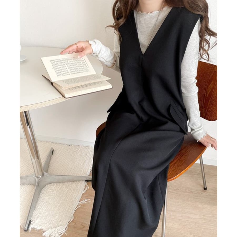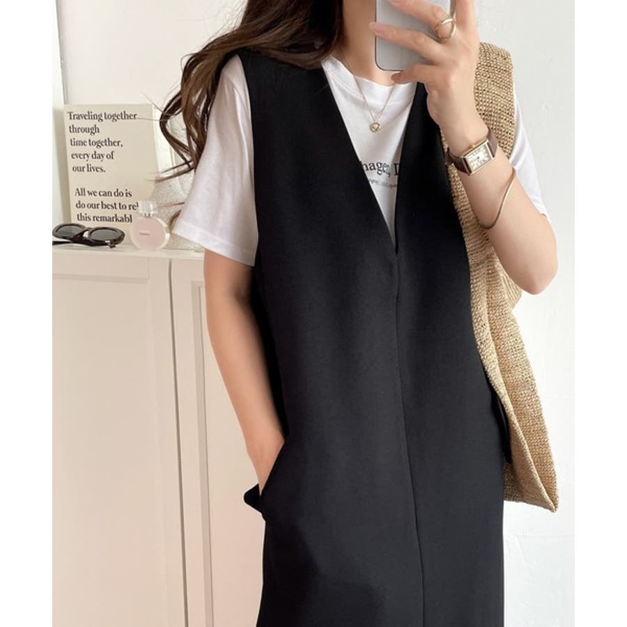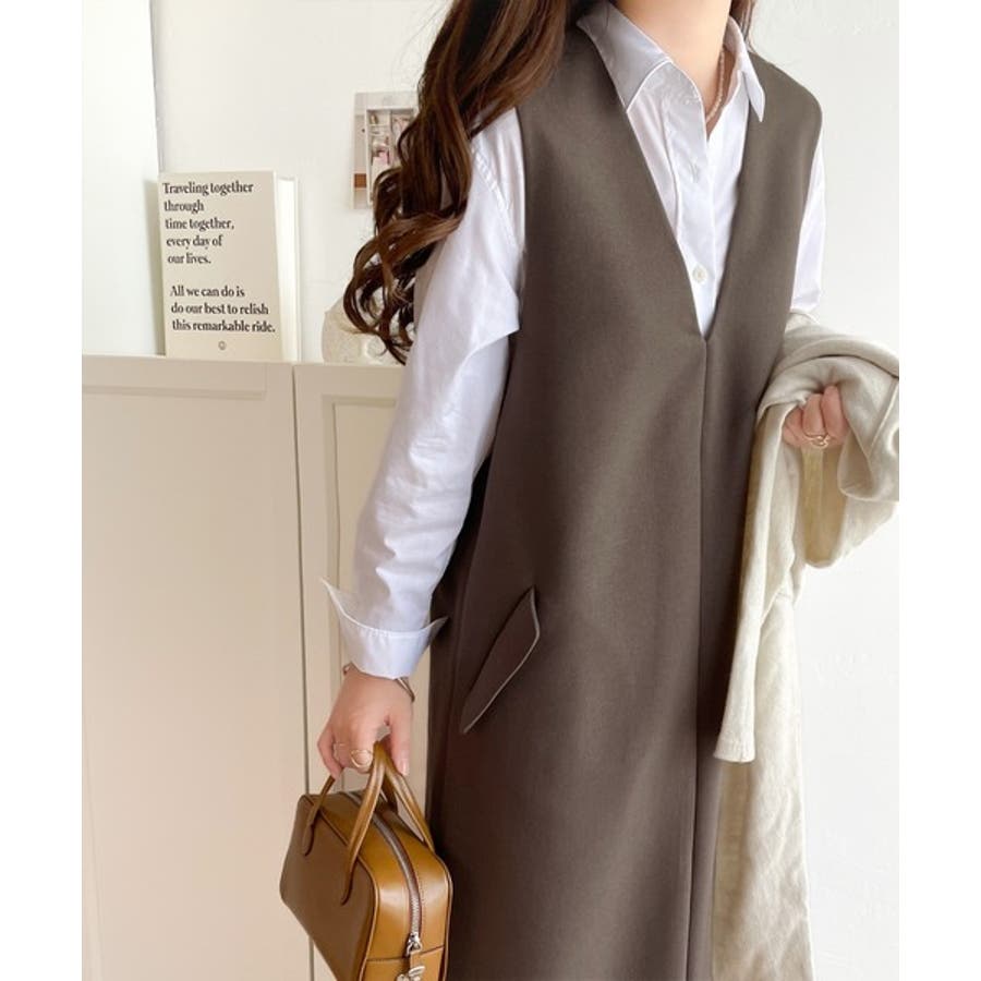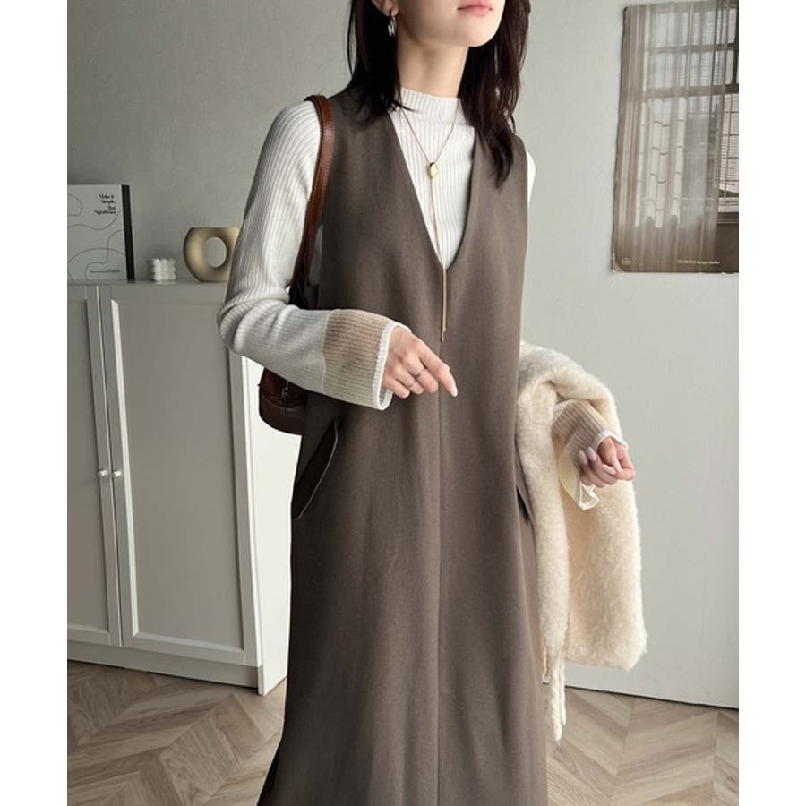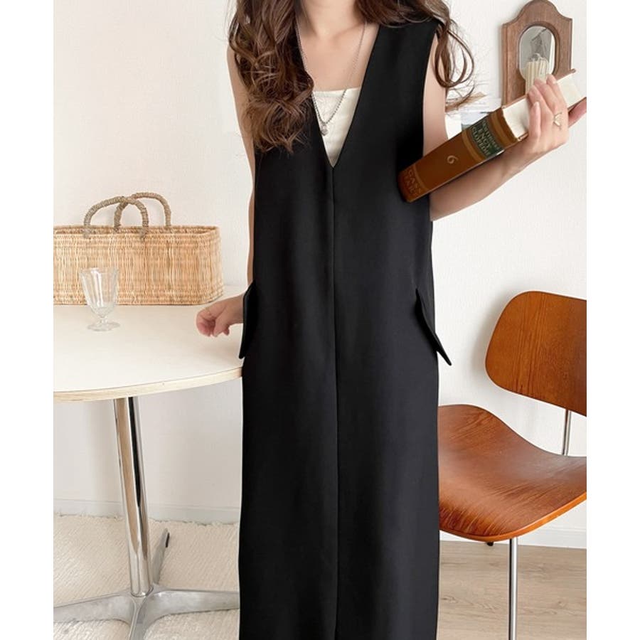 シンプルなデザインながらもフロントのVネックとフラップポケットがアクセントのワンピース。