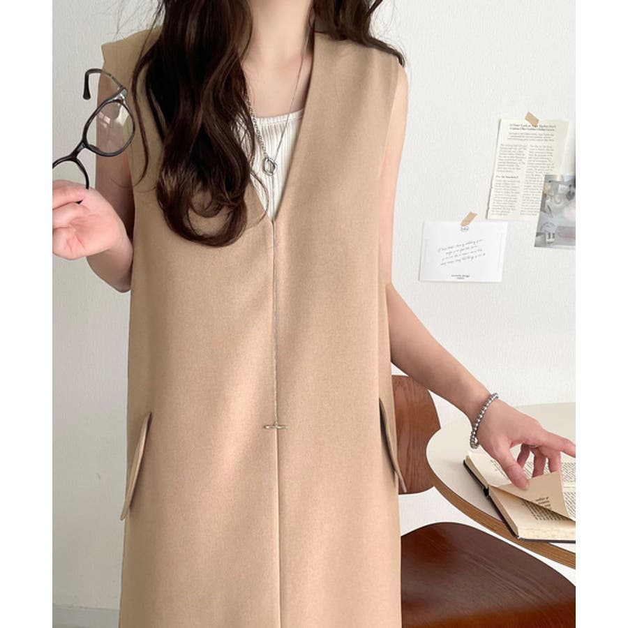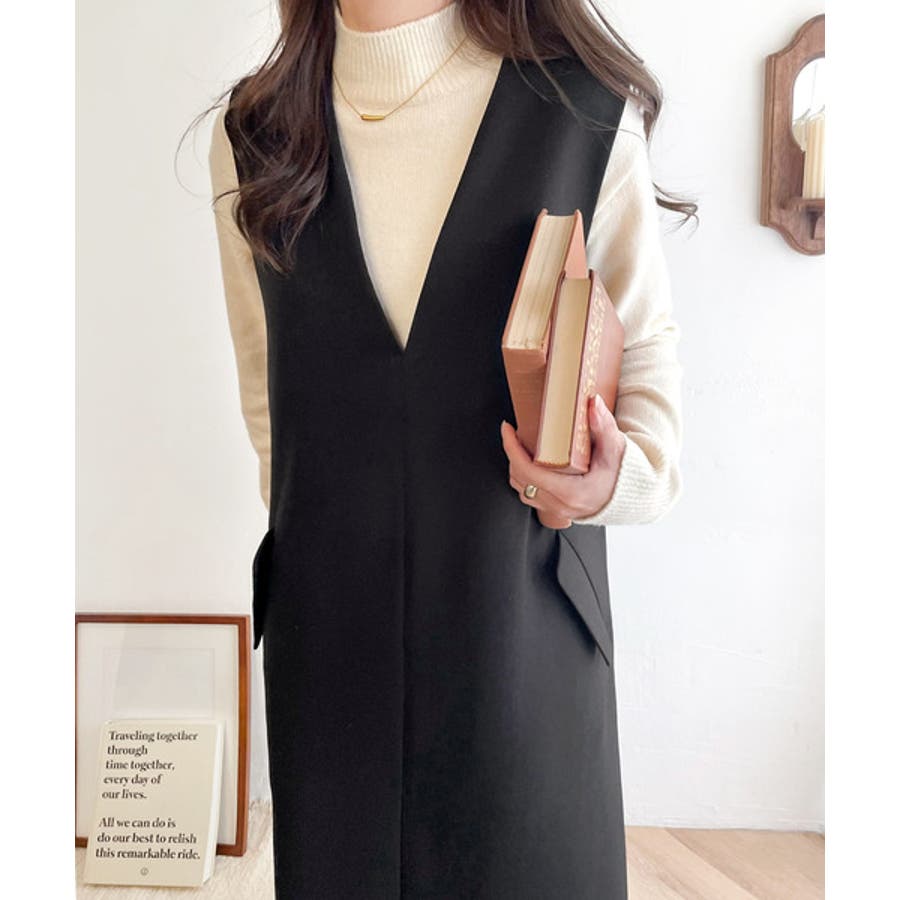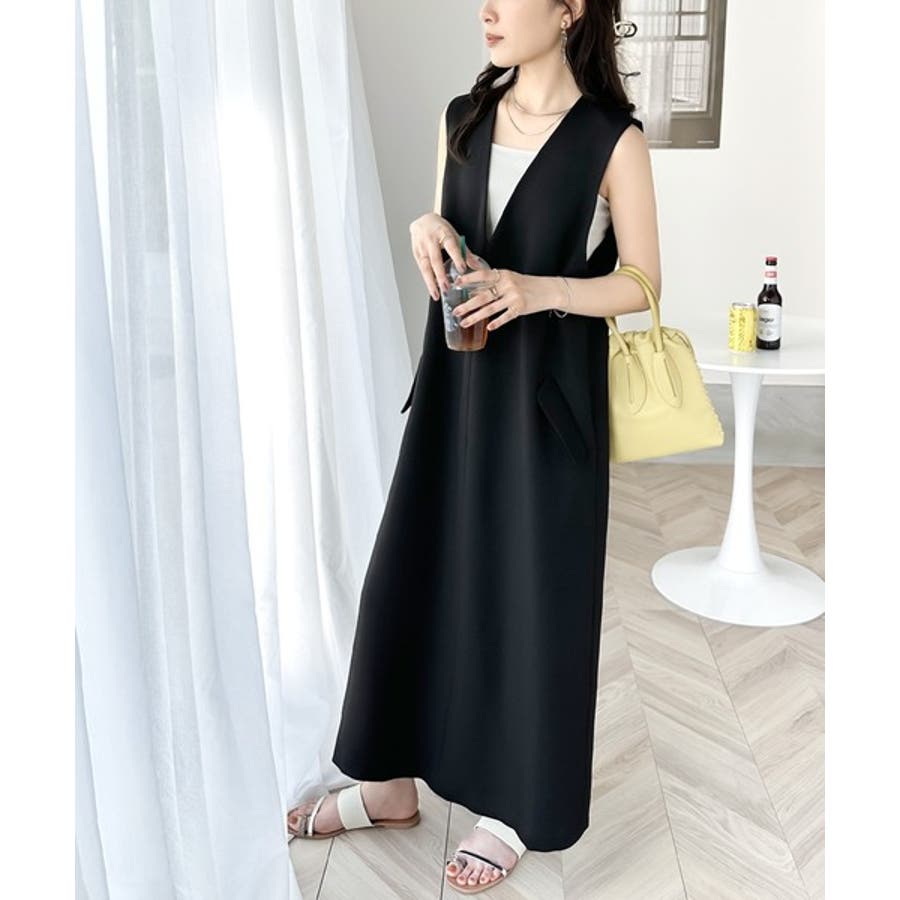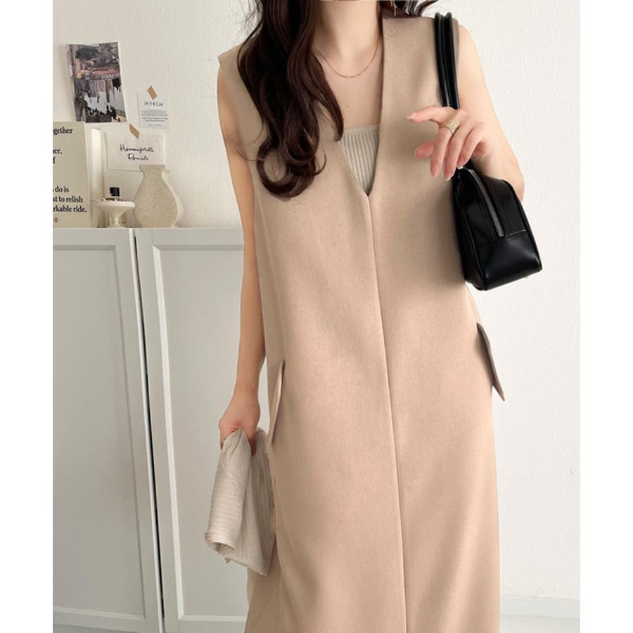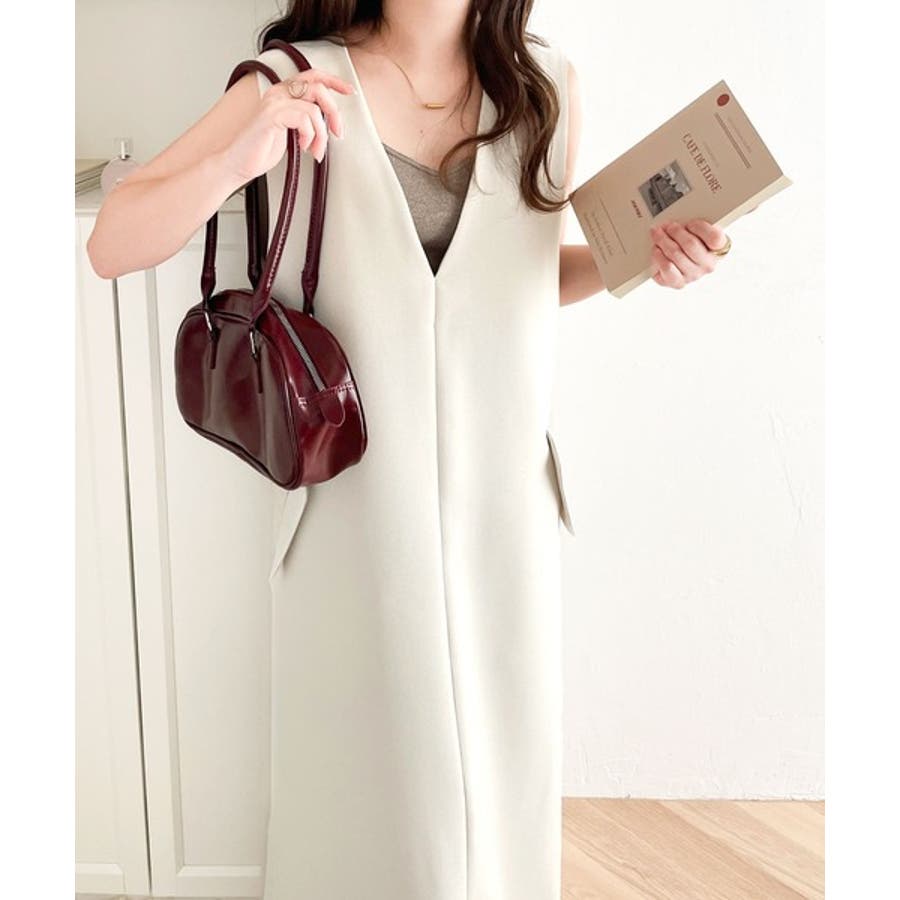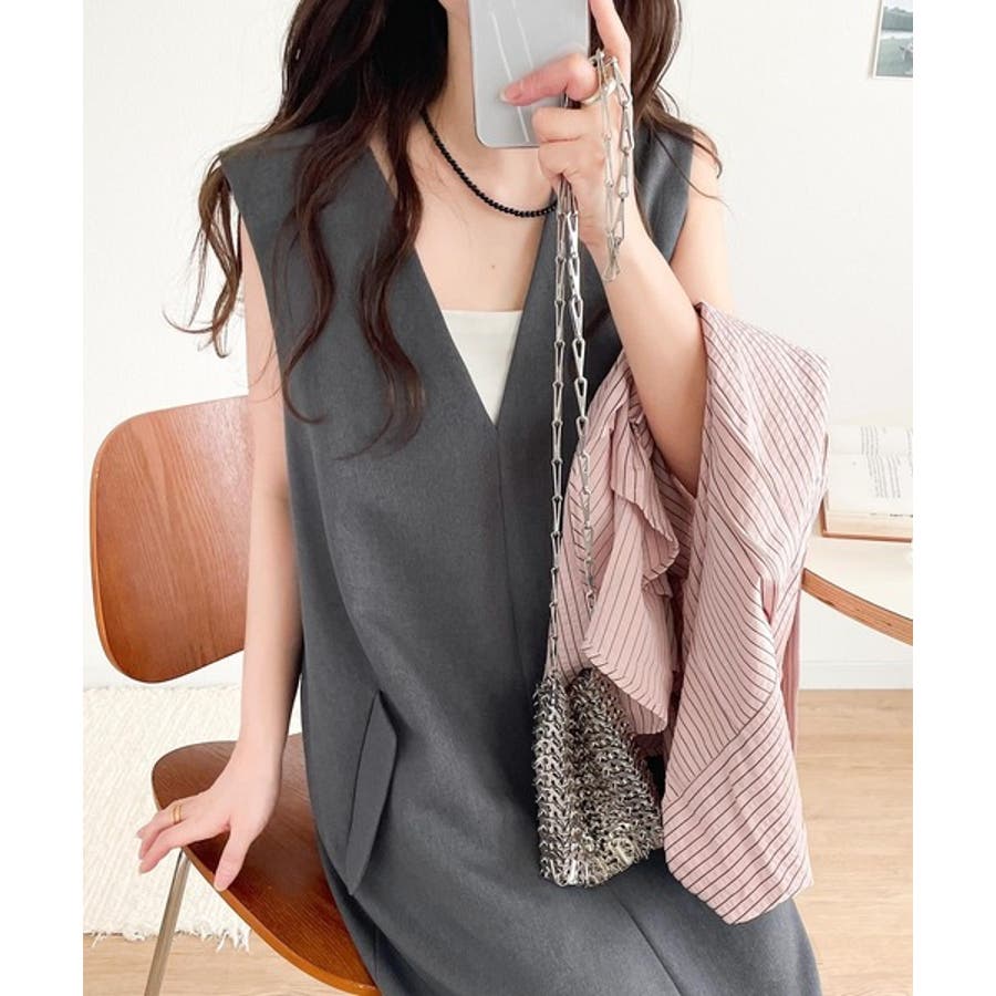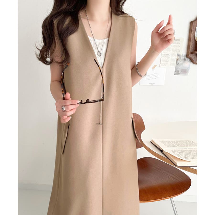 シンプルなデザインながらもフロントのVネックとフラップポケットがアクセントのワンピース。