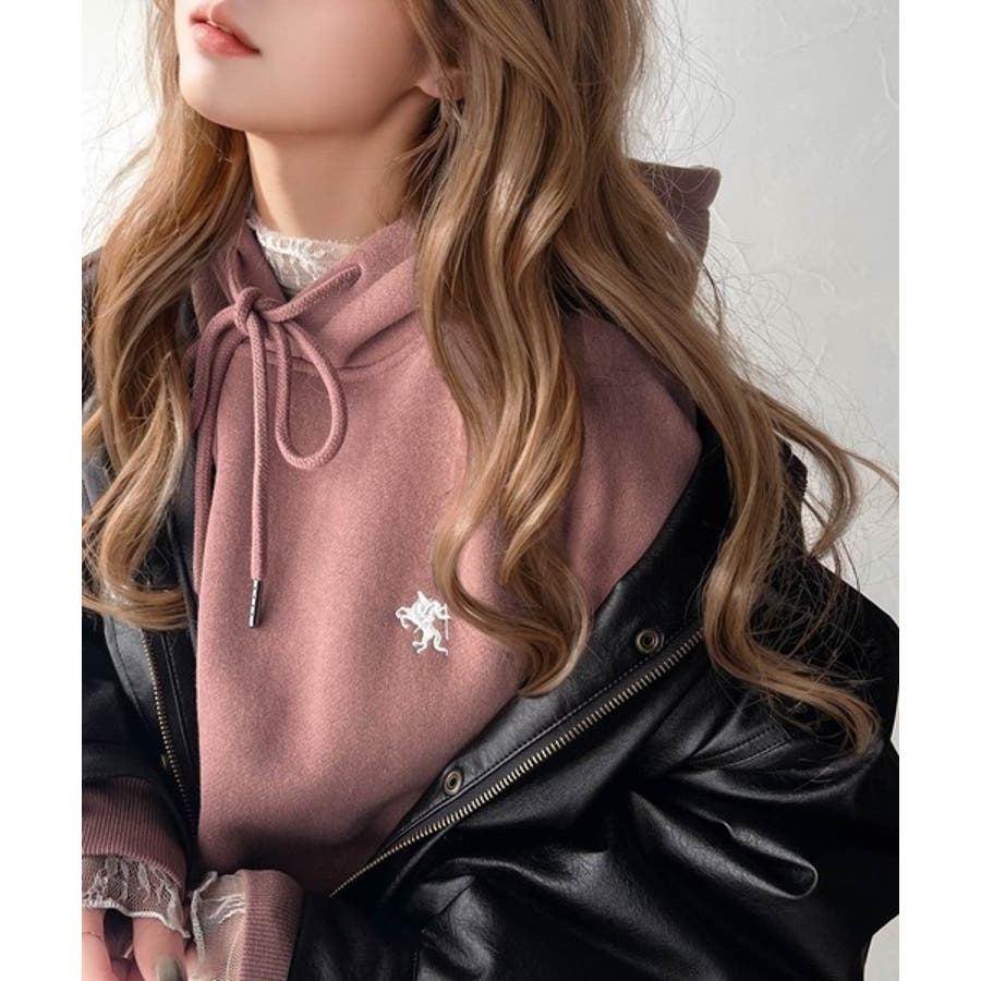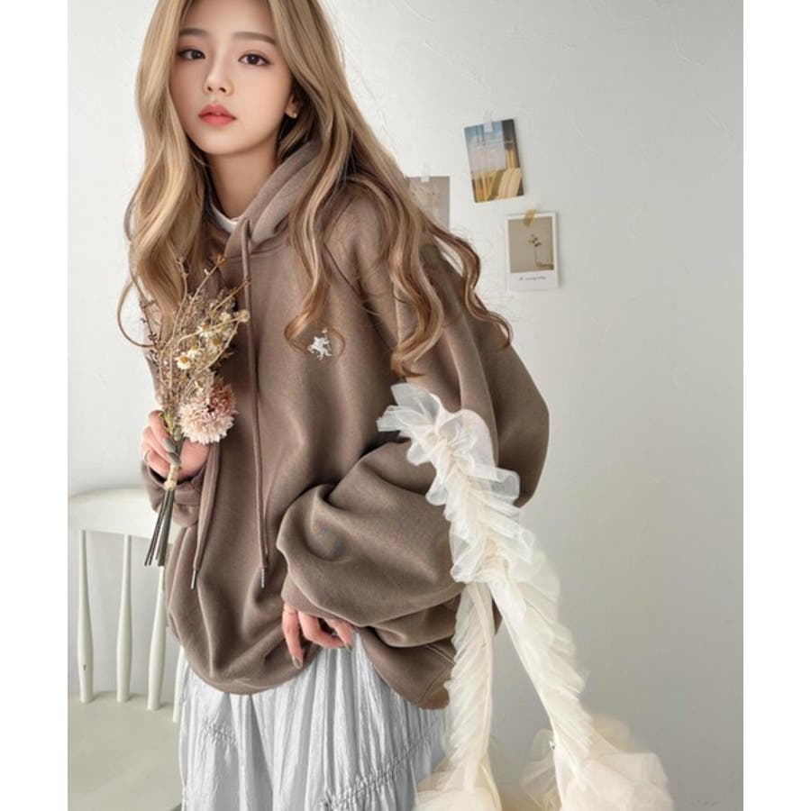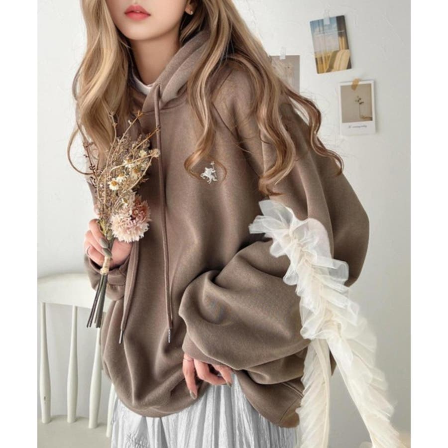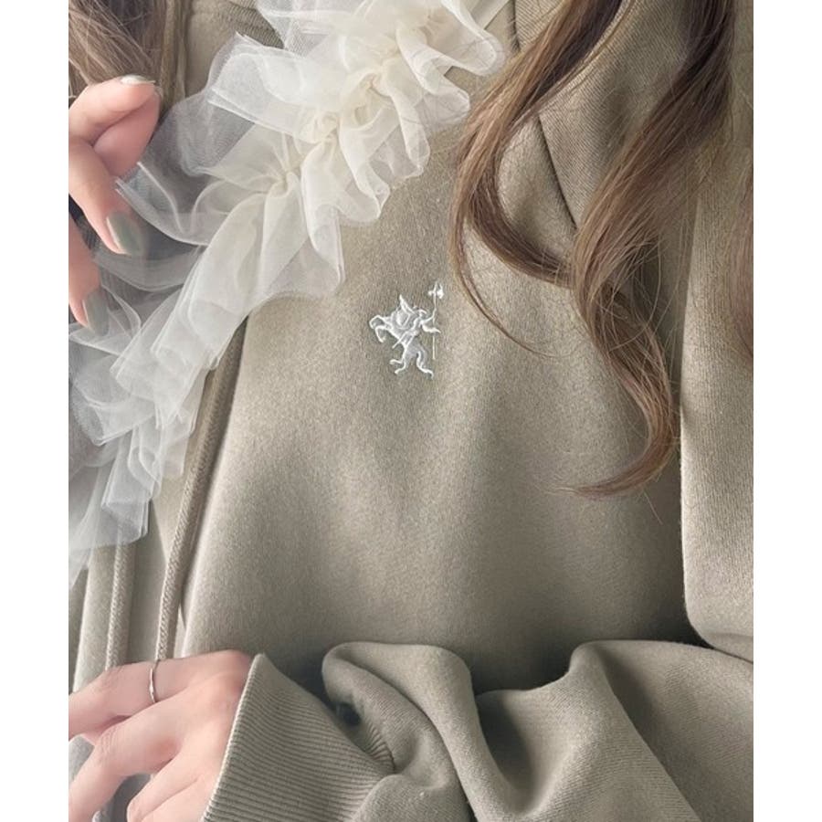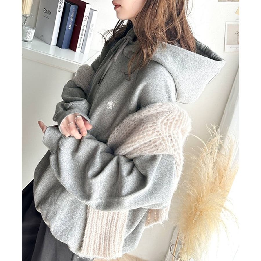 袖のボリューム感や胸の刺繍、長めのフード紐などこだわりポイントが満載。