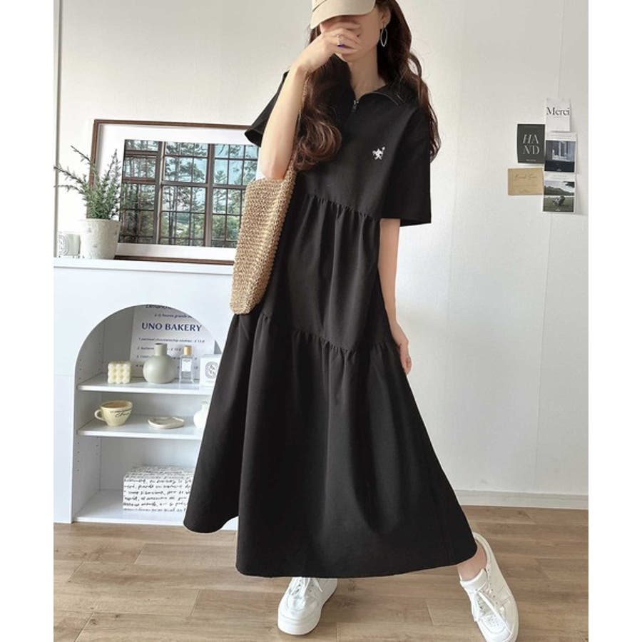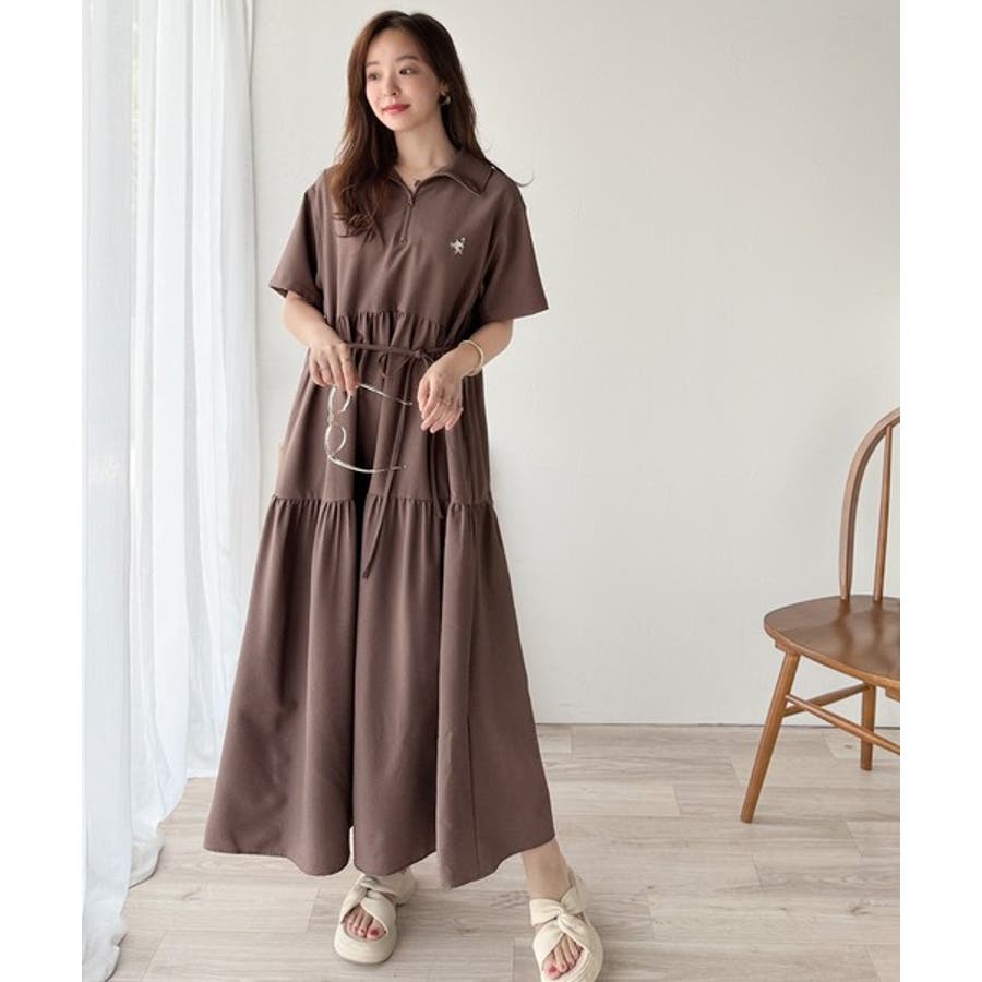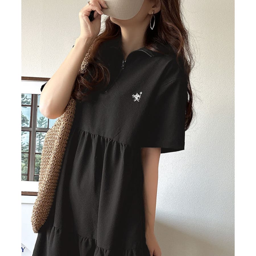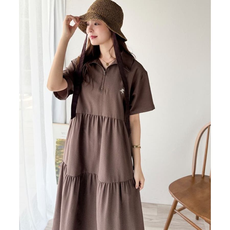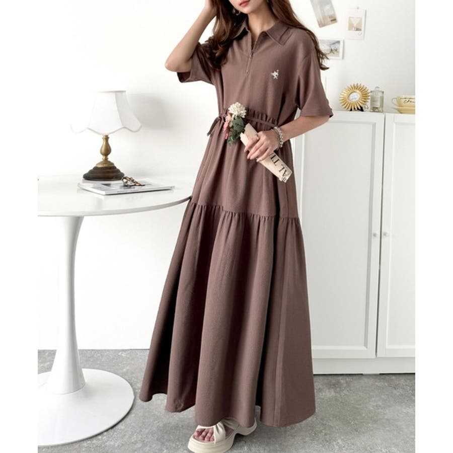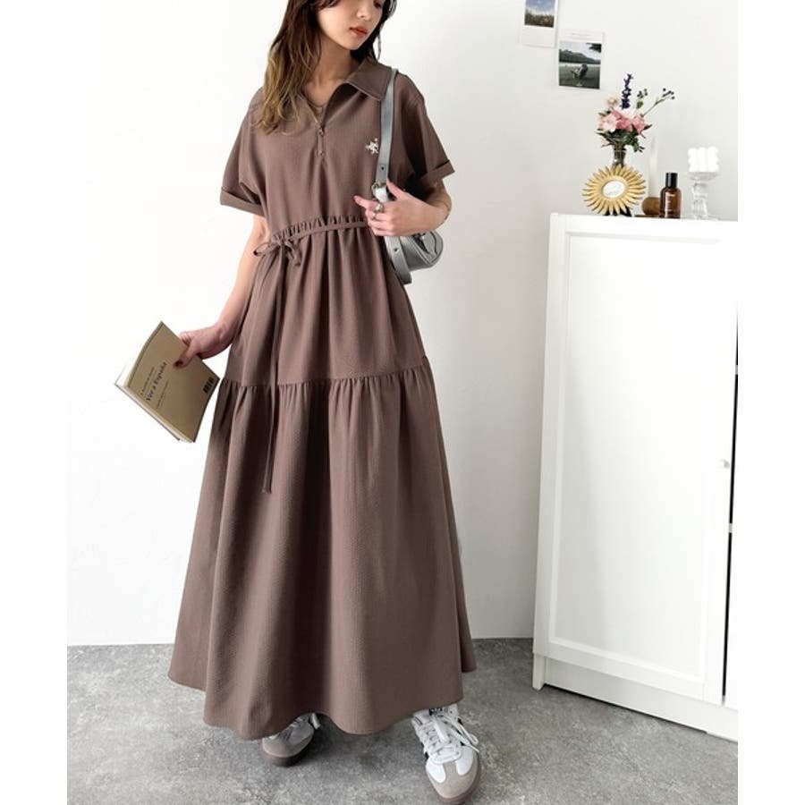 トレンドのティアード♪胸刺繍サッカーハーフZIPワンピース(ロング)