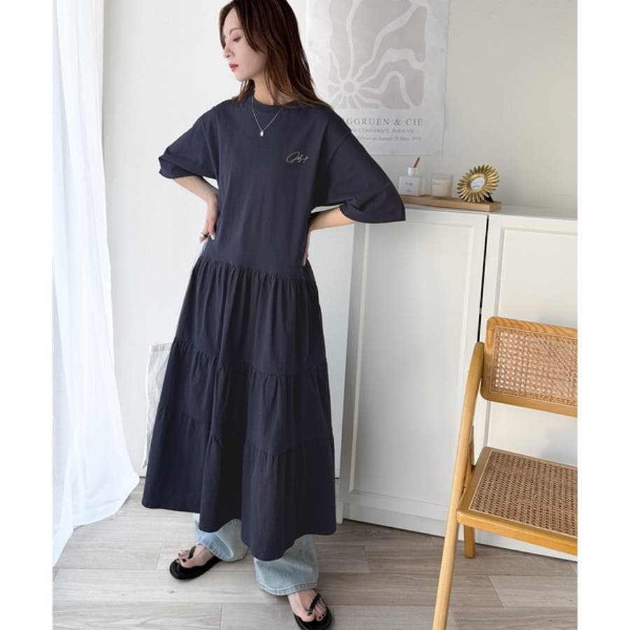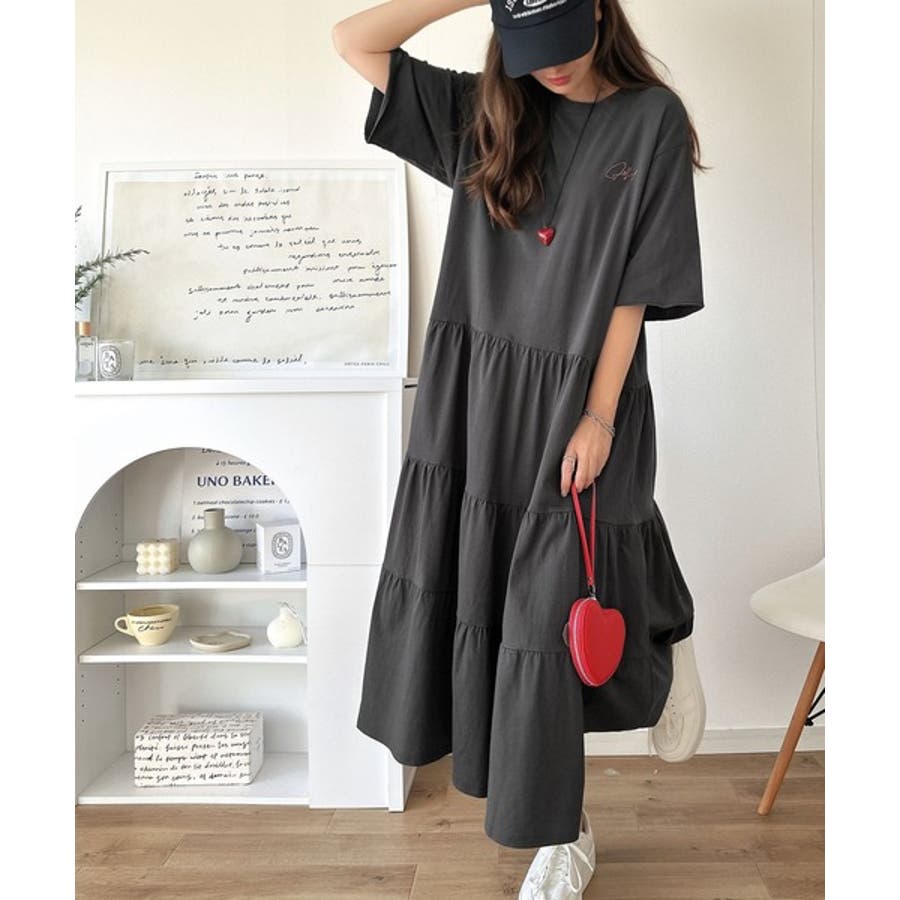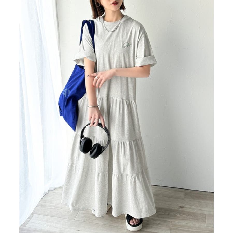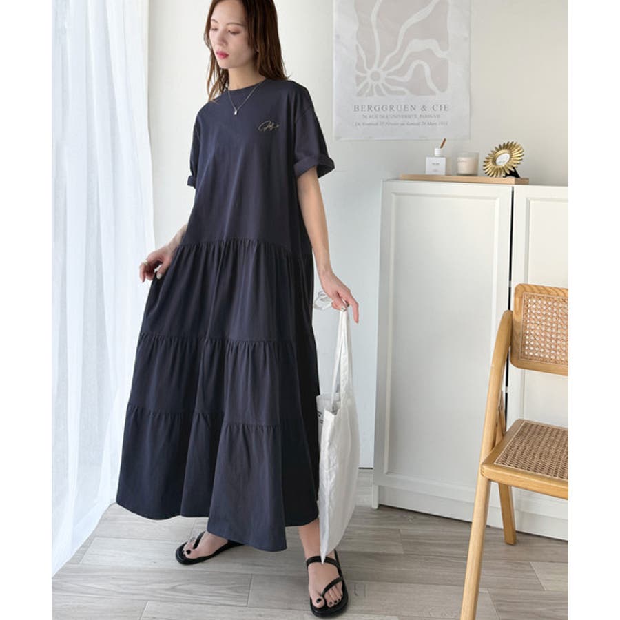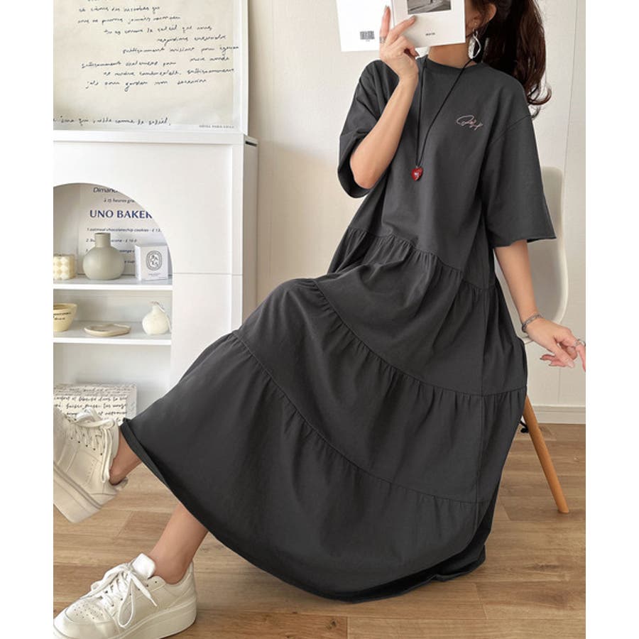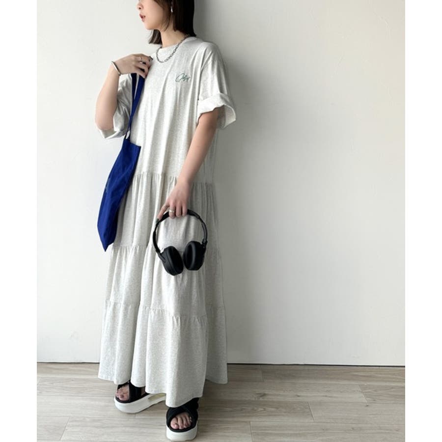やさしい着心地◎綿100%バックロゴプリントティアードワンピース(ロング丈)