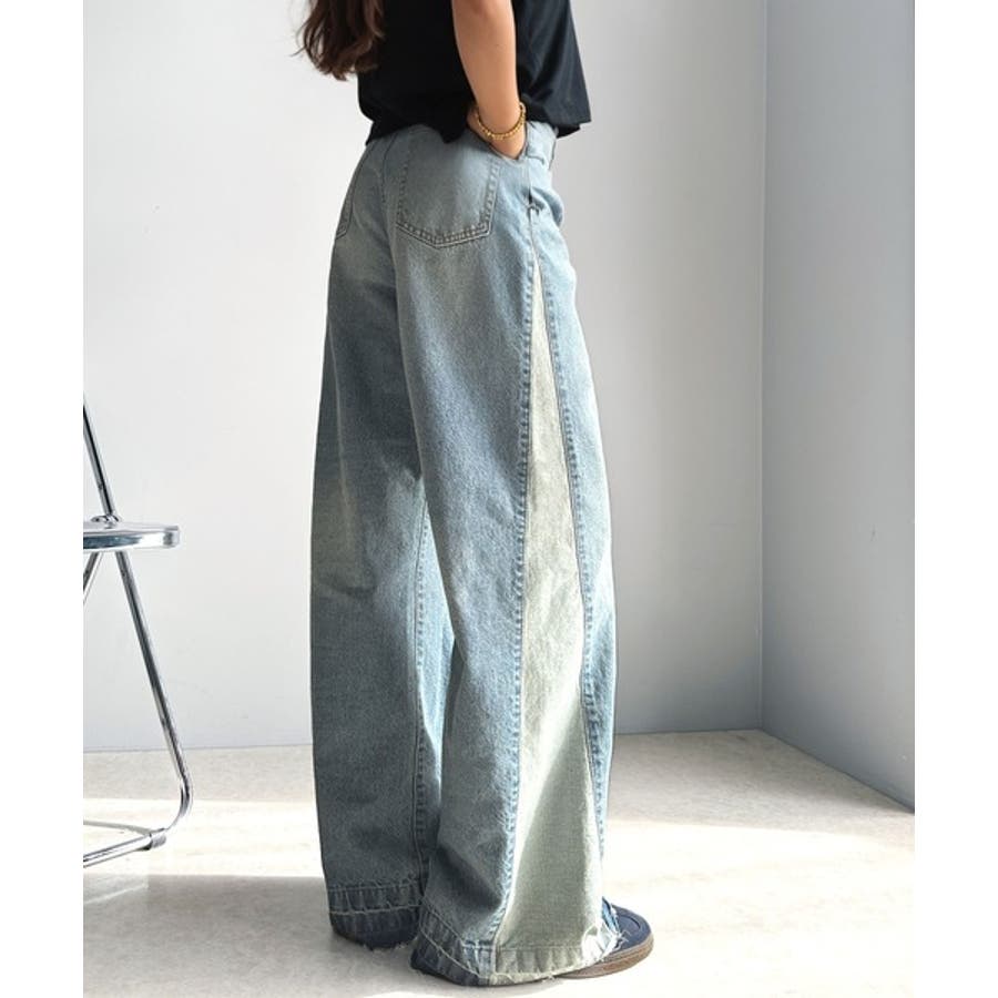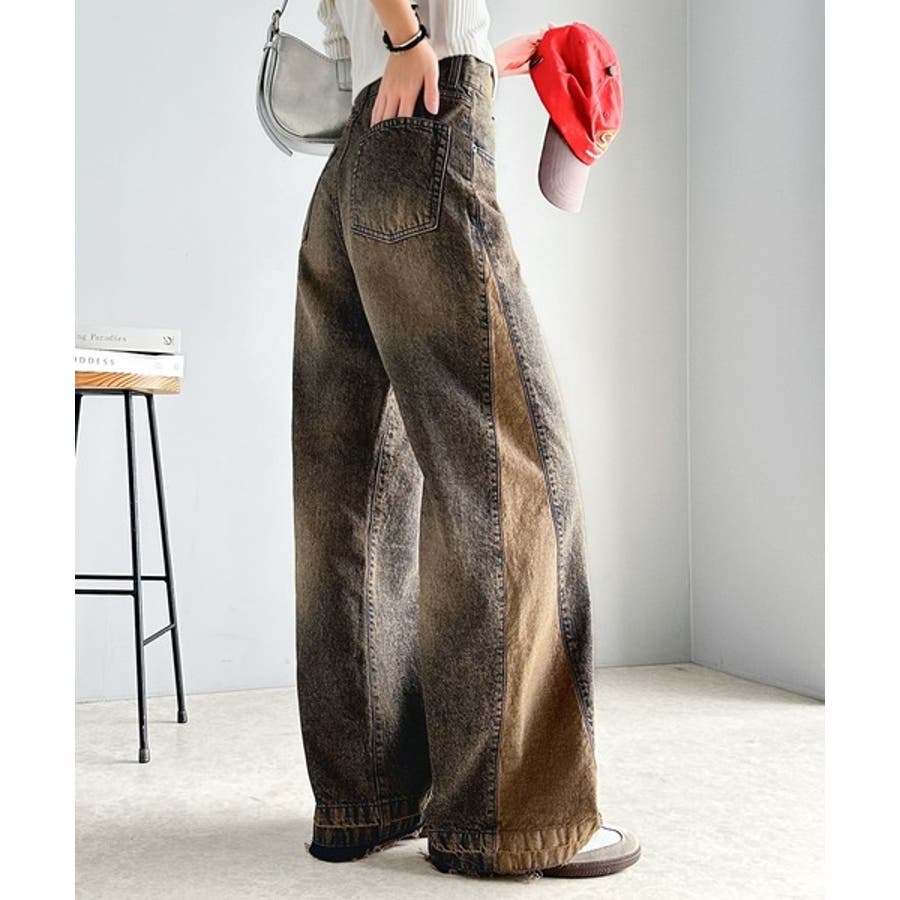 環境に優しいサステナブル素材。綿100%サイド切替ハイウエストワイドストレートデ…