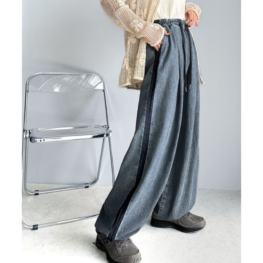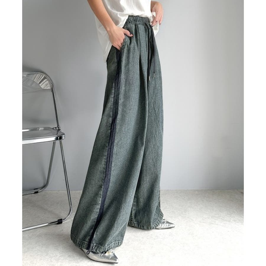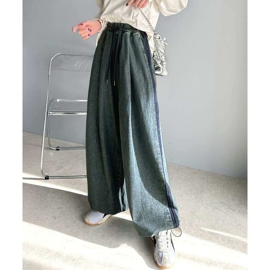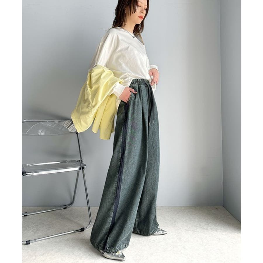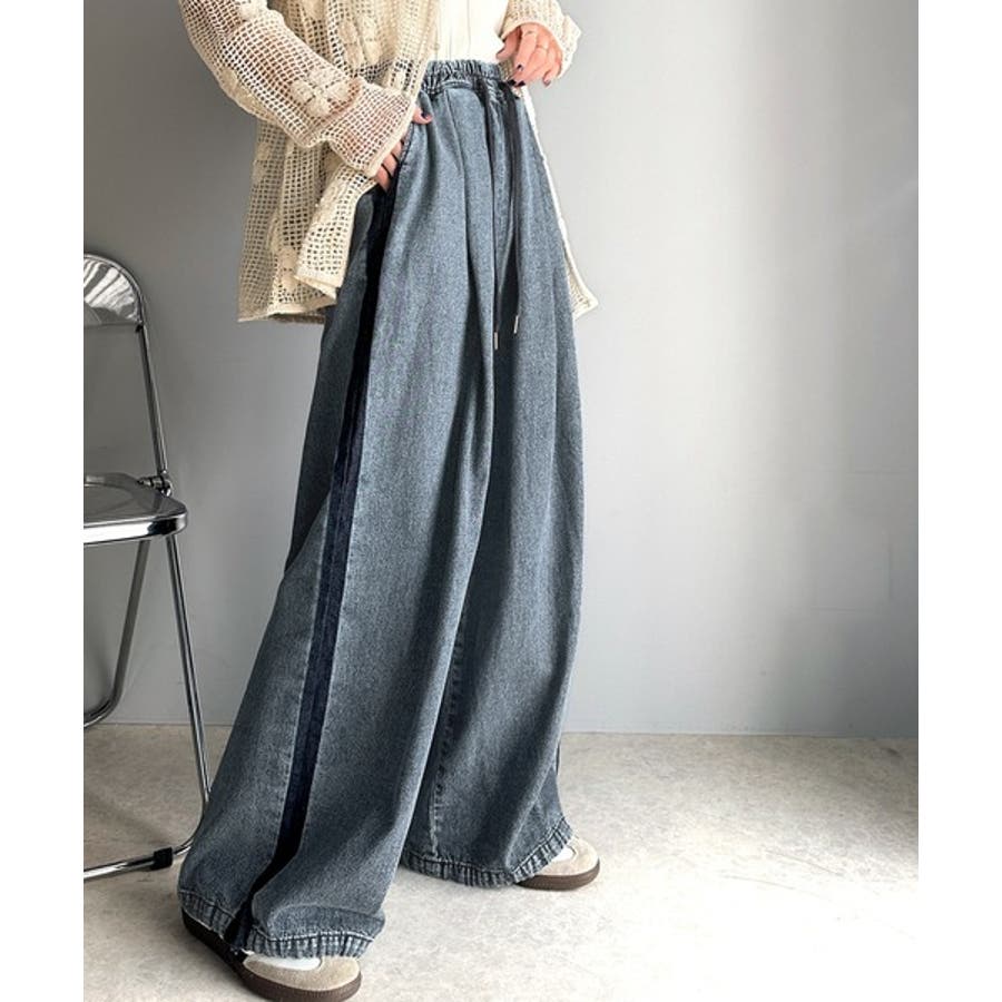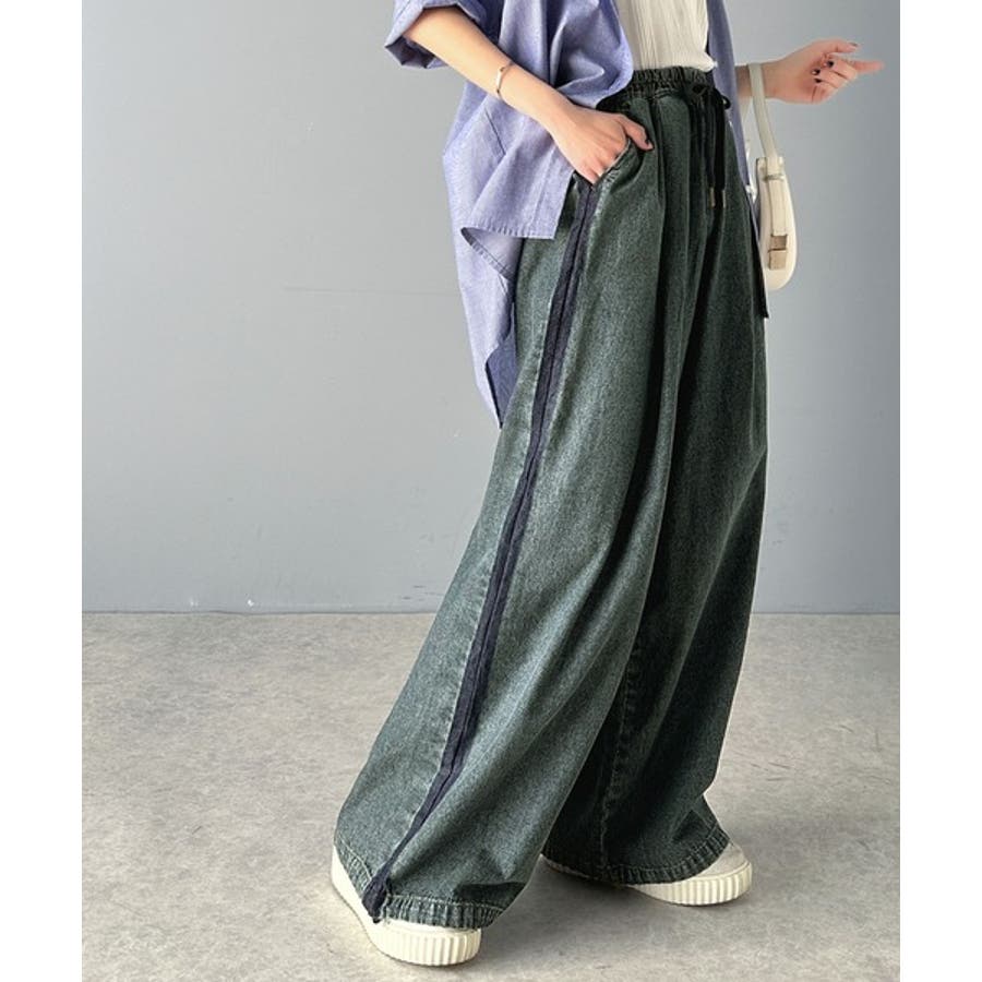 環境に優しいサステナブル素材。綿100%デニム素材サイドラインワイドイージーパン…