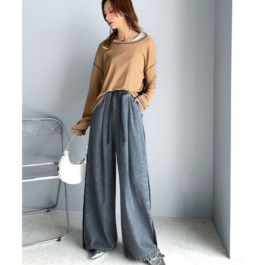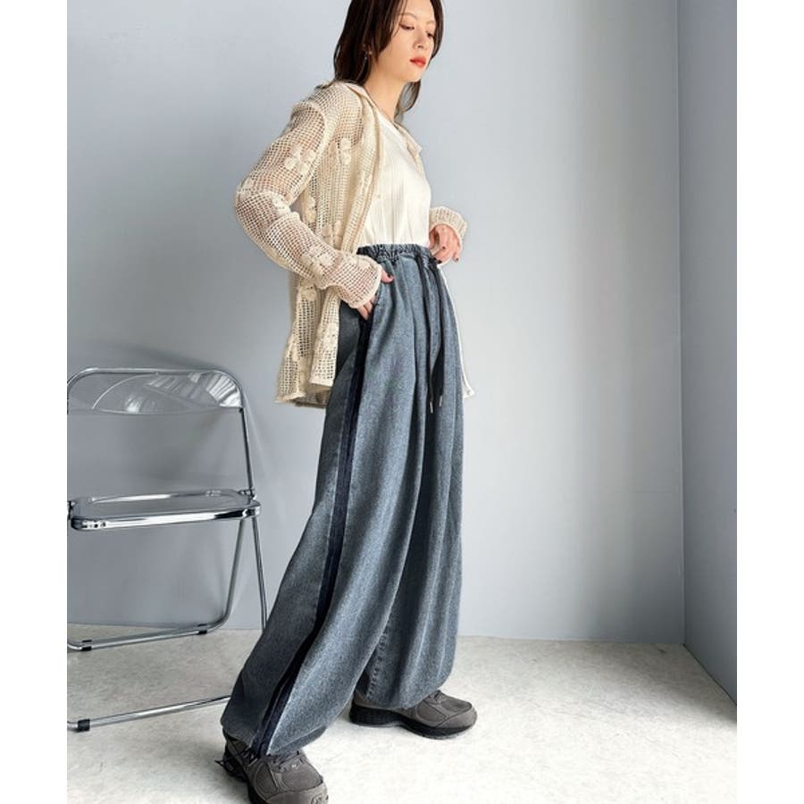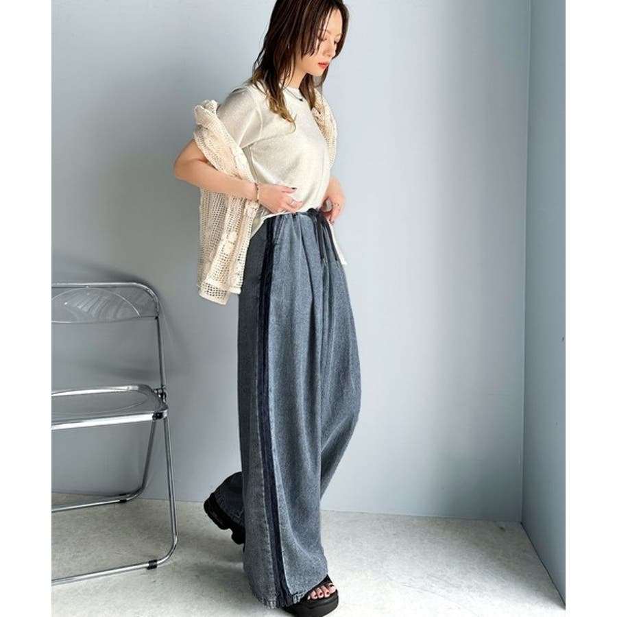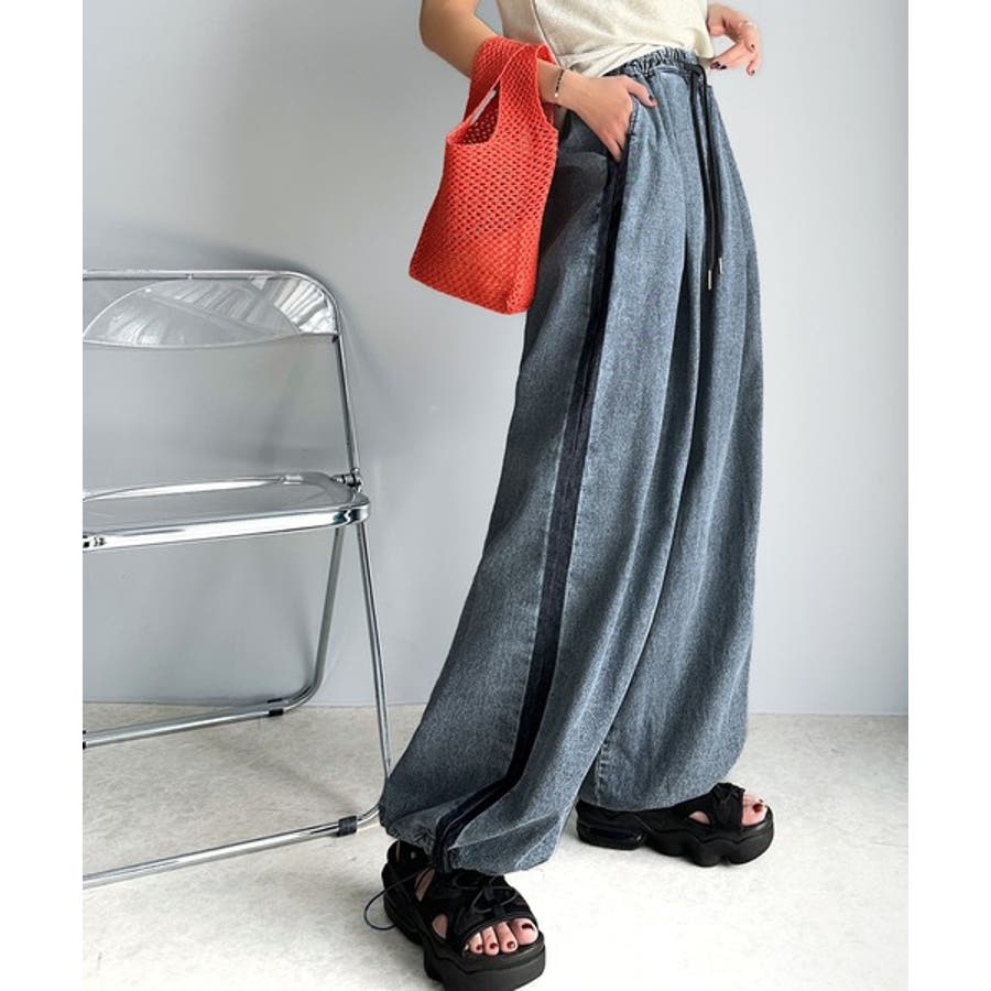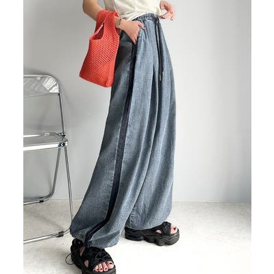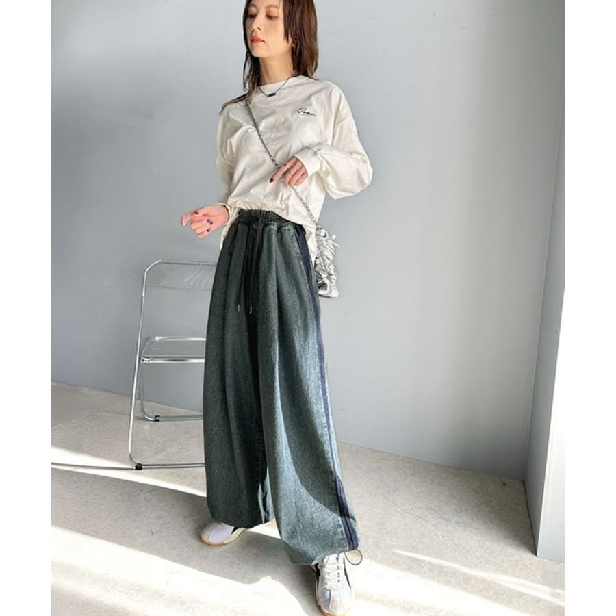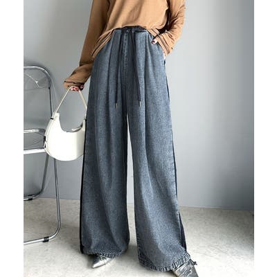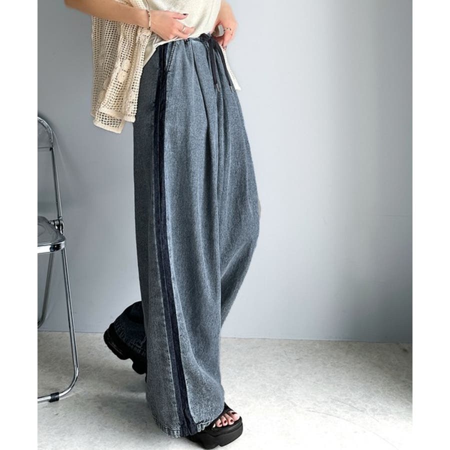 環境に優しいサステナブル素材。綿100%デニム素材サイドラインワイドイージーパン…