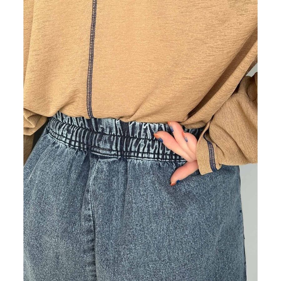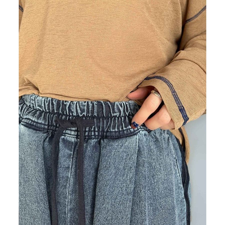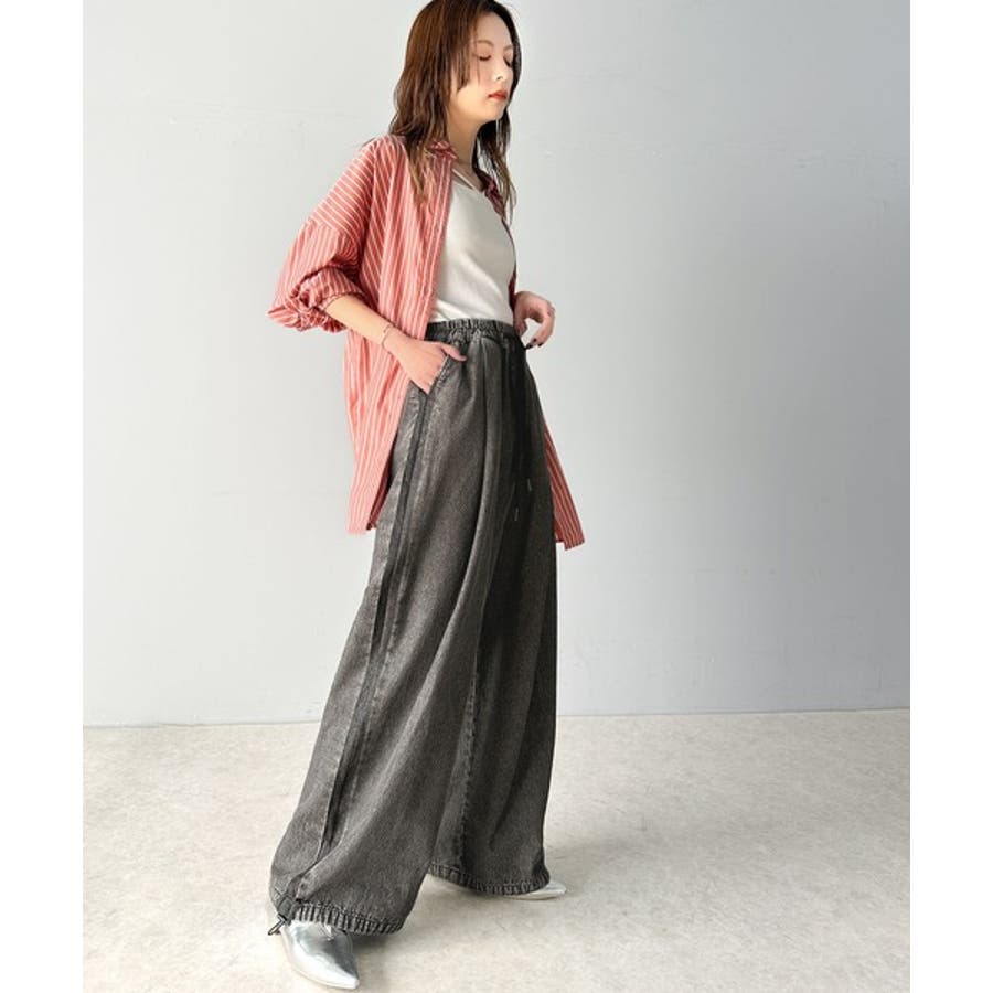 身体のラインを拾わない絶妙なシルエットで、ウエストはゴムと紐の仕様なので快適かつストレスフリー。