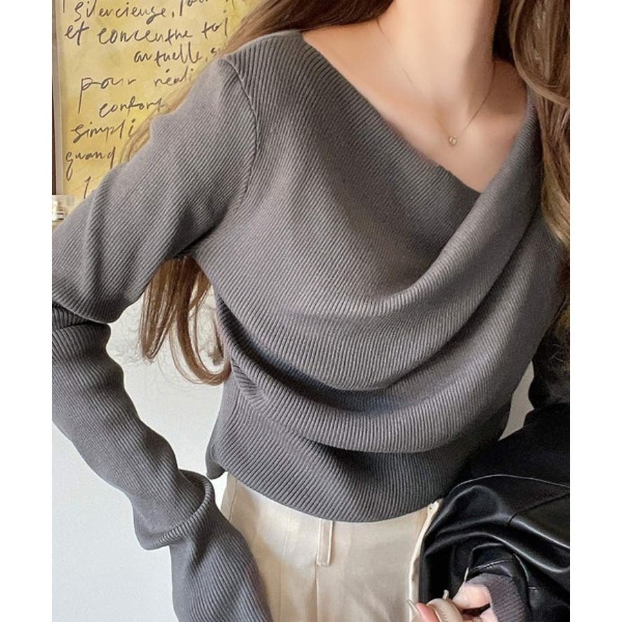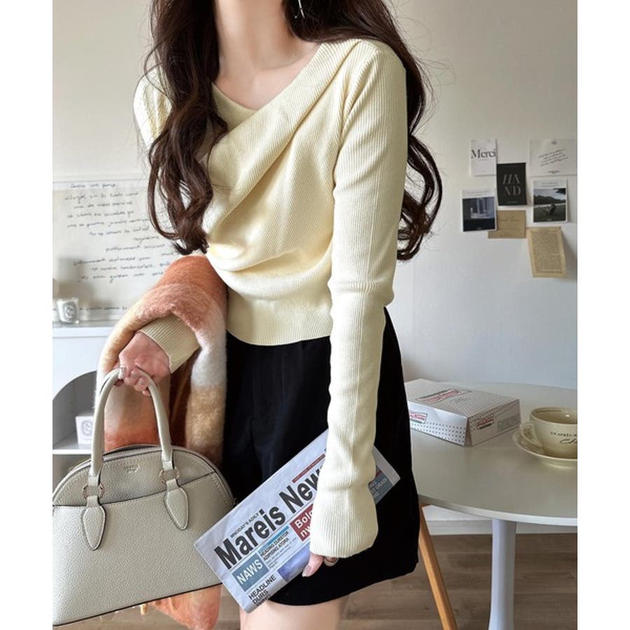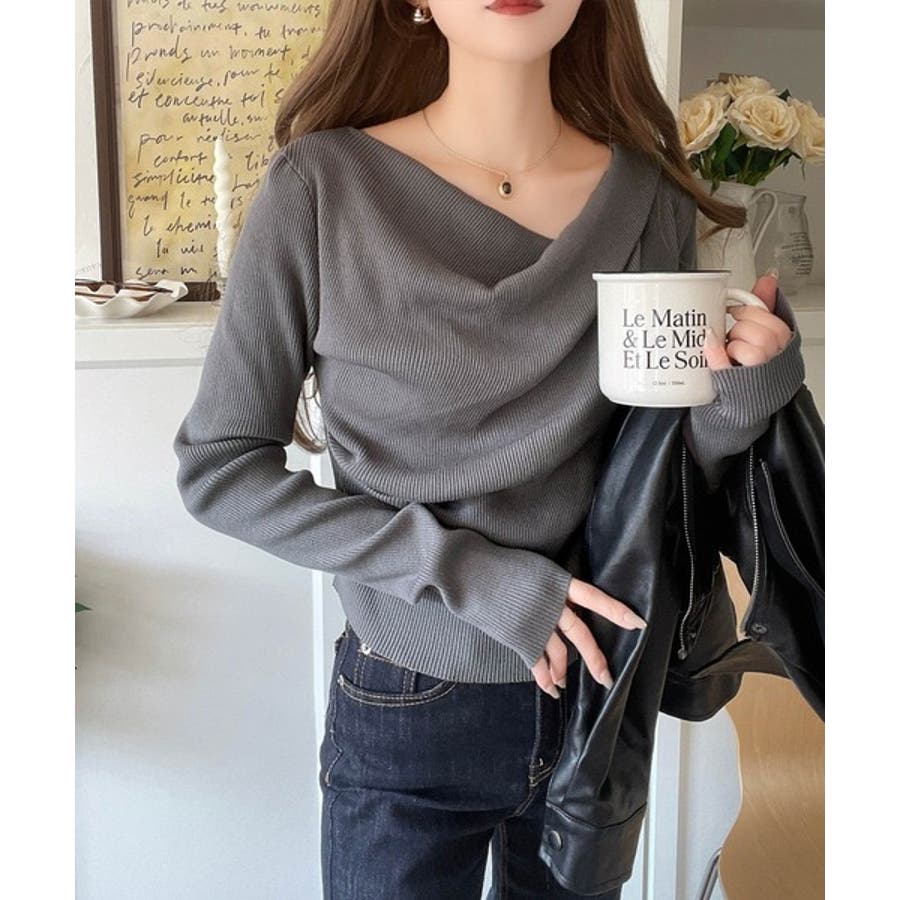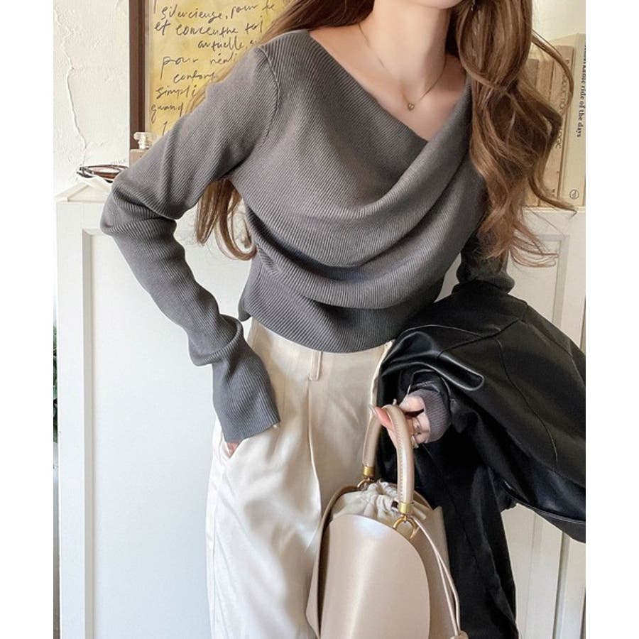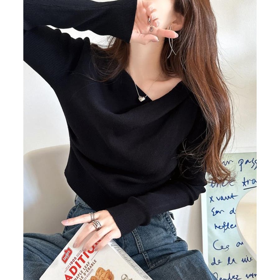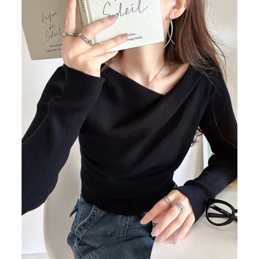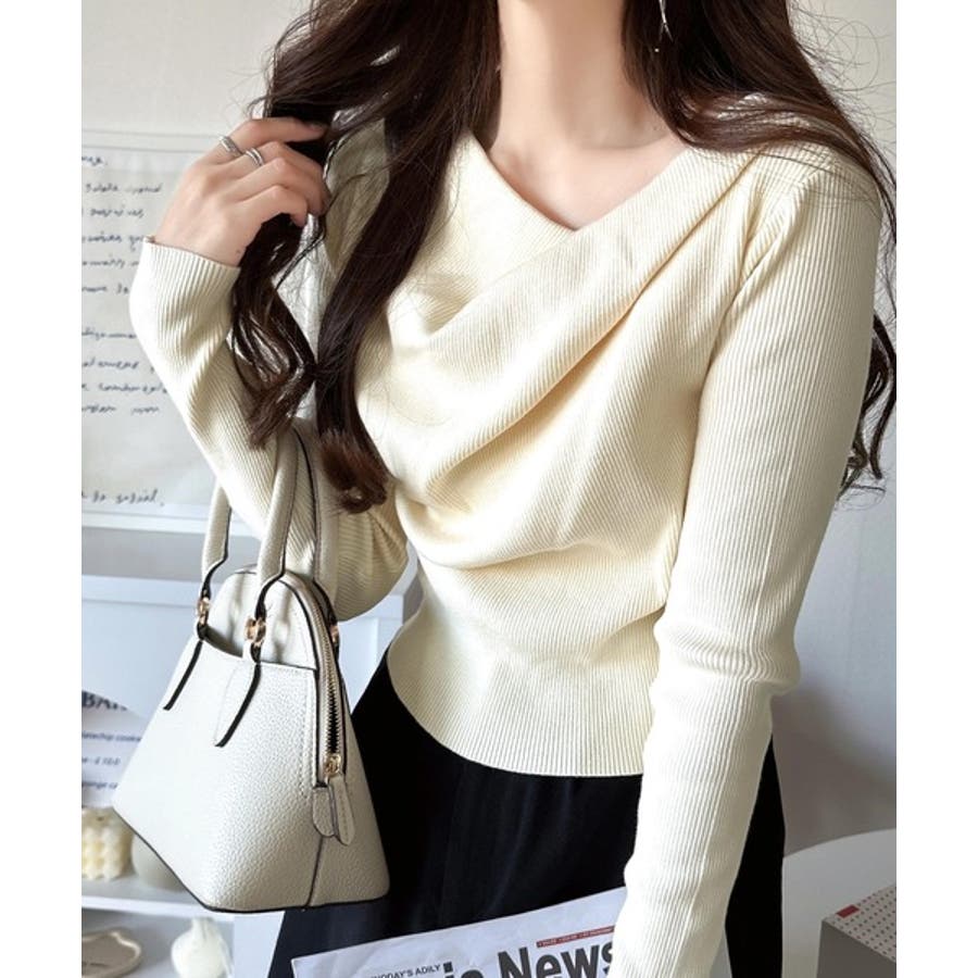 トレンド美スタイルで華奢魅せに。胸元ドレープデザインニット