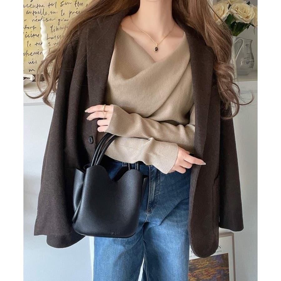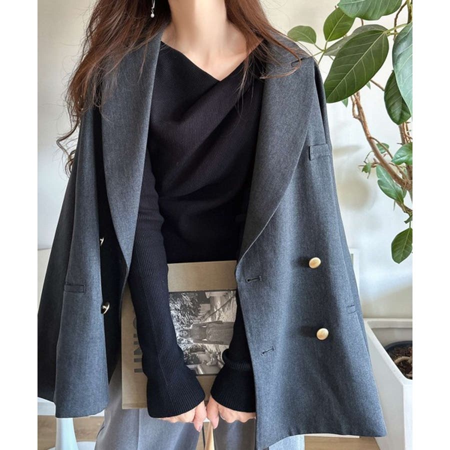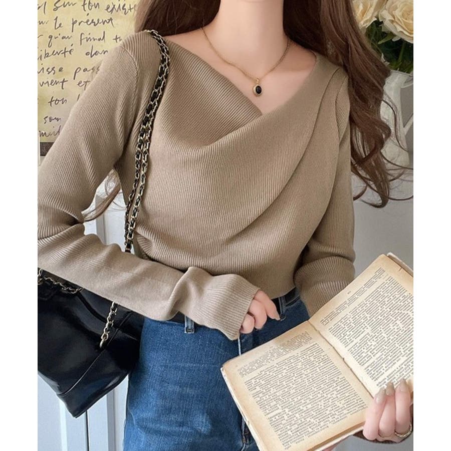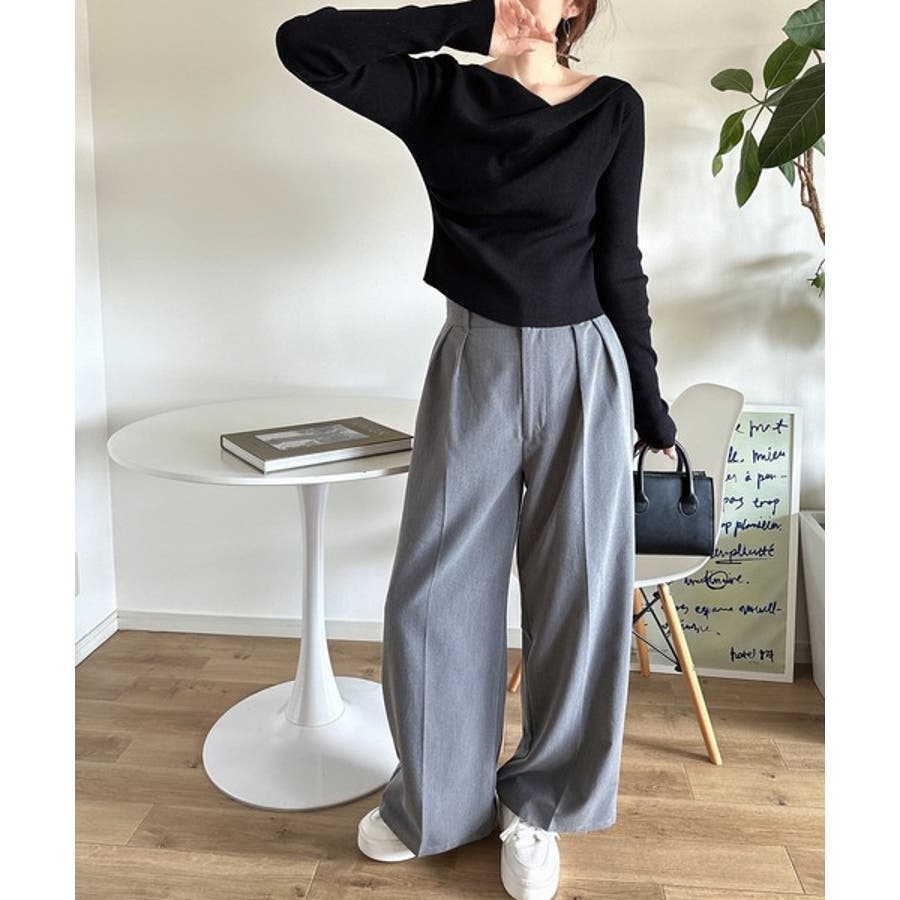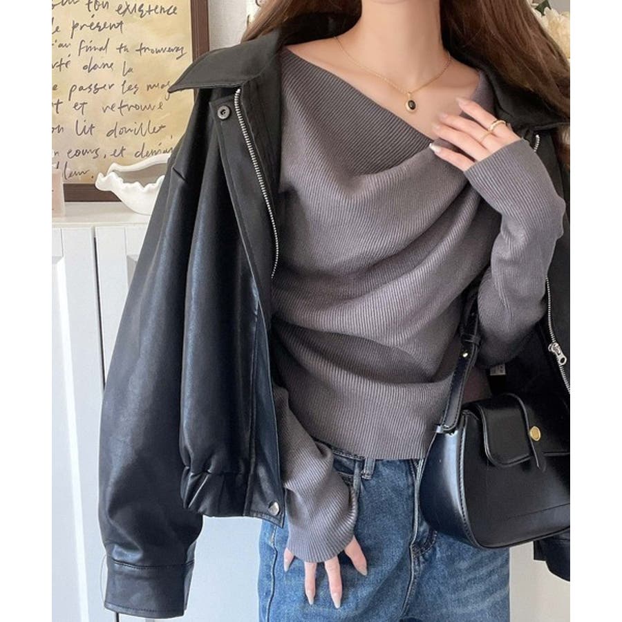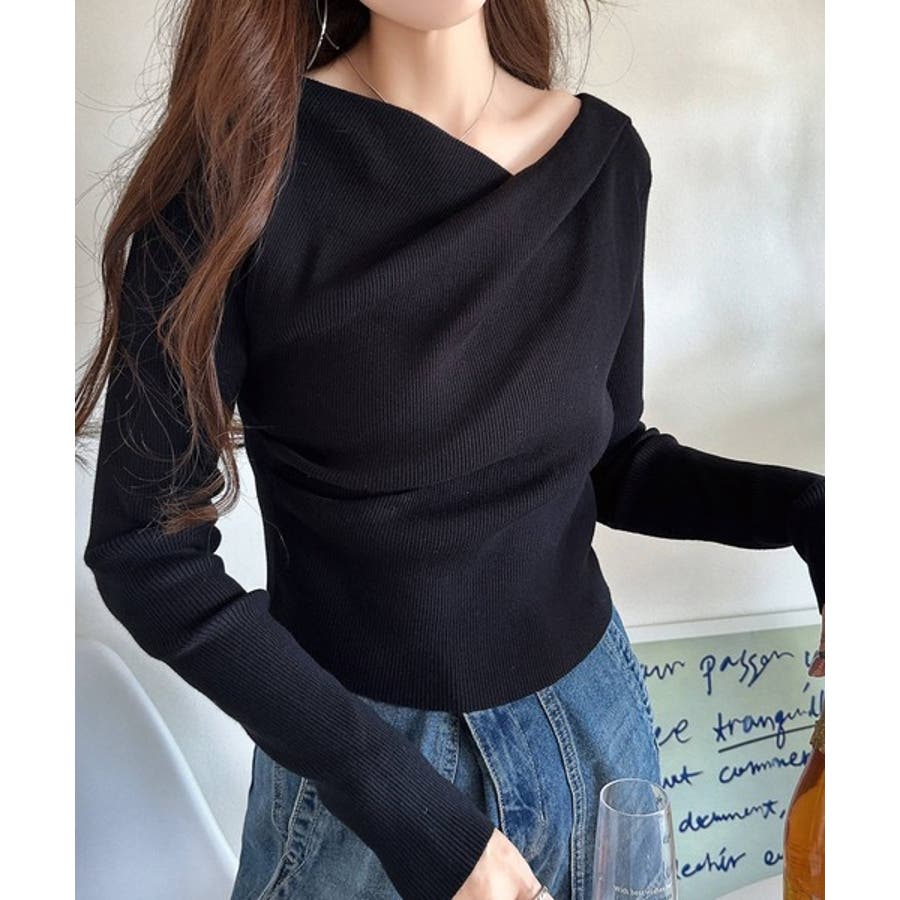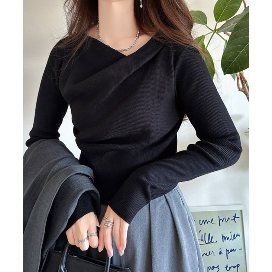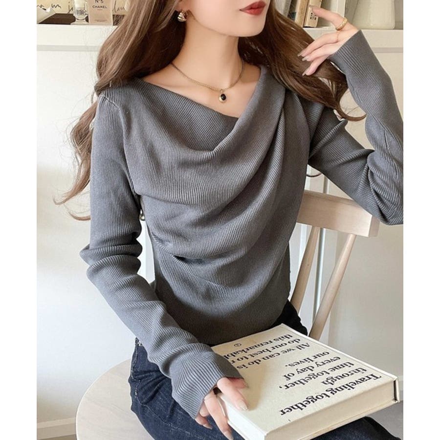 トレンド美スタイルで華奢魅せに。胸元ドレープデザインニット