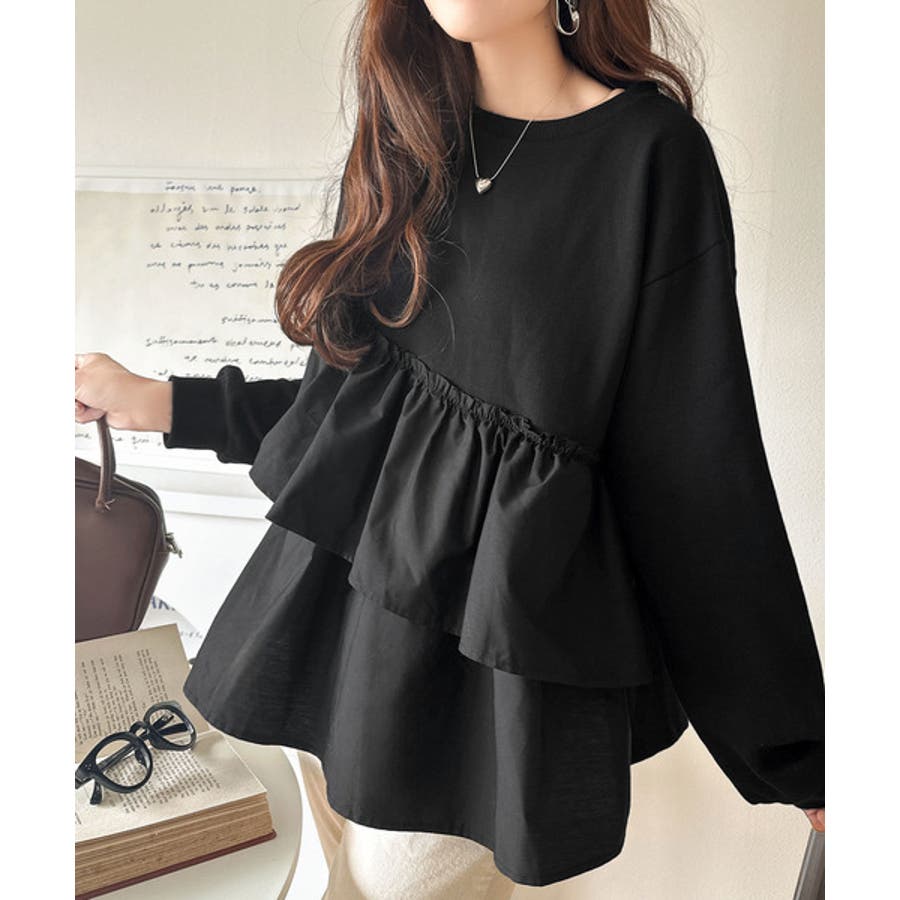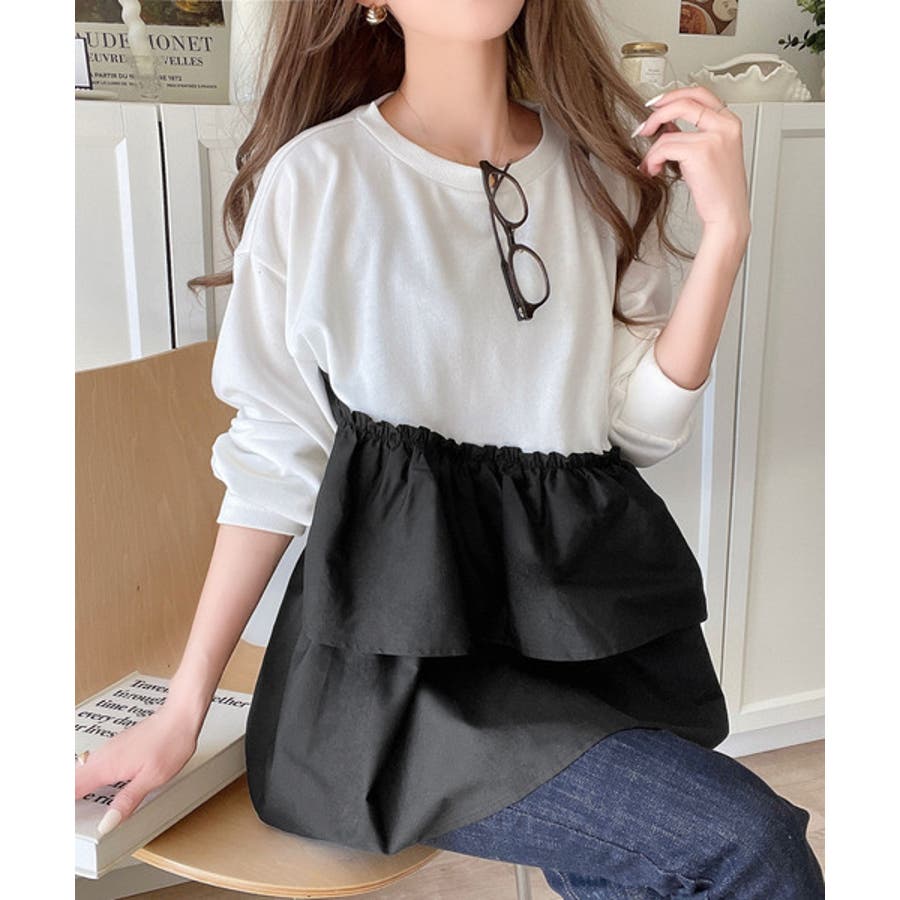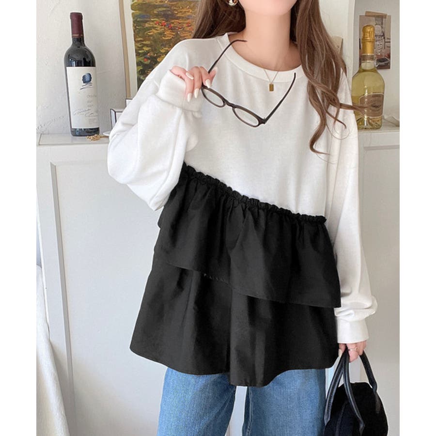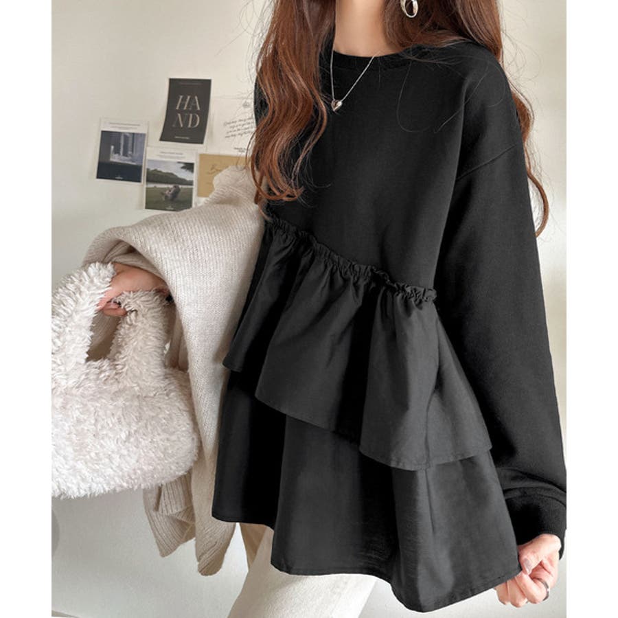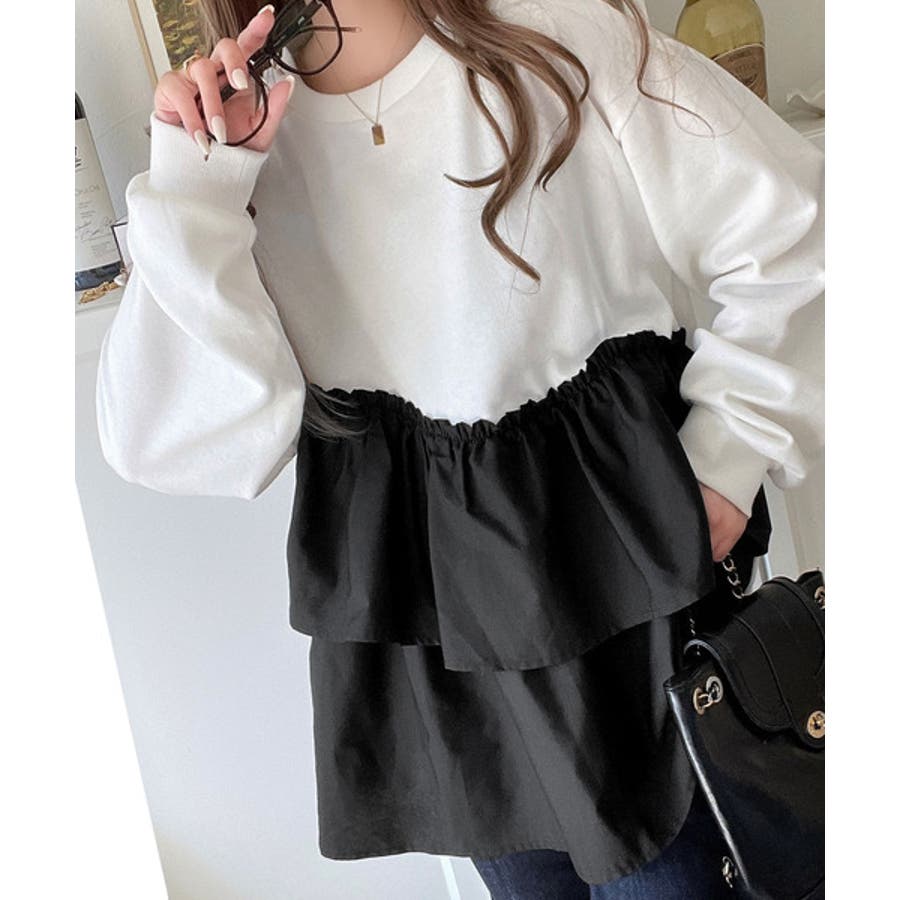 今年注目のトレンドアイテム!アシンメトリー異素材切替ティアードフリル裏毛トップス…