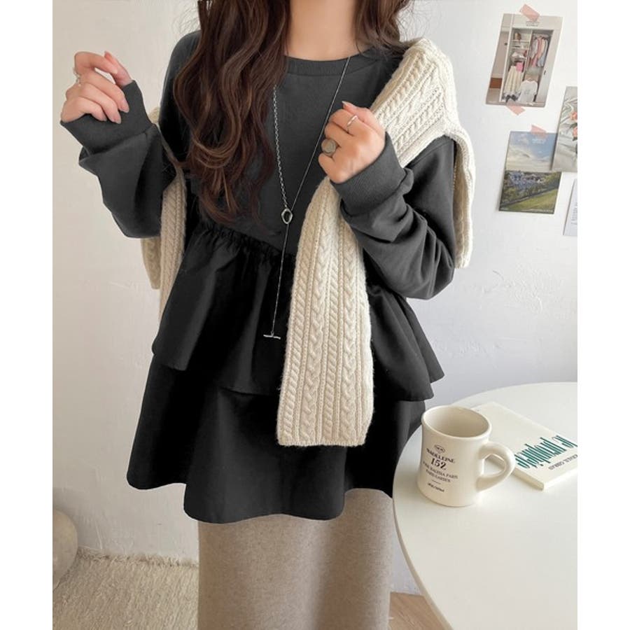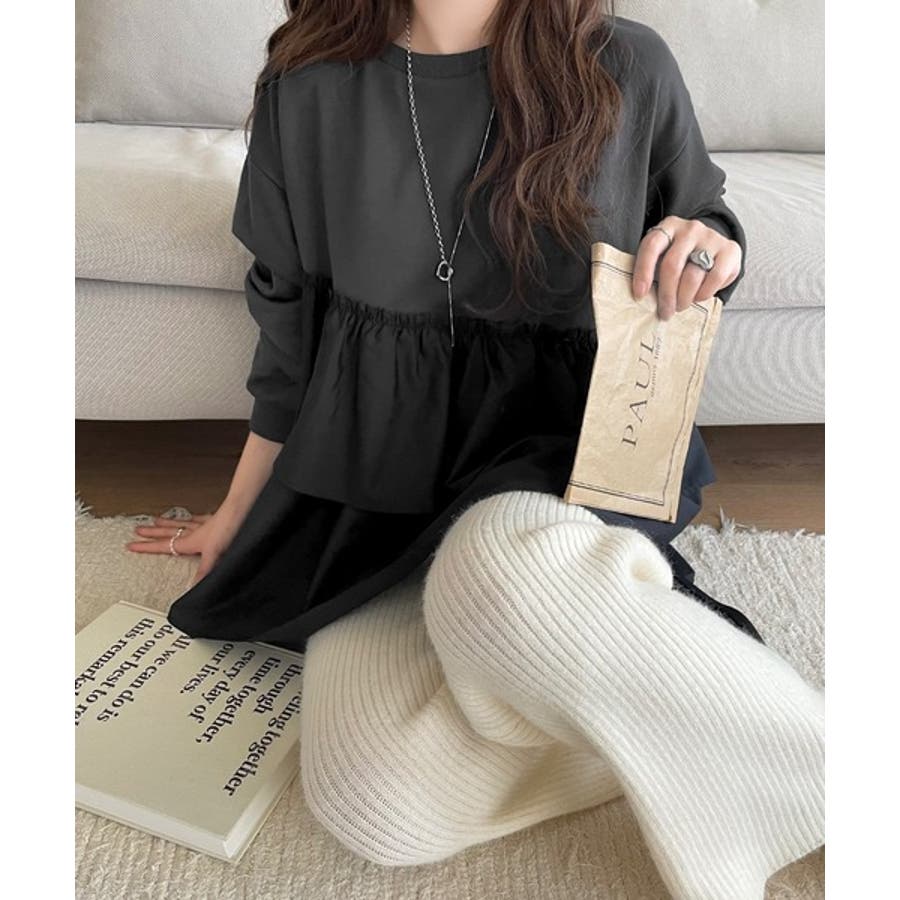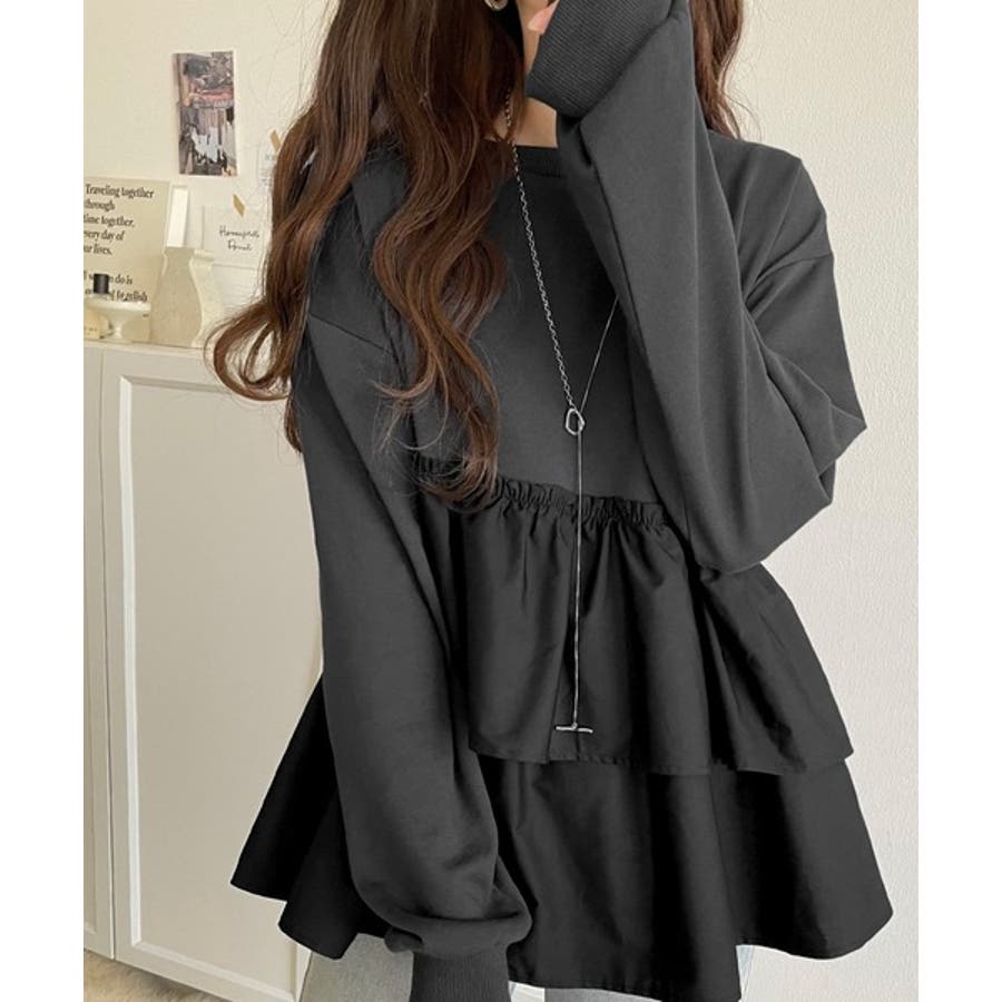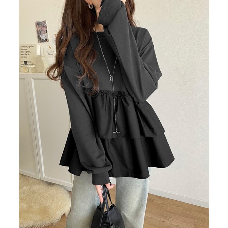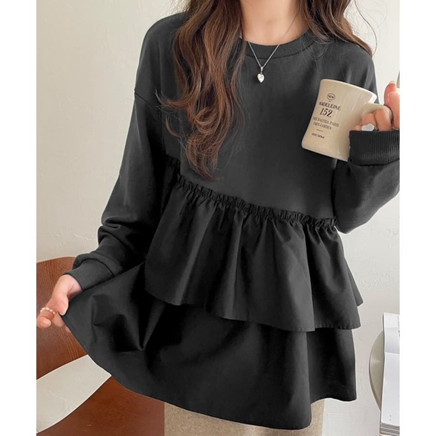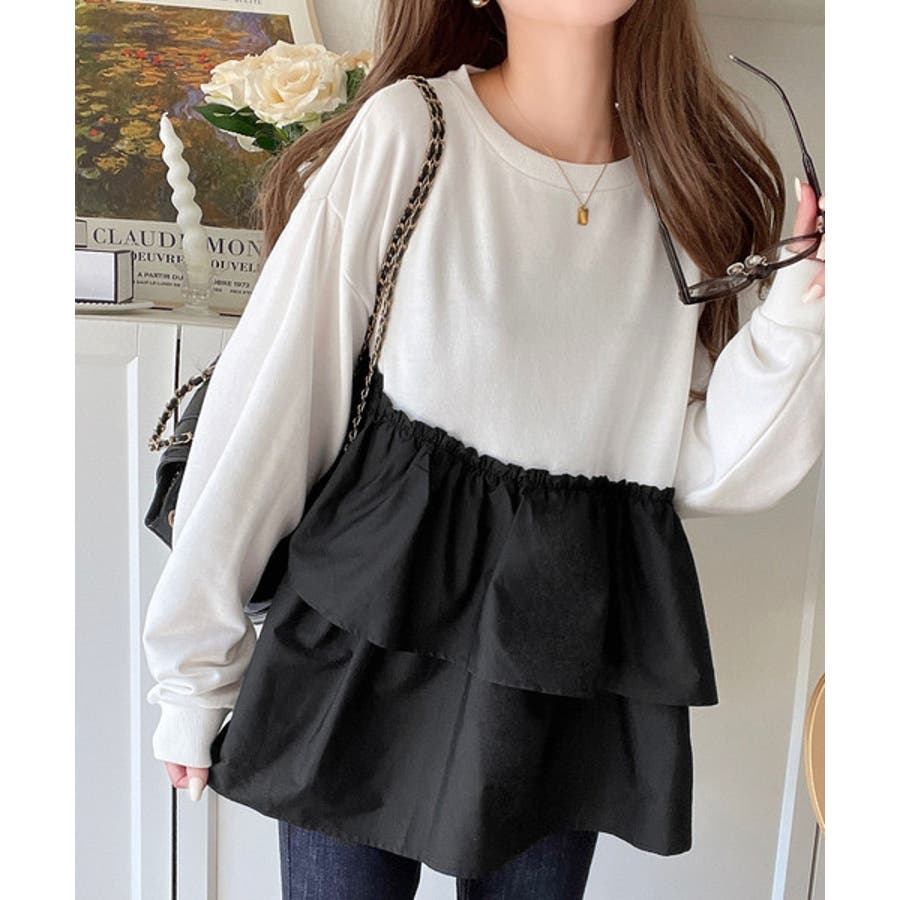 今年注目のトレンドアイテム!アシンメトリー異素材切替ティアードフリル裏毛トップス…