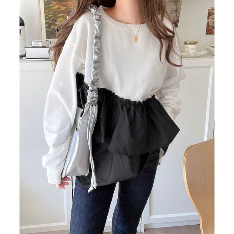 異素材フリルが甘くなり過ぎず、アシメのディティールがお洒落さん見えに。