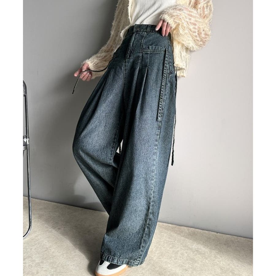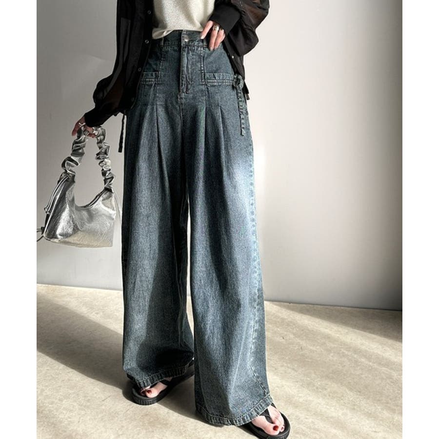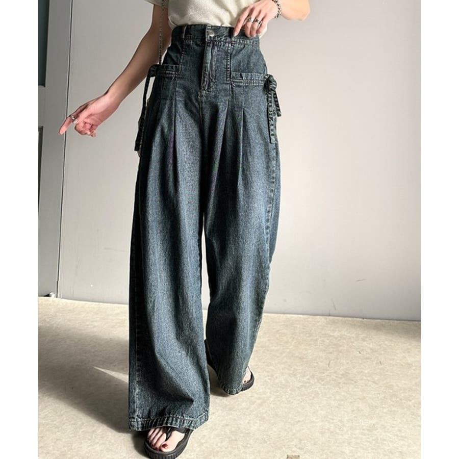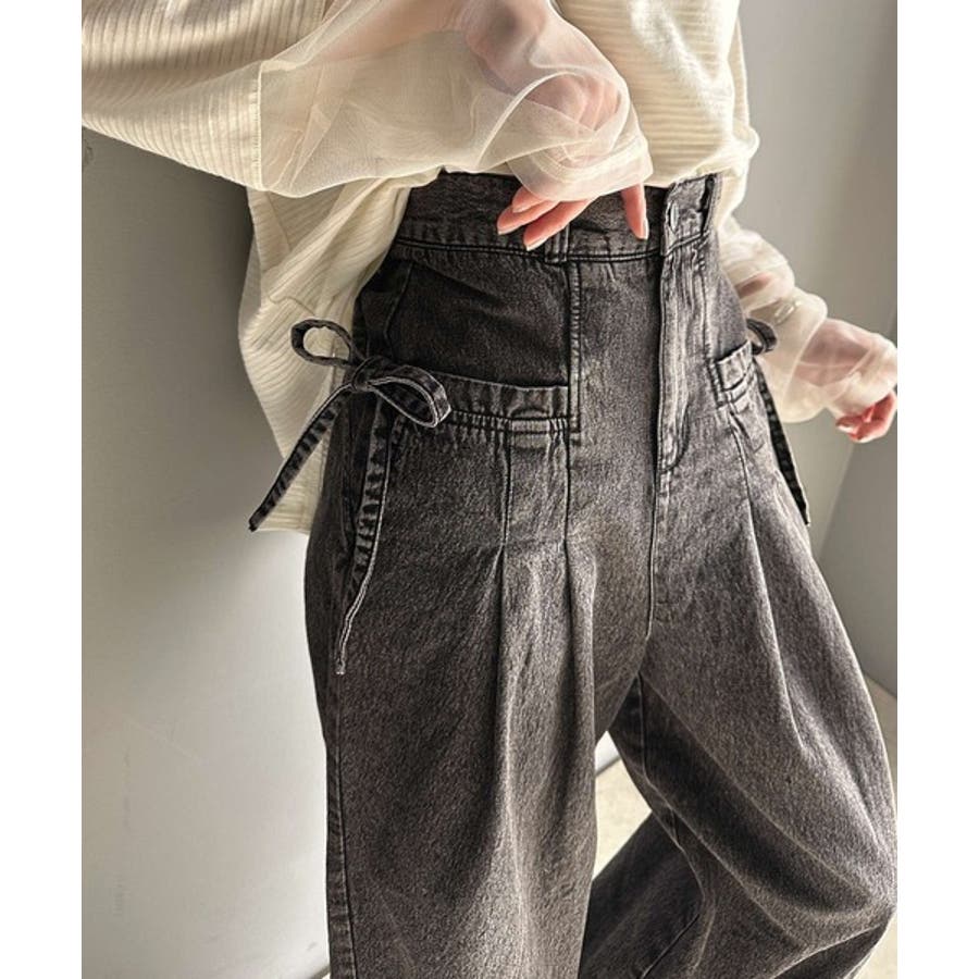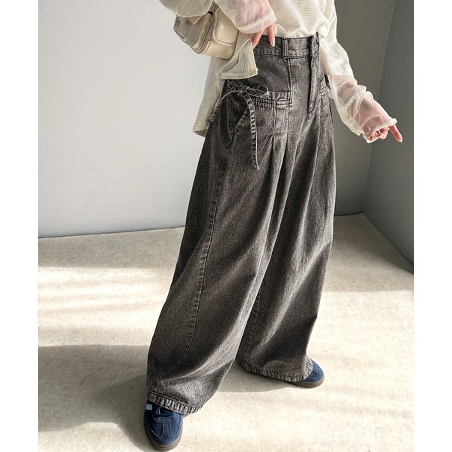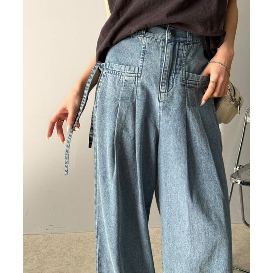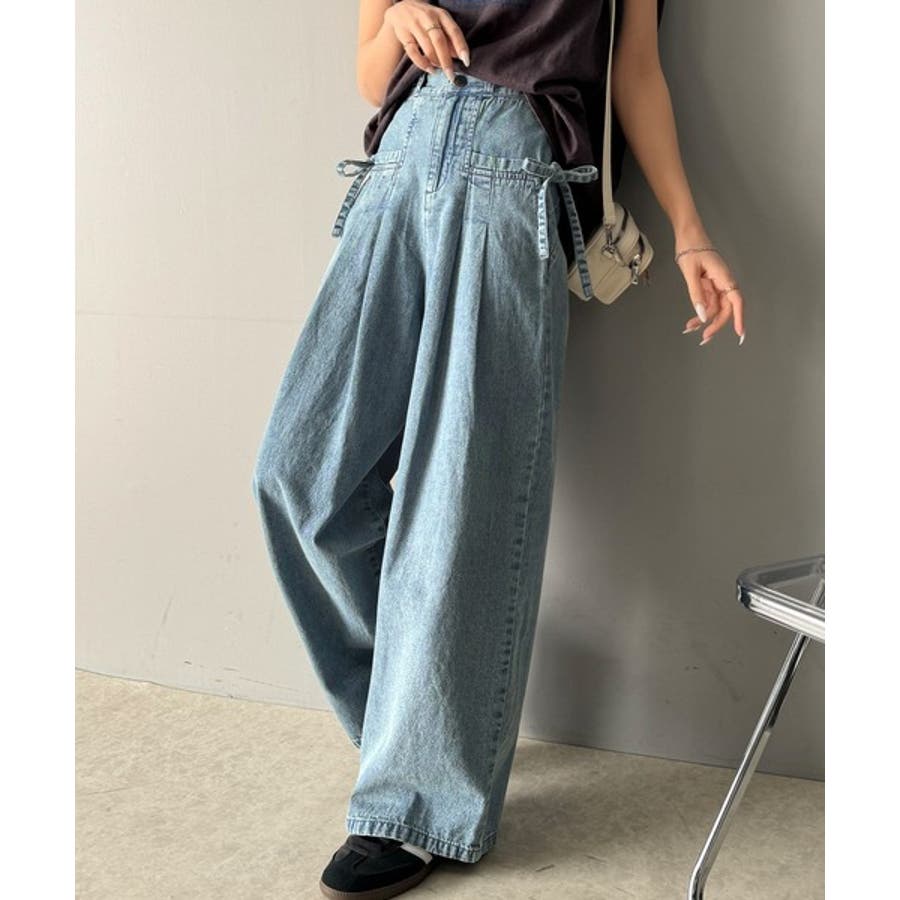 サイドリボンのタックワイドデニム。