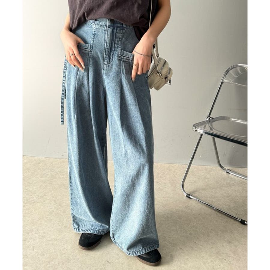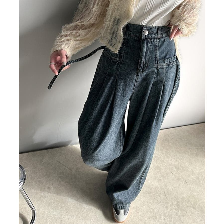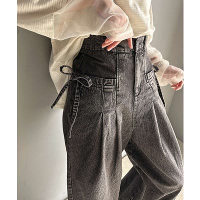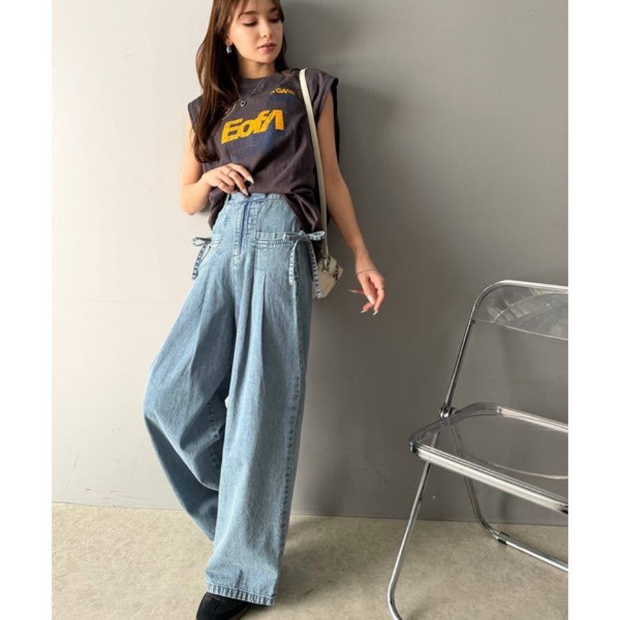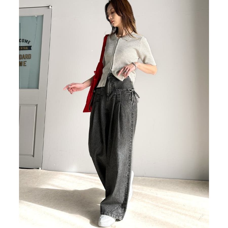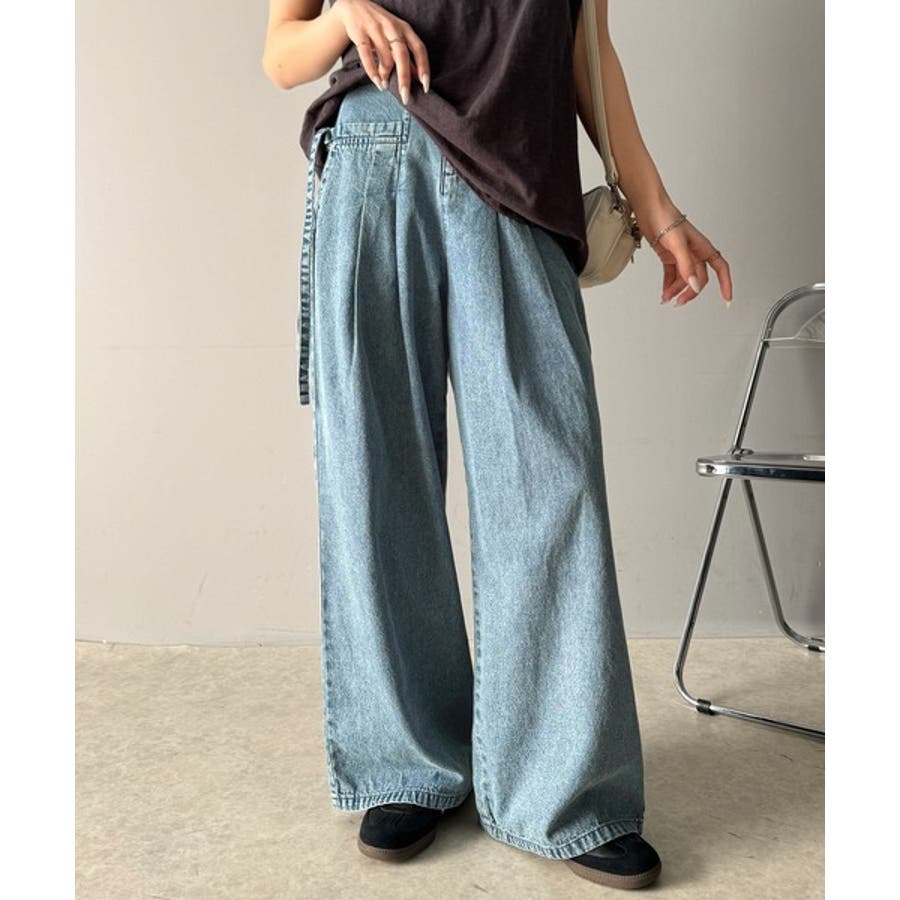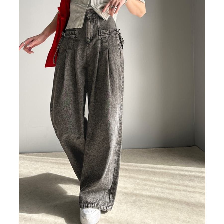 サイドリボンのタックワイドデニム。