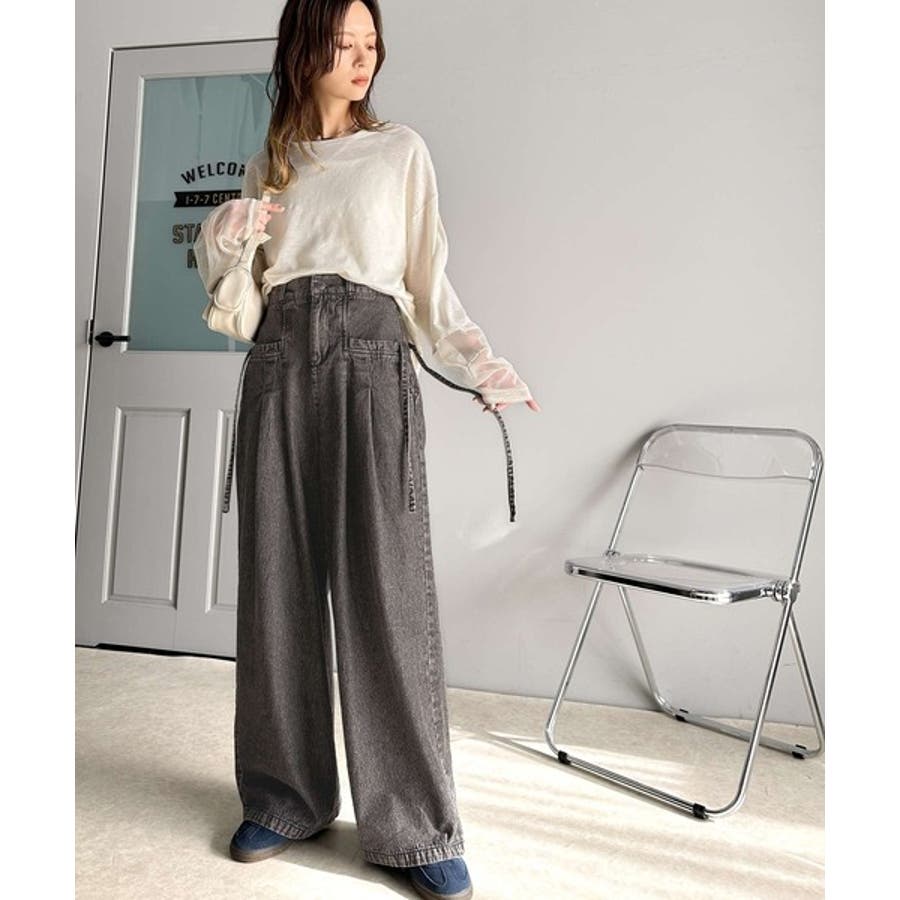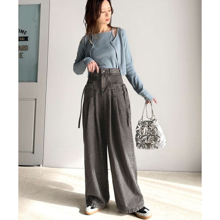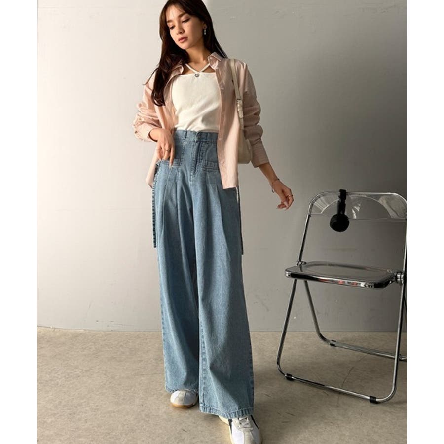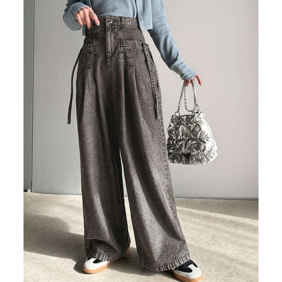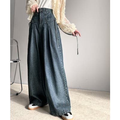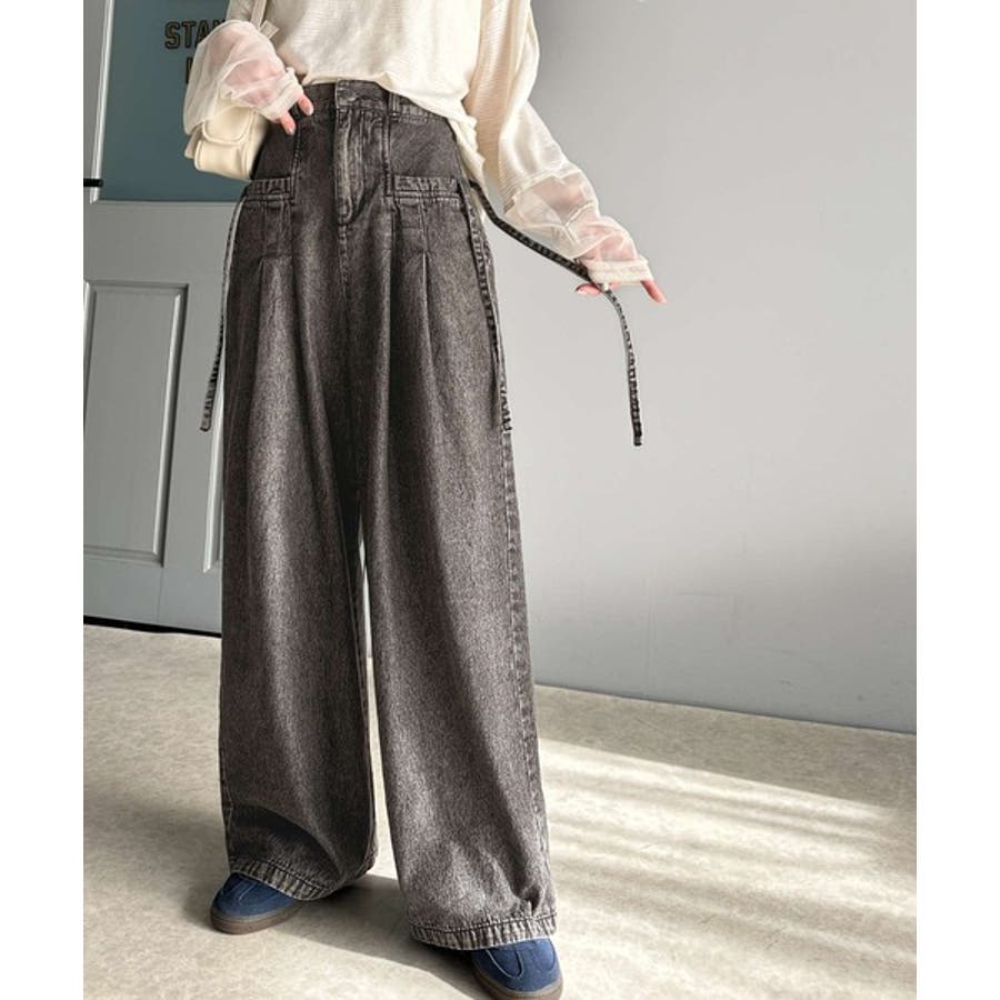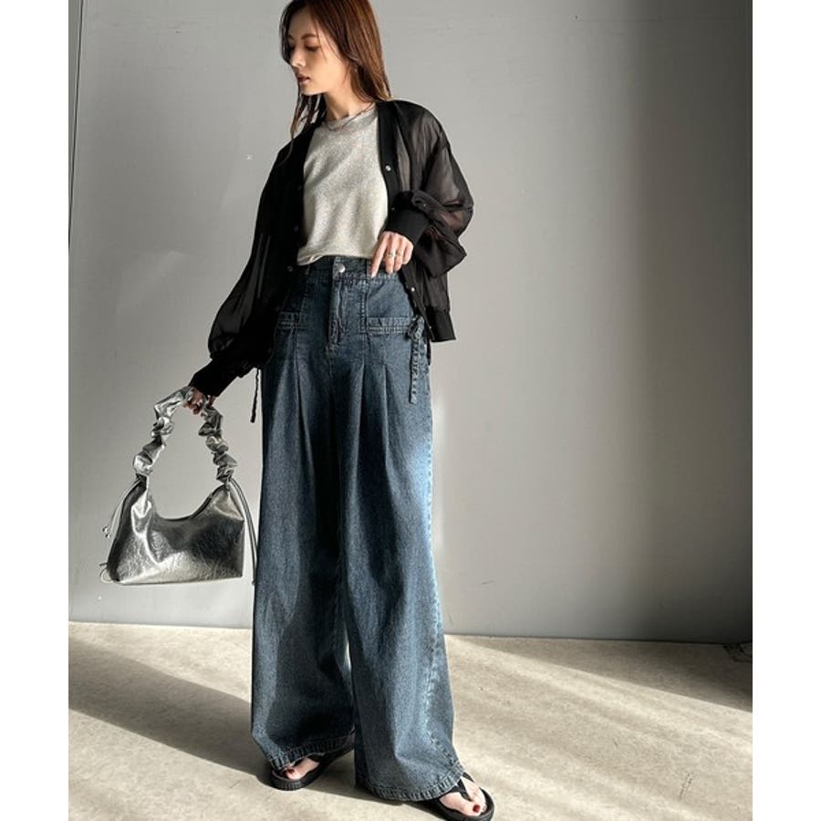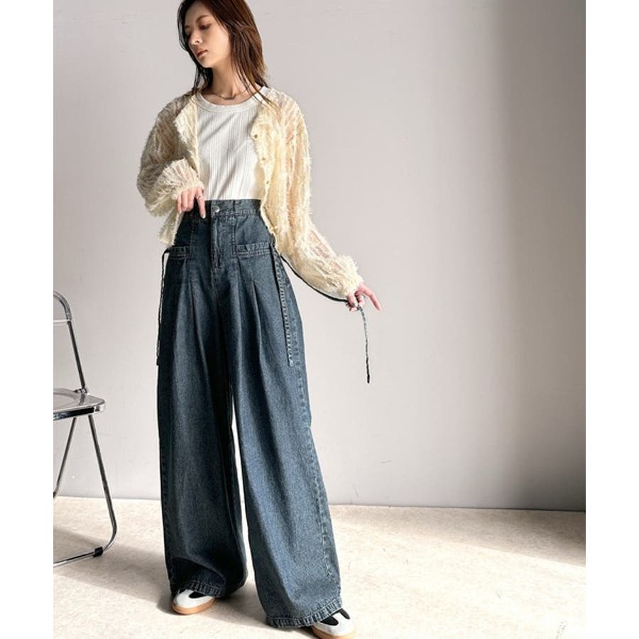 サイドリボンのタックワイドデニム。