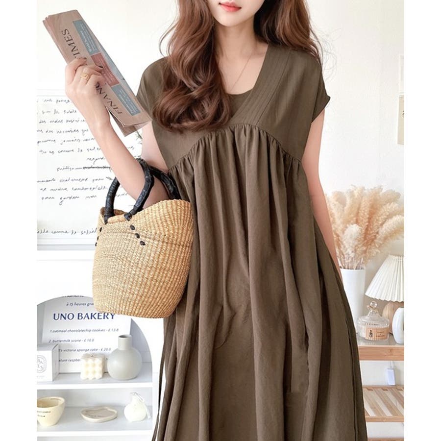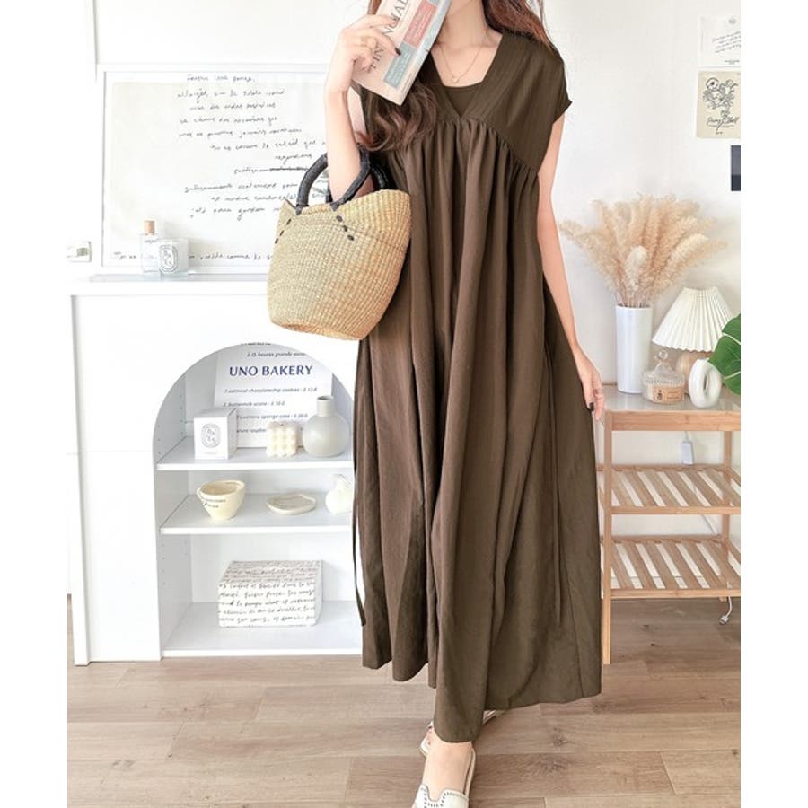 【ブラウン】大人のナチュラルスタイル。前後2WAYギャザー使いロングフレアワンピース