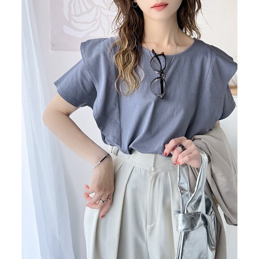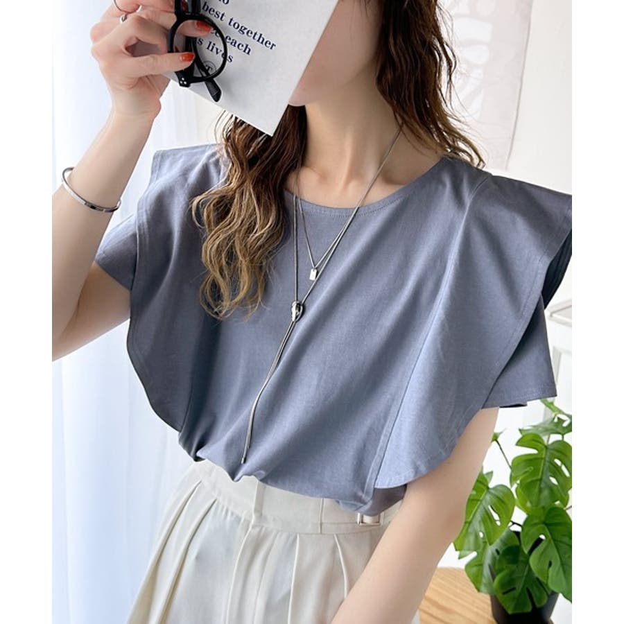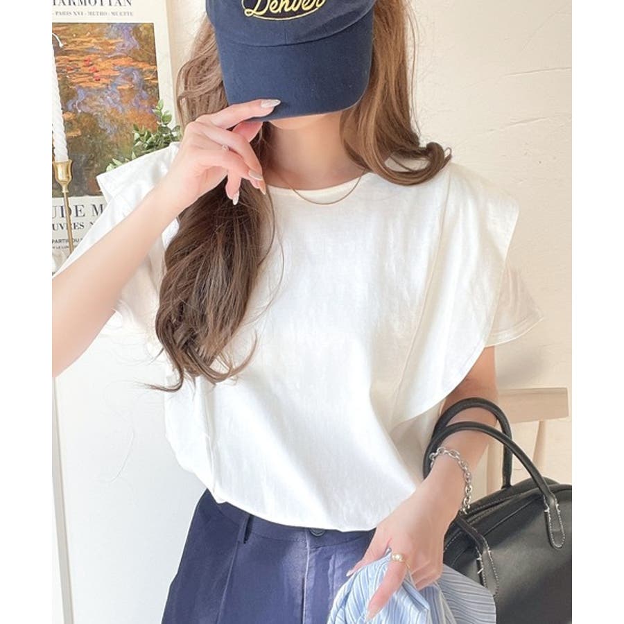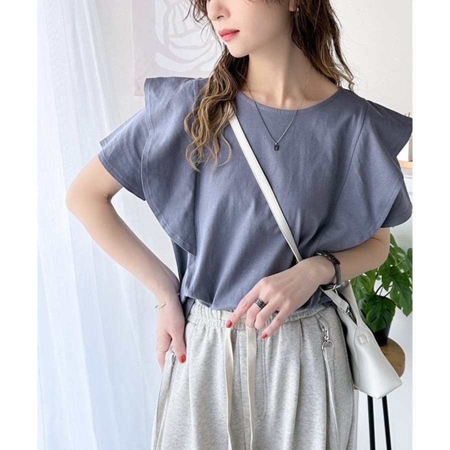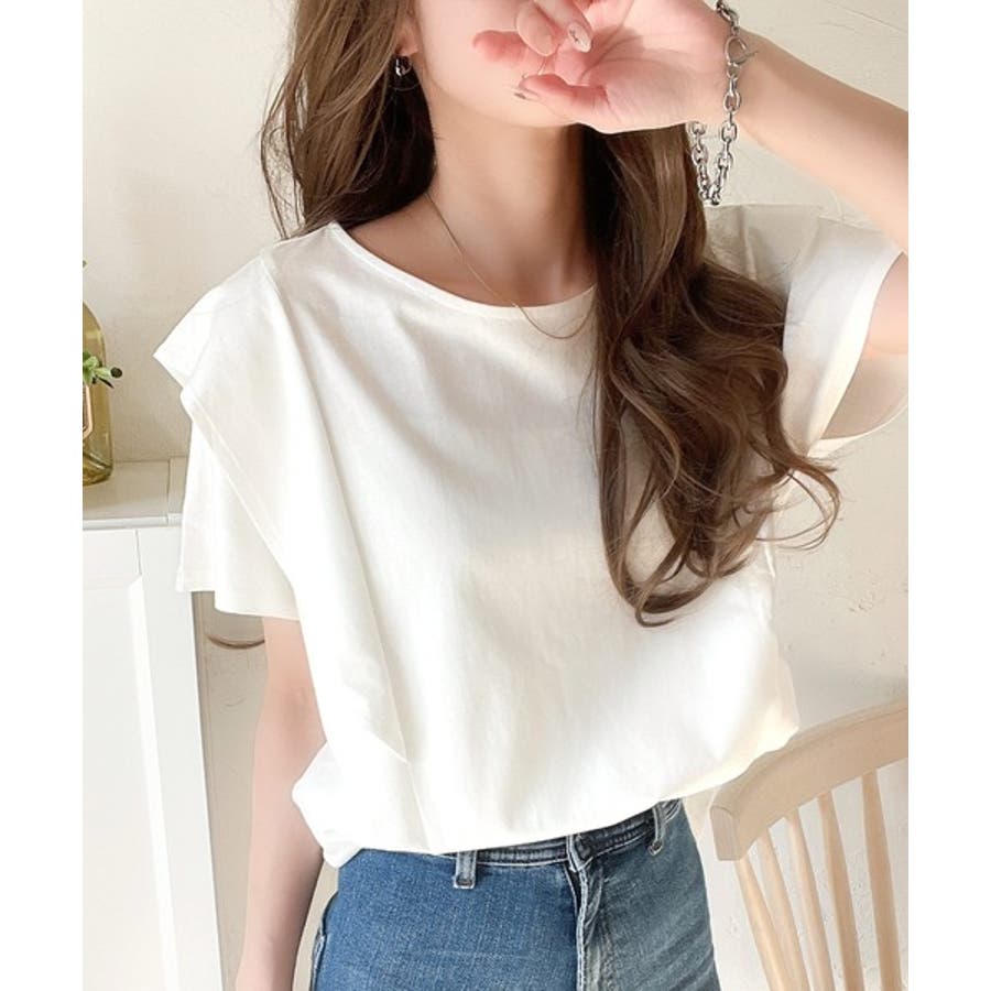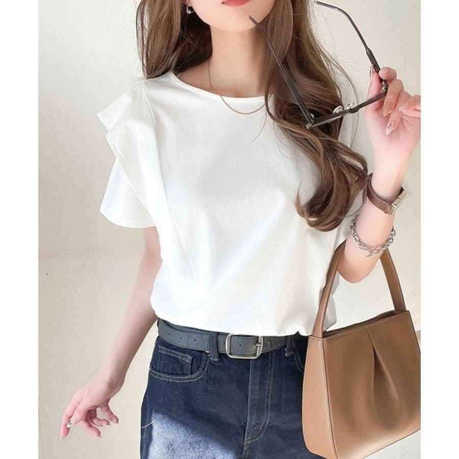 女性らしさ漂う、綿100%シルケット加工ラッフルショルダーTシャツ(半袖)