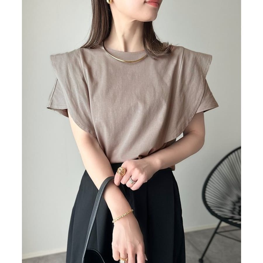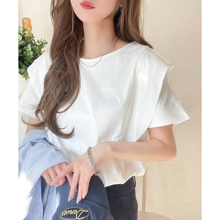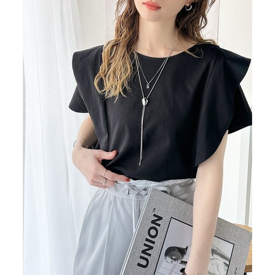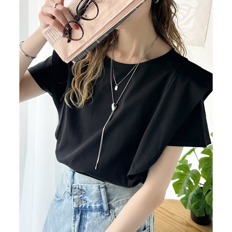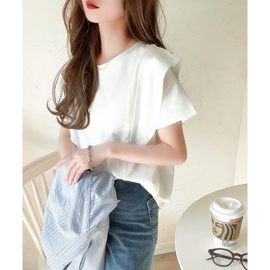 女性らしさ漂う、綿100%シルケット加工ラッフルショルダーTシャツ(半袖)