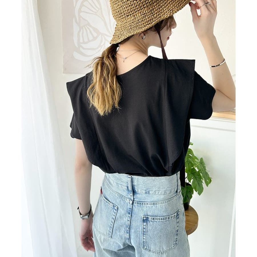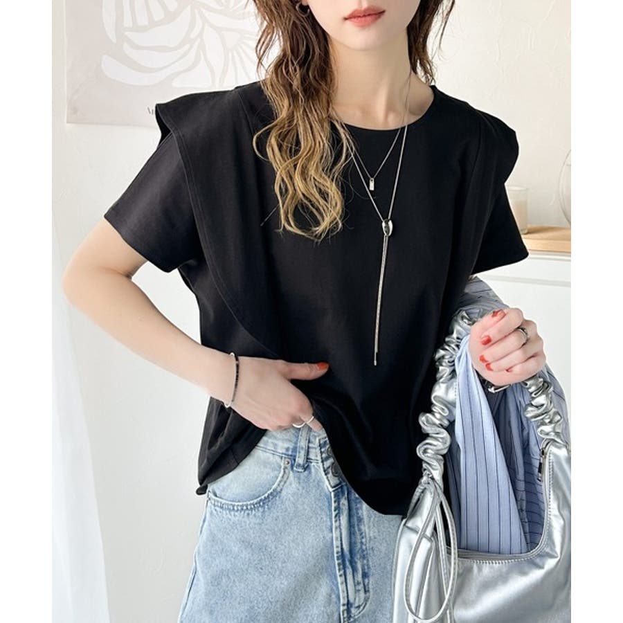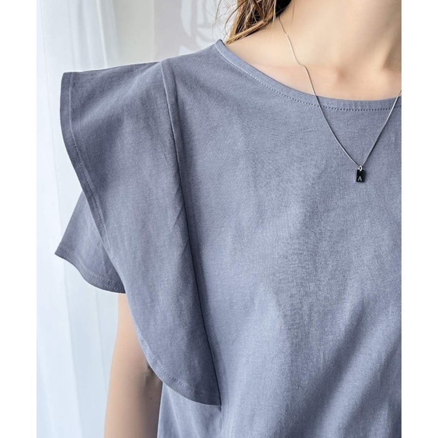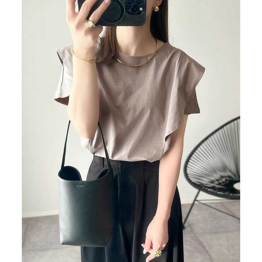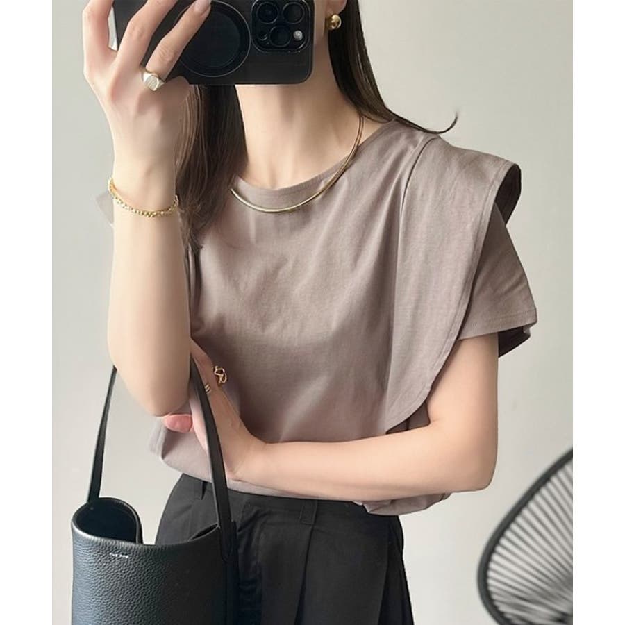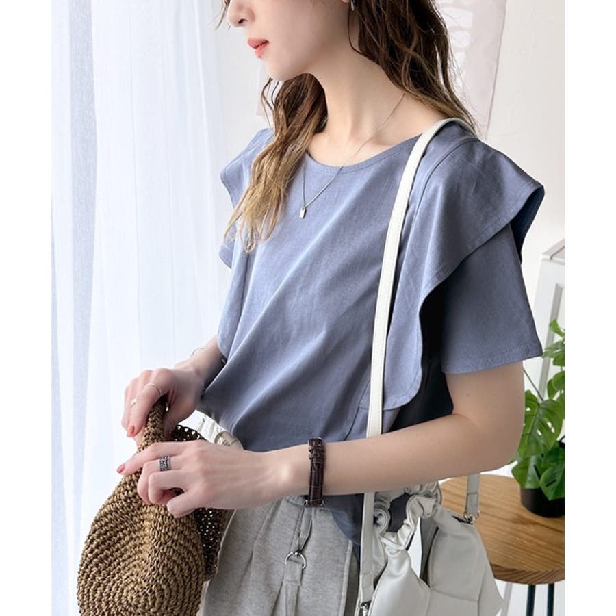 女性らしさ漂う、綿100%シルケット加工ラッフルショルダーTシャツ(半袖)