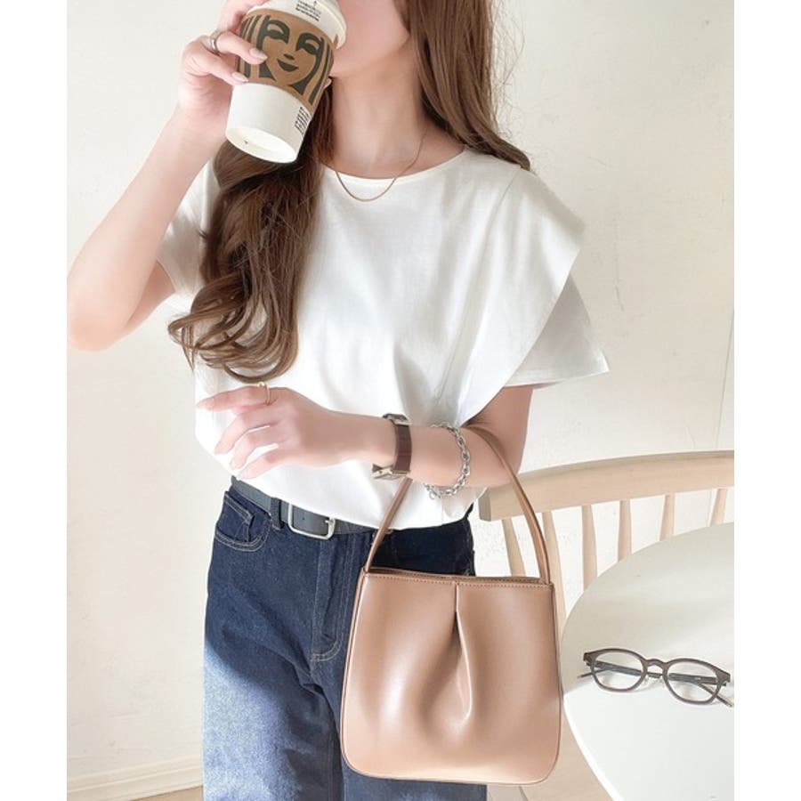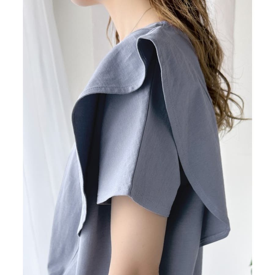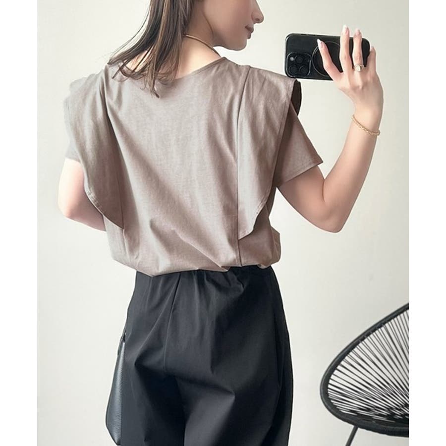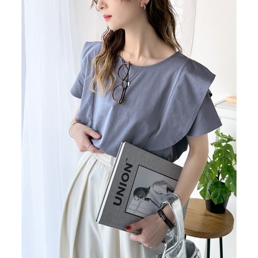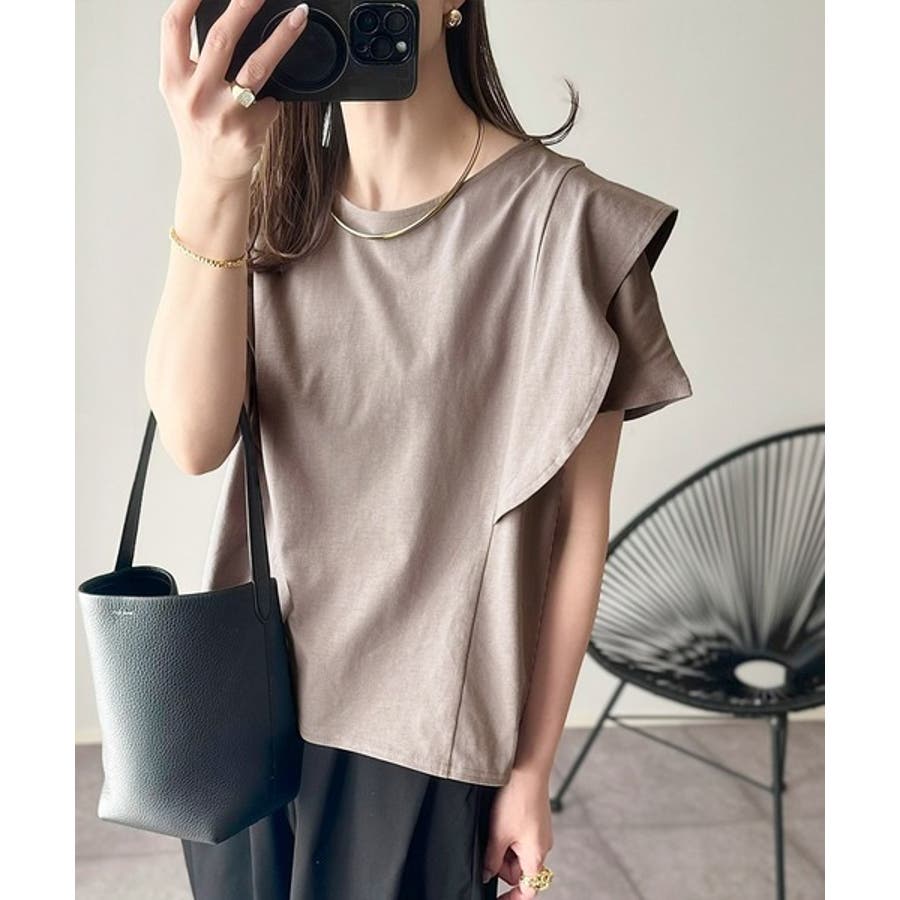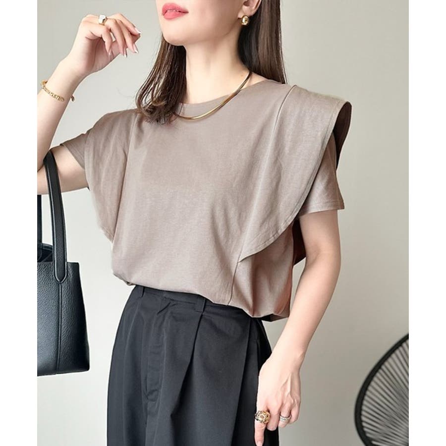 女性らしさ漂う、綿100%シルケット加工ラッフルショルダーTシャツ(半袖)