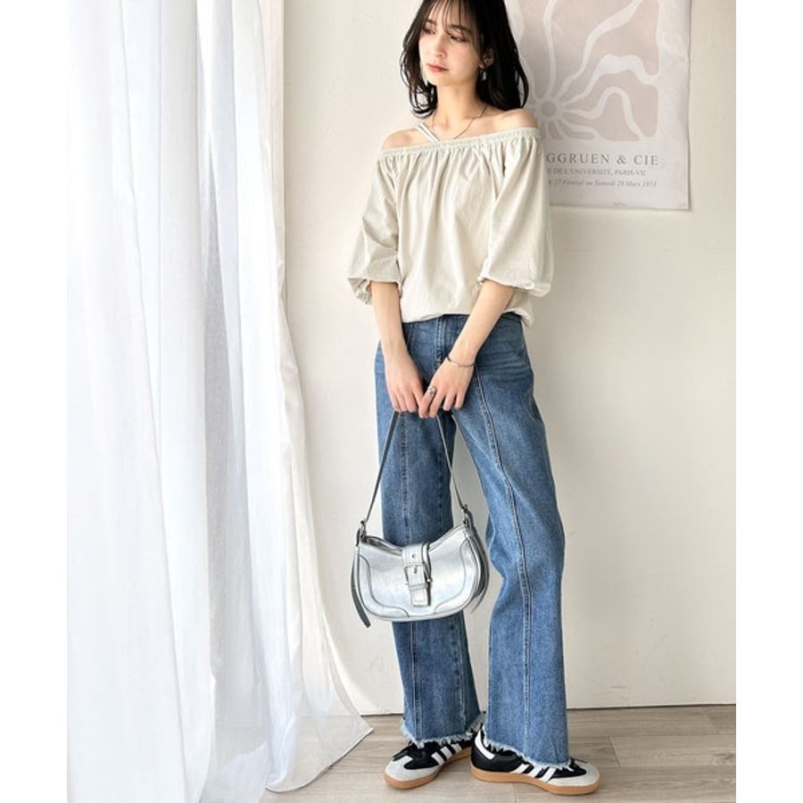 襟ぐりの広いデザインだから、肩を落としてオフショルダー風にもアレンジ可能。