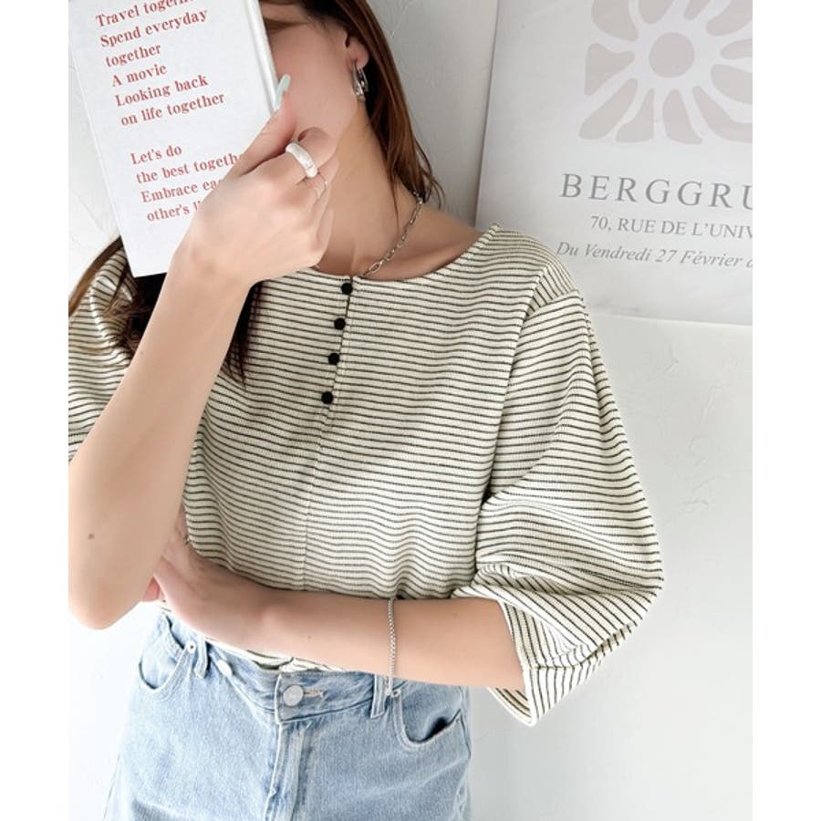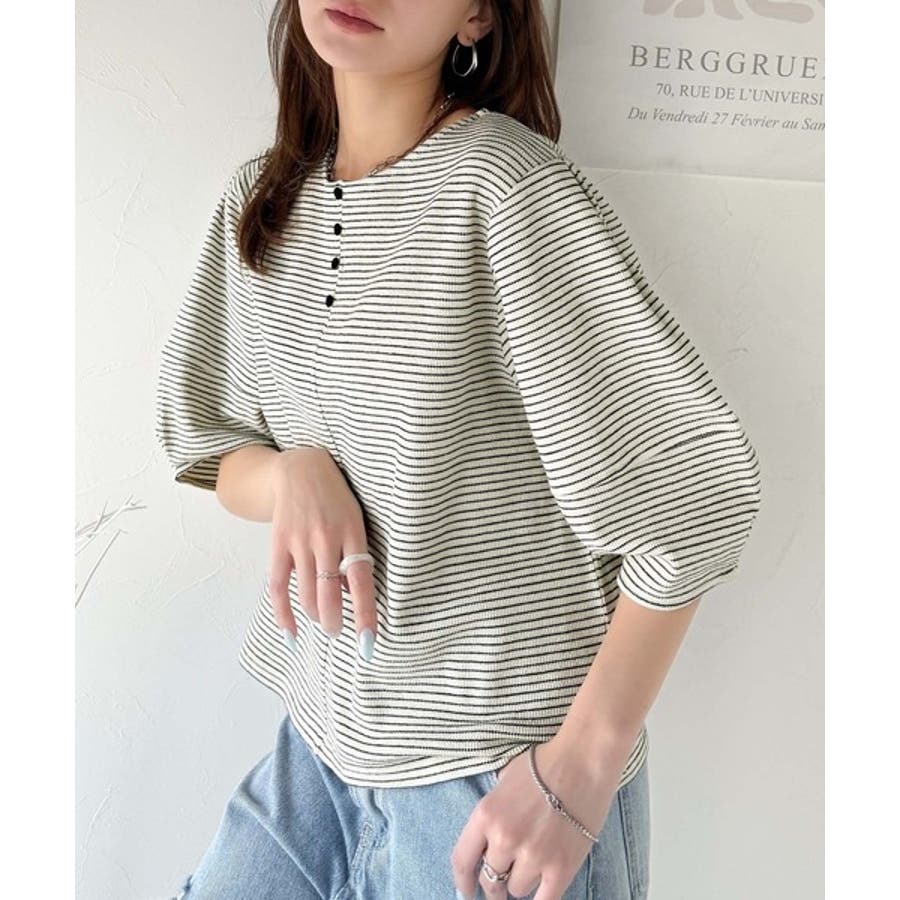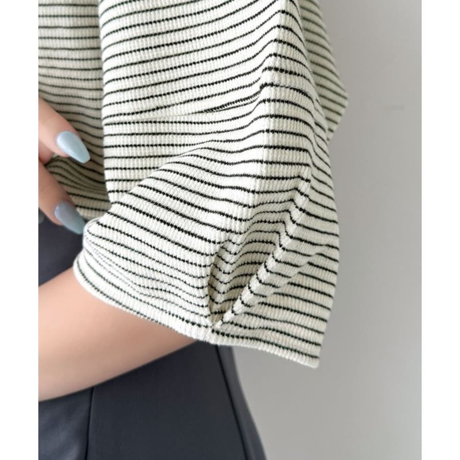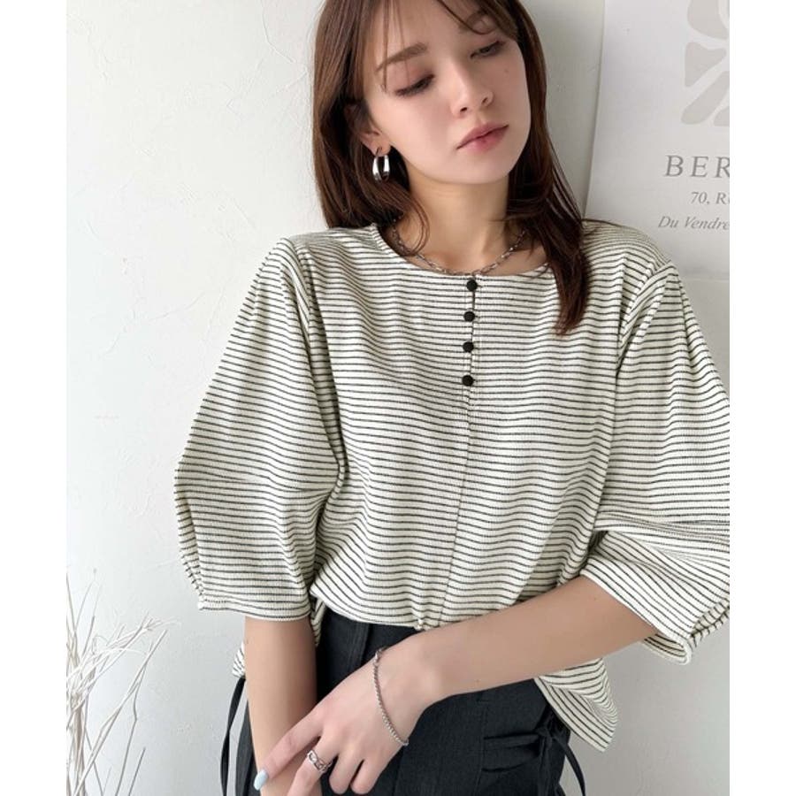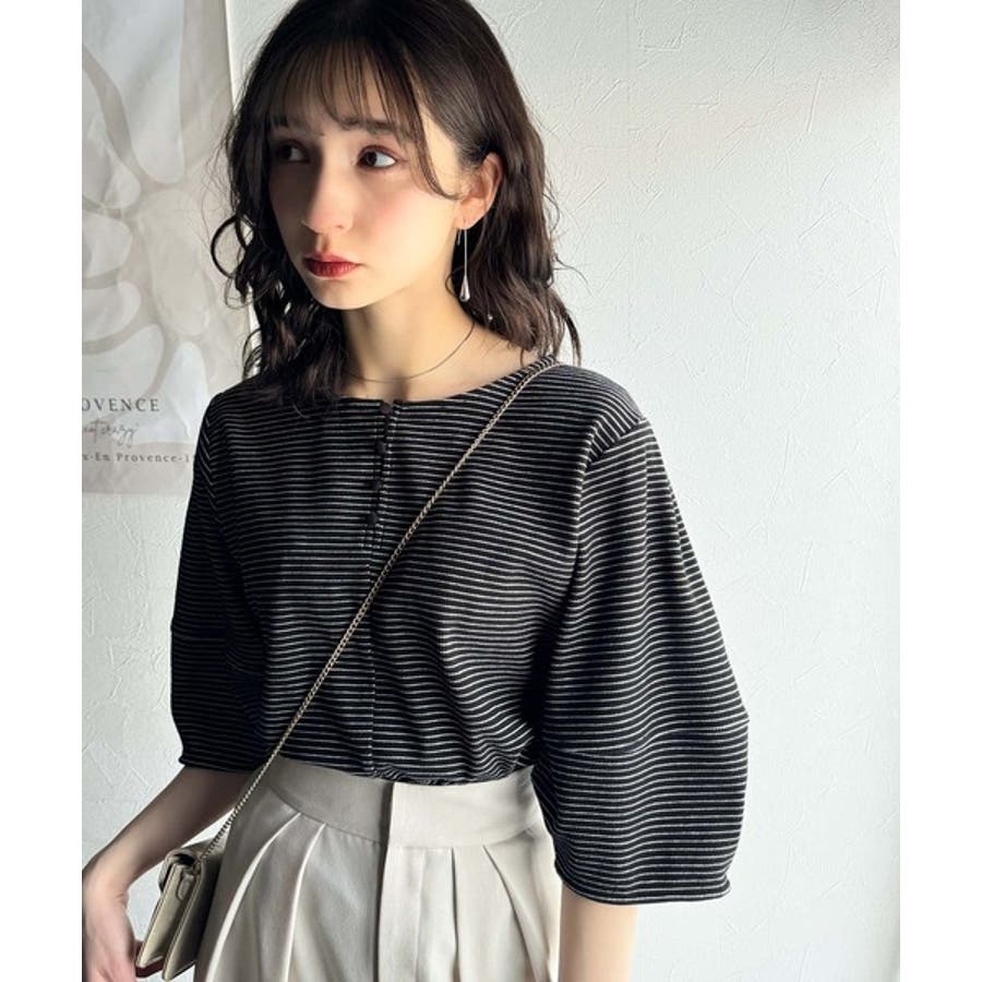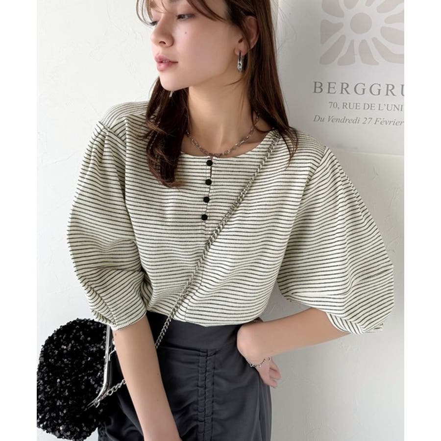 華奢見えを叶える!前後2wayランタンスリーブミニボーダートップス(5分袖)