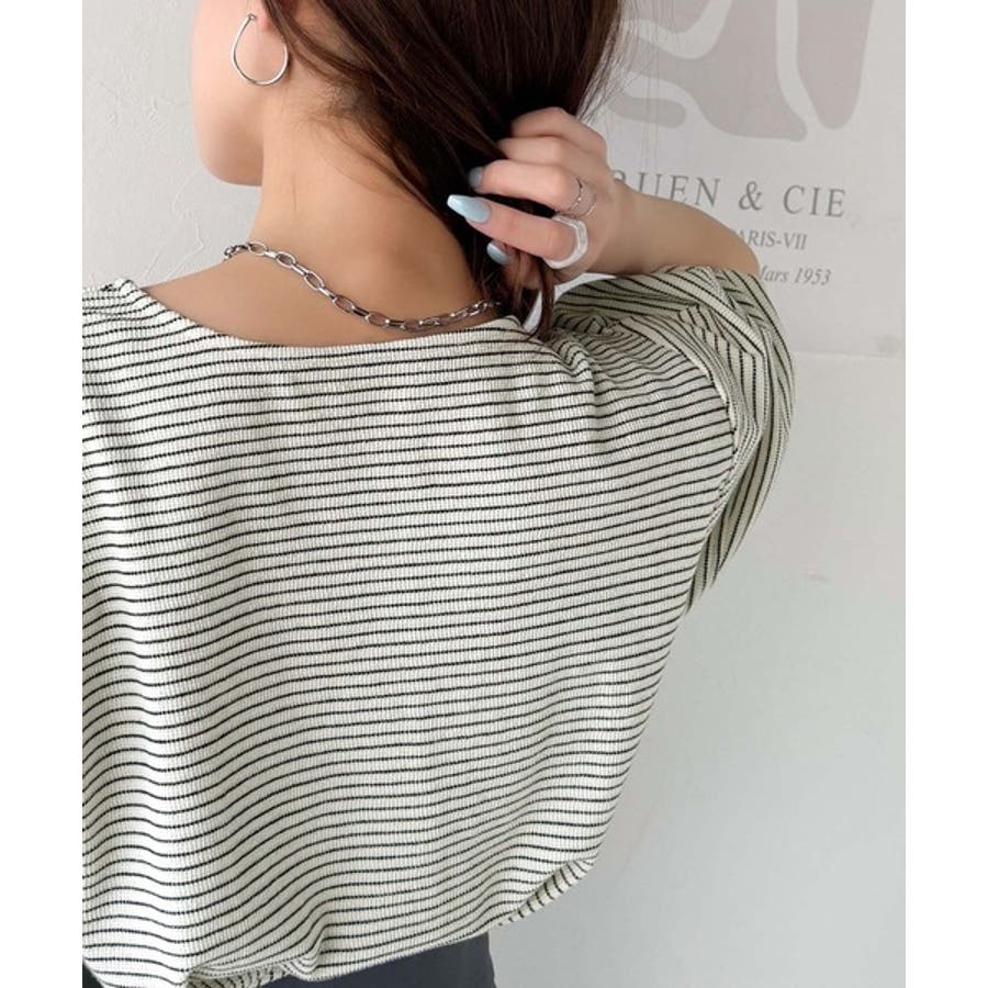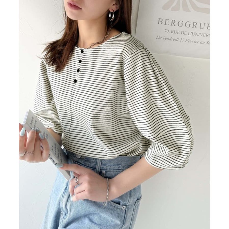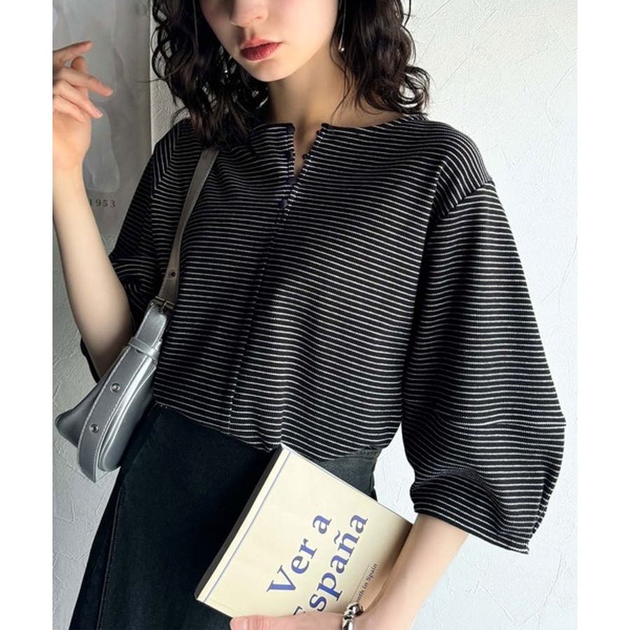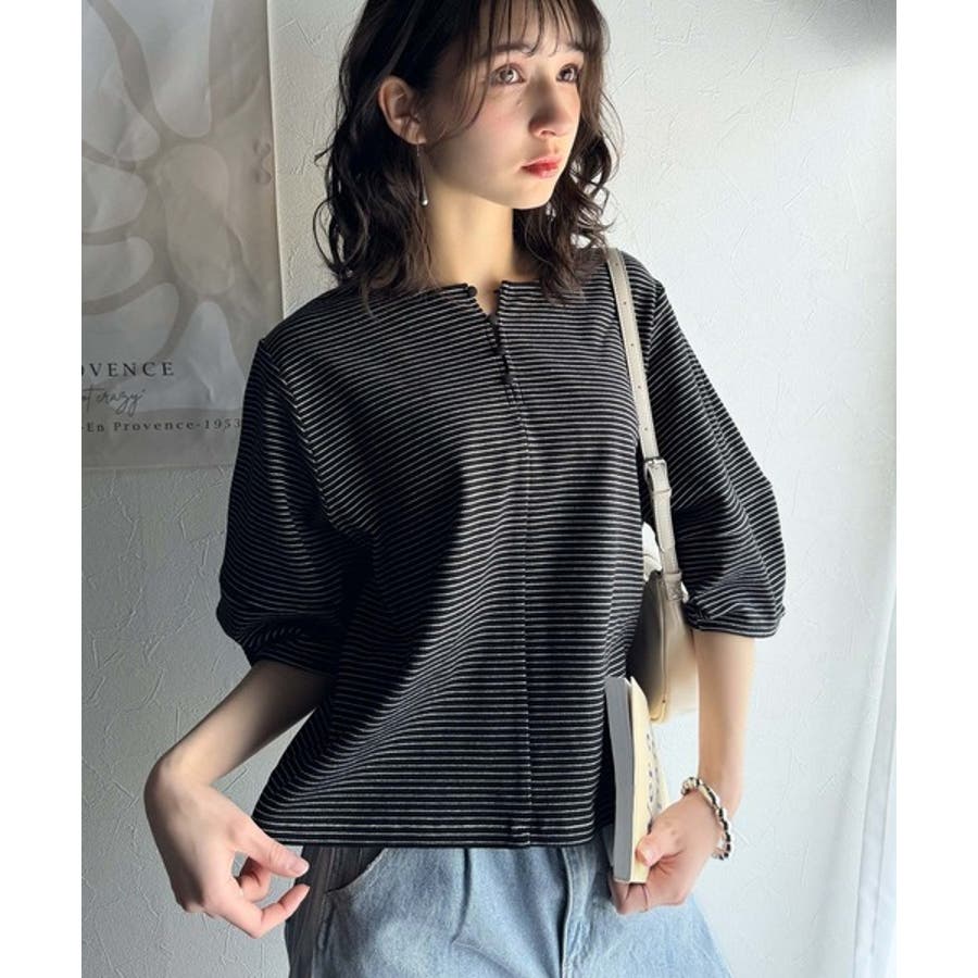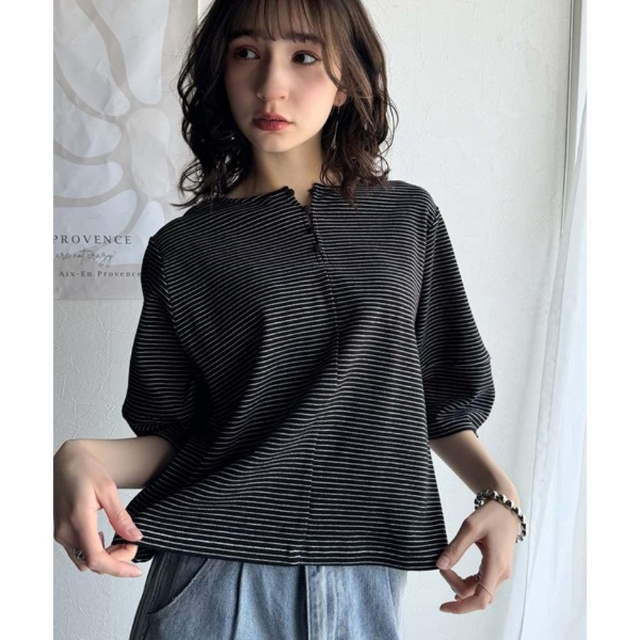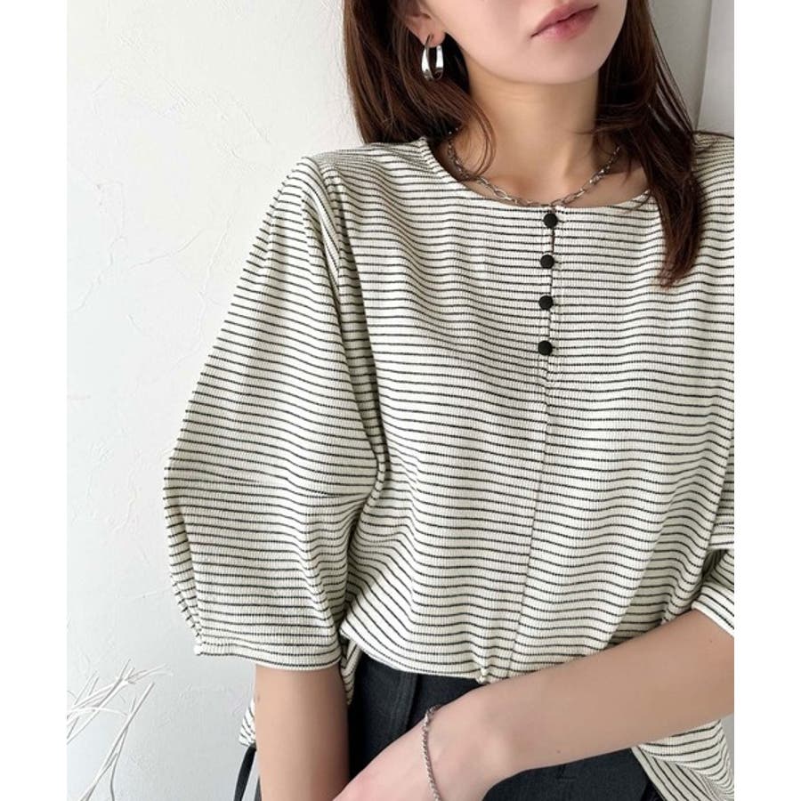 華奢見えを叶える!前後2wayランタンスリーブミニボーダートップス(5分袖)