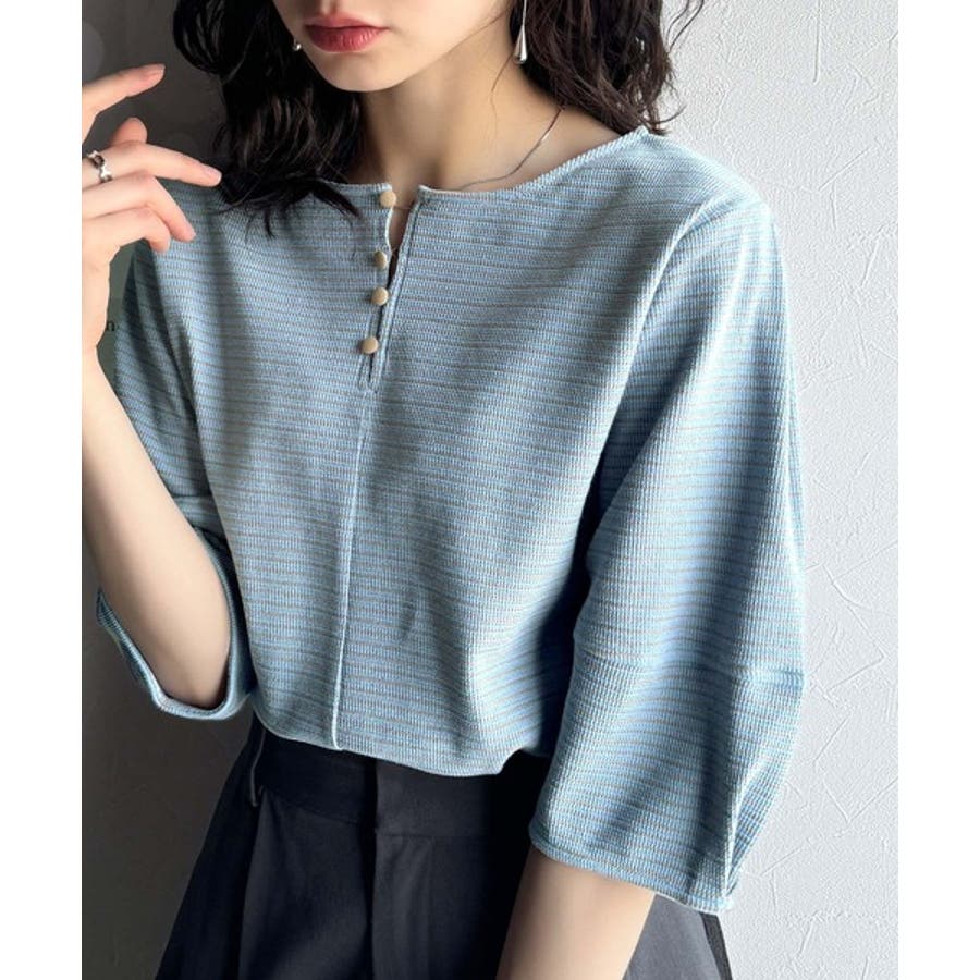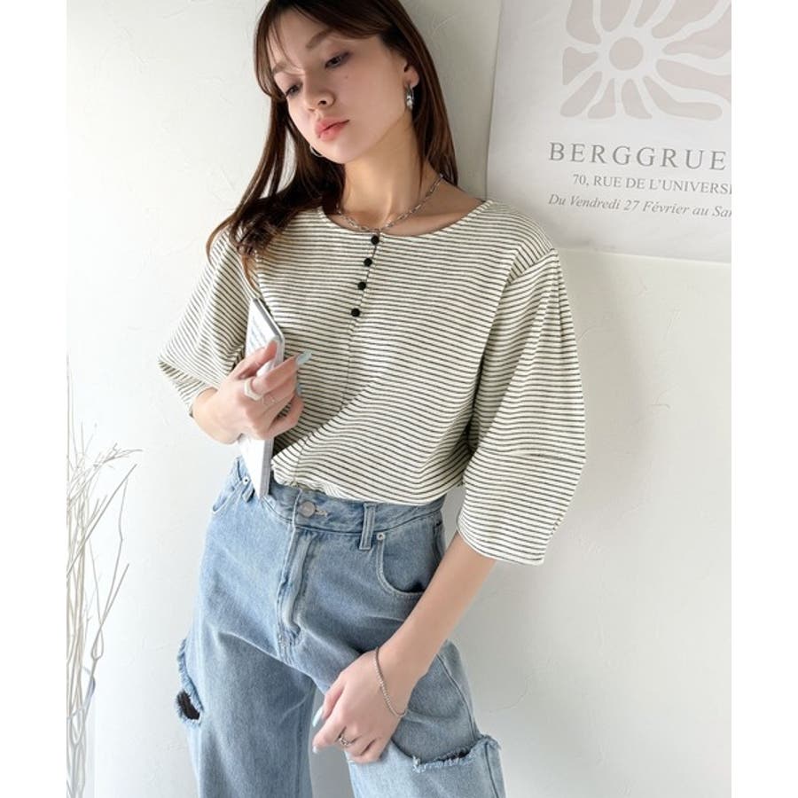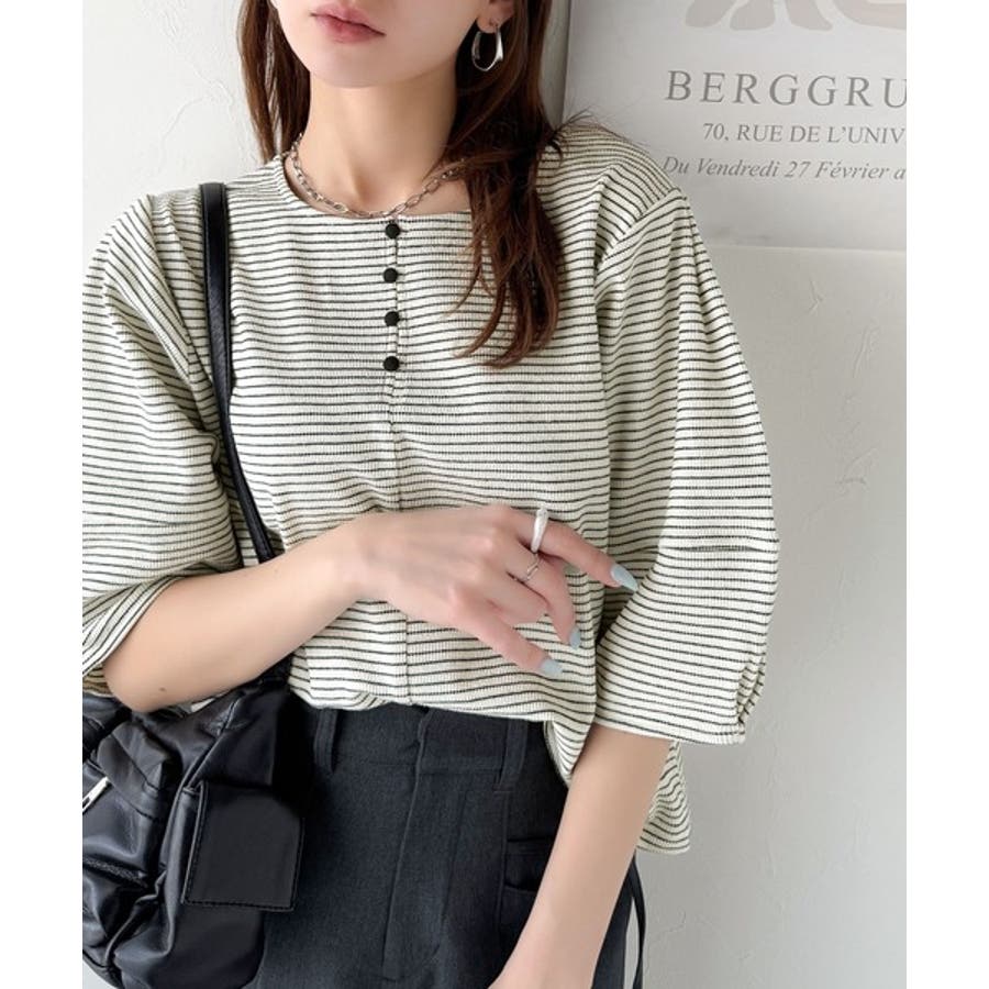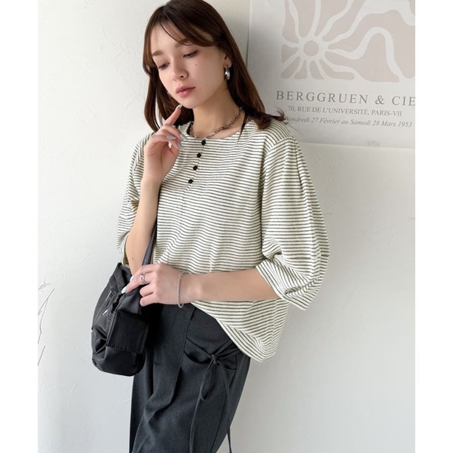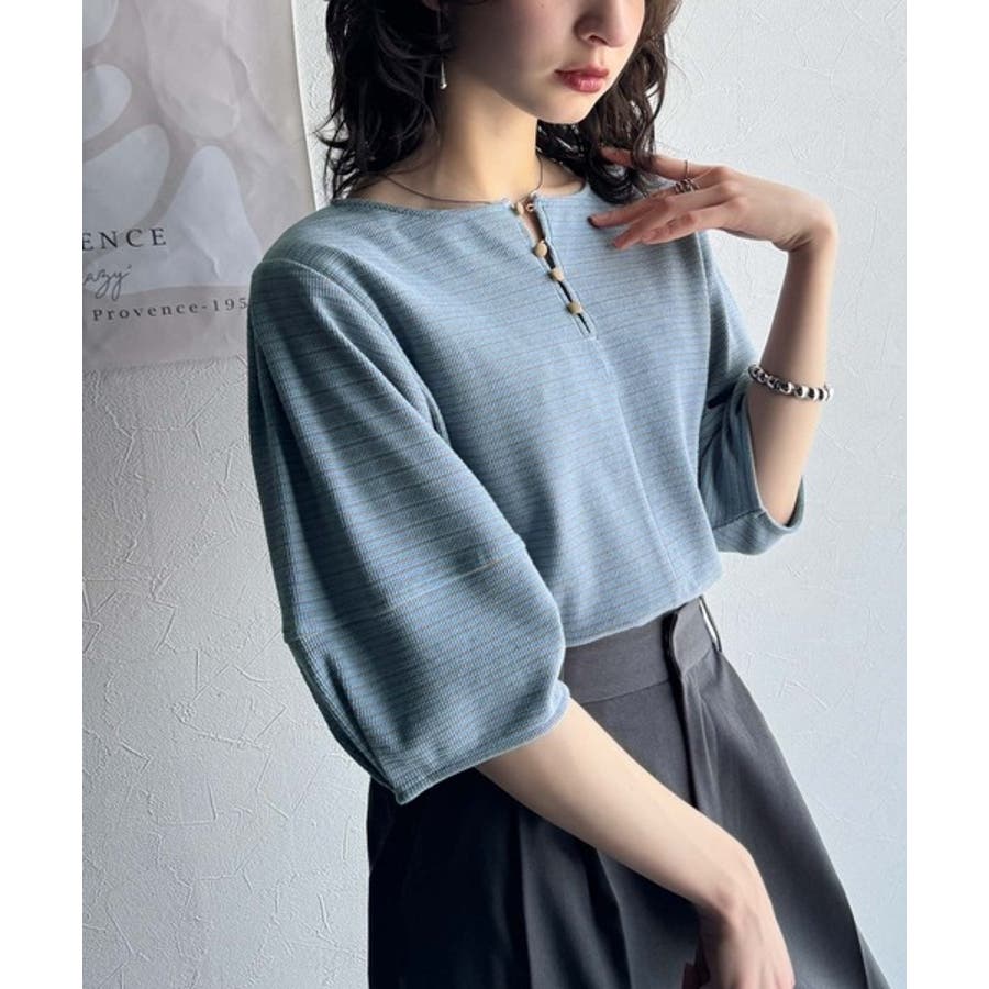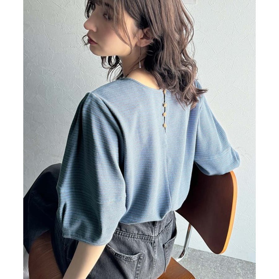 華奢見えを叶える!前後2wayランタンスリーブミニボーダートップス(5分袖)