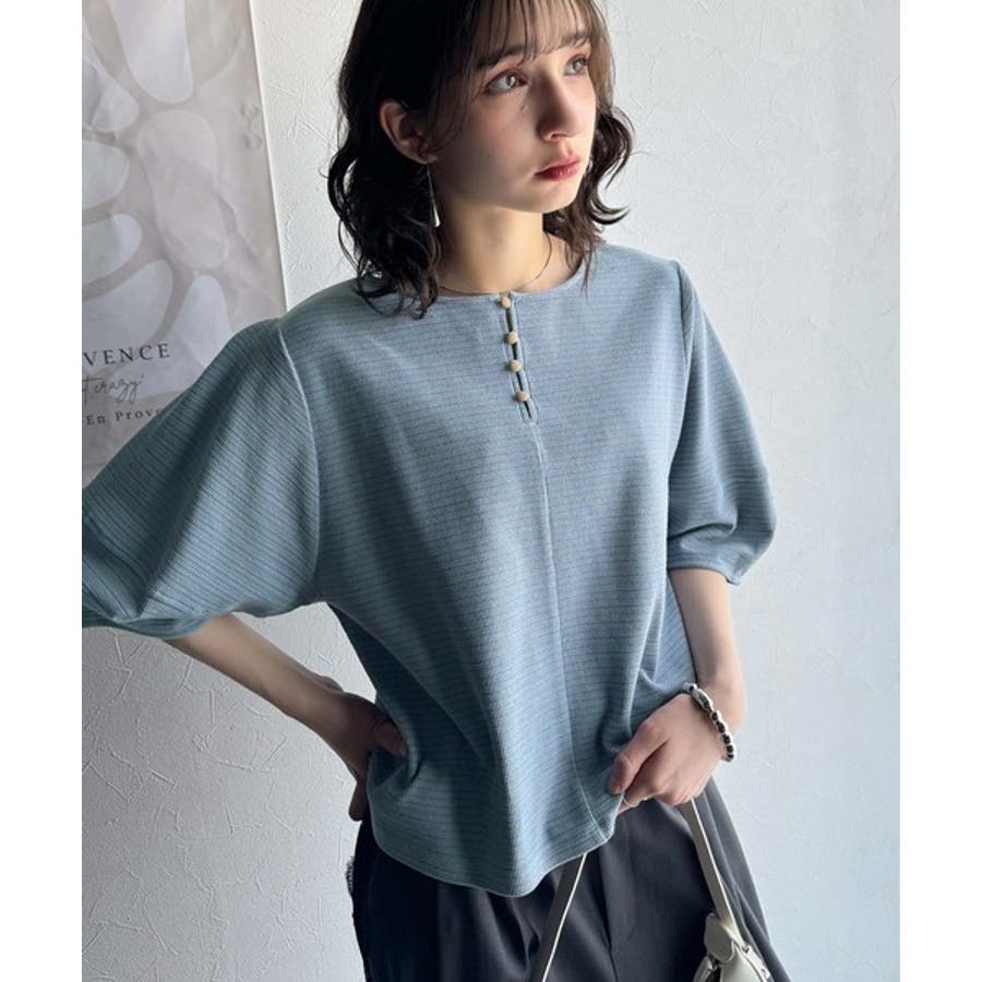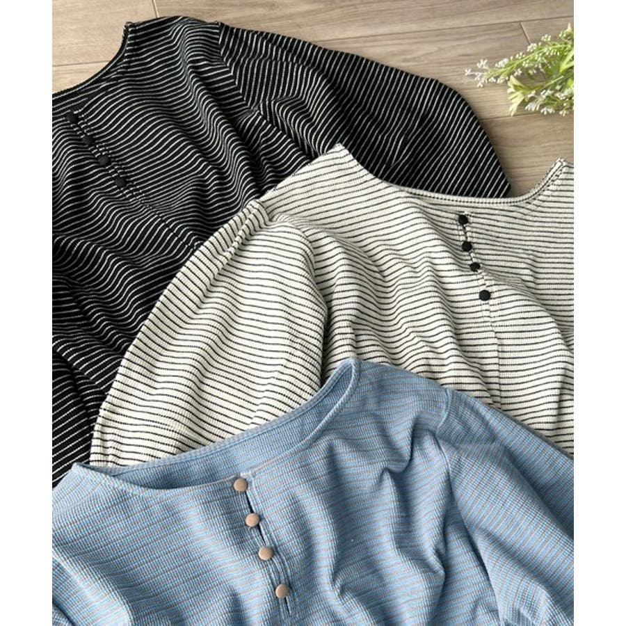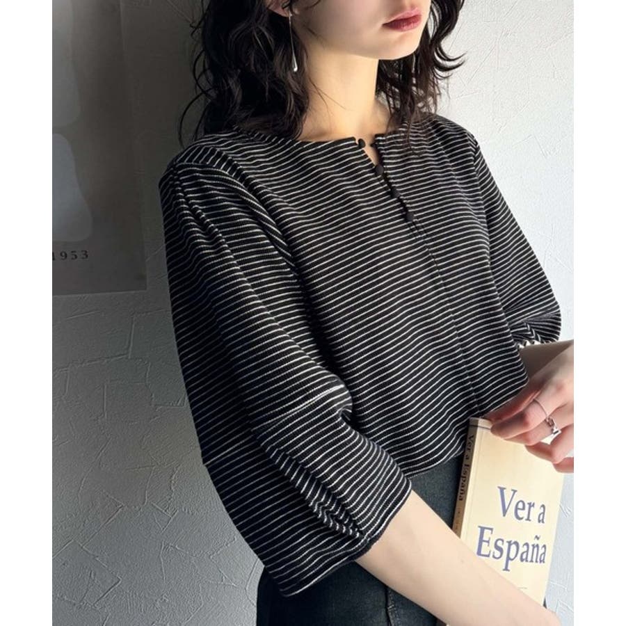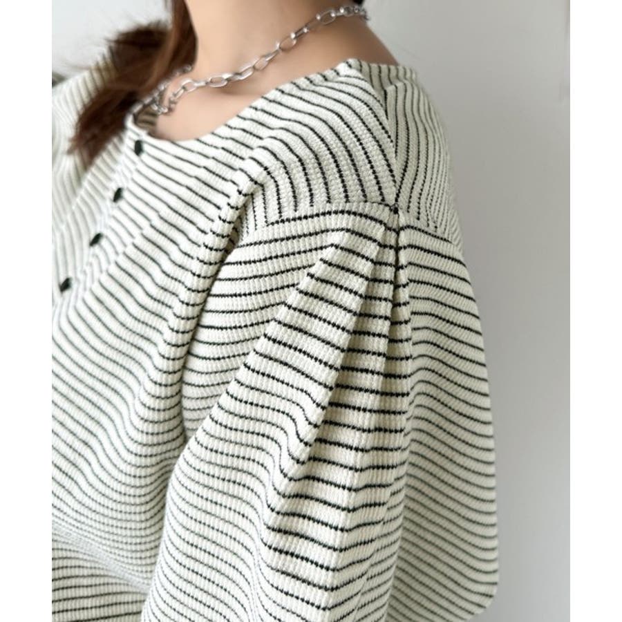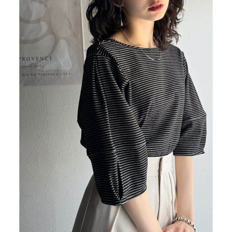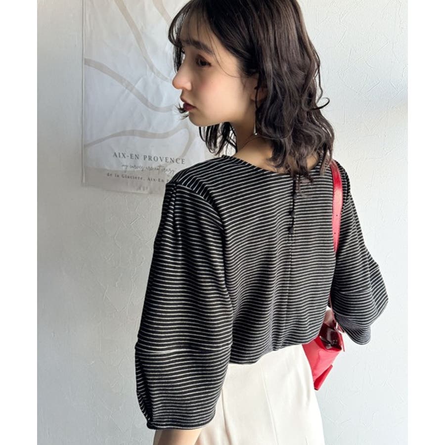 細ボーダーが上品な印象を与え、ランタンスリーブが