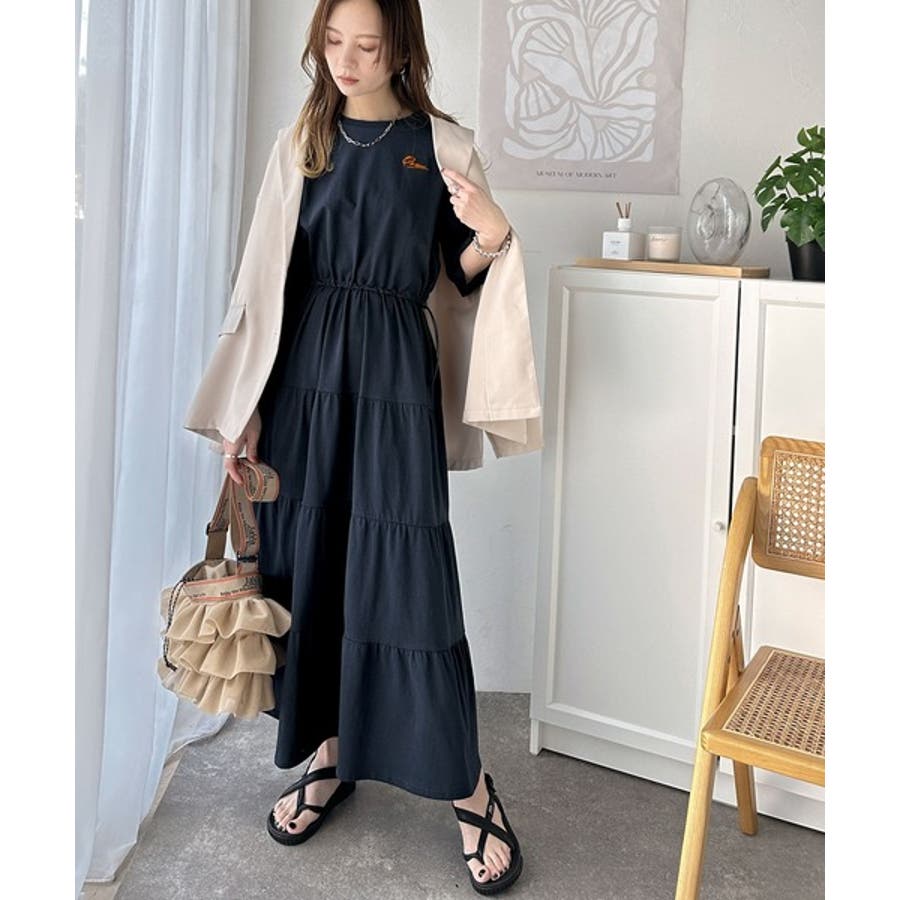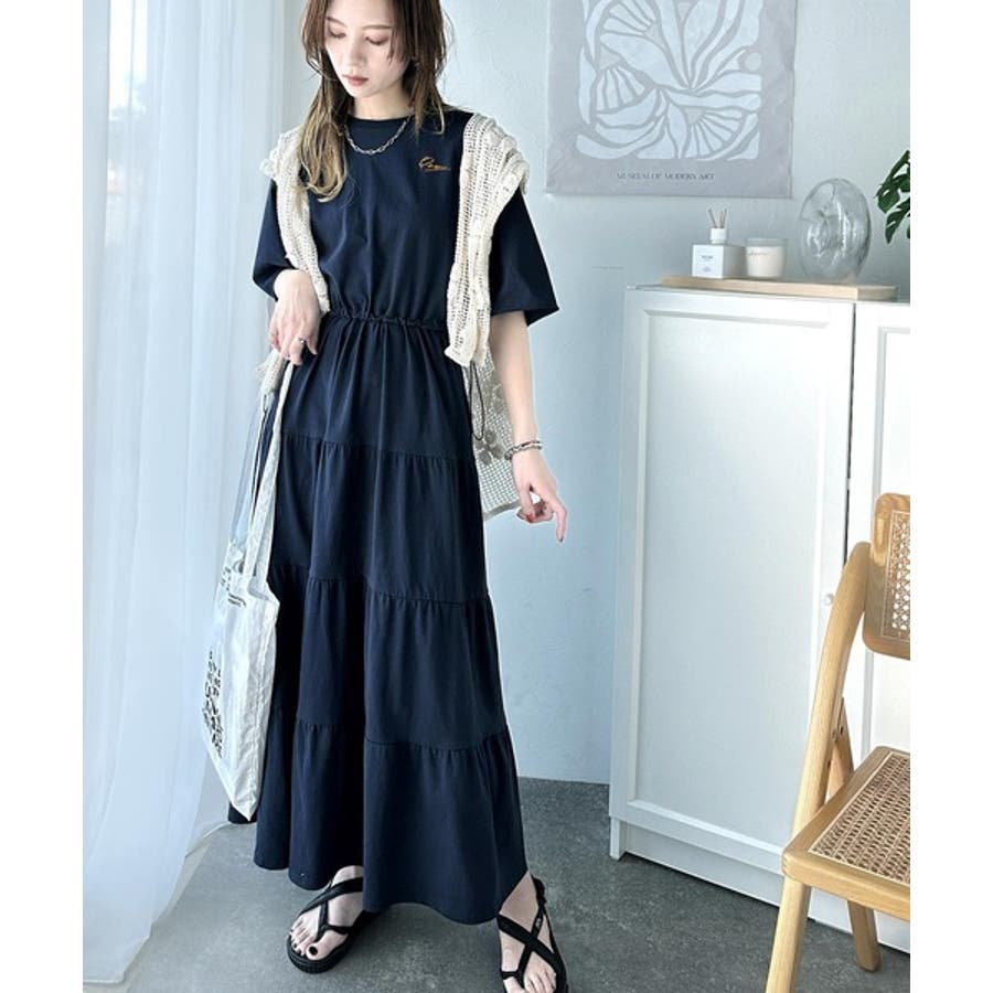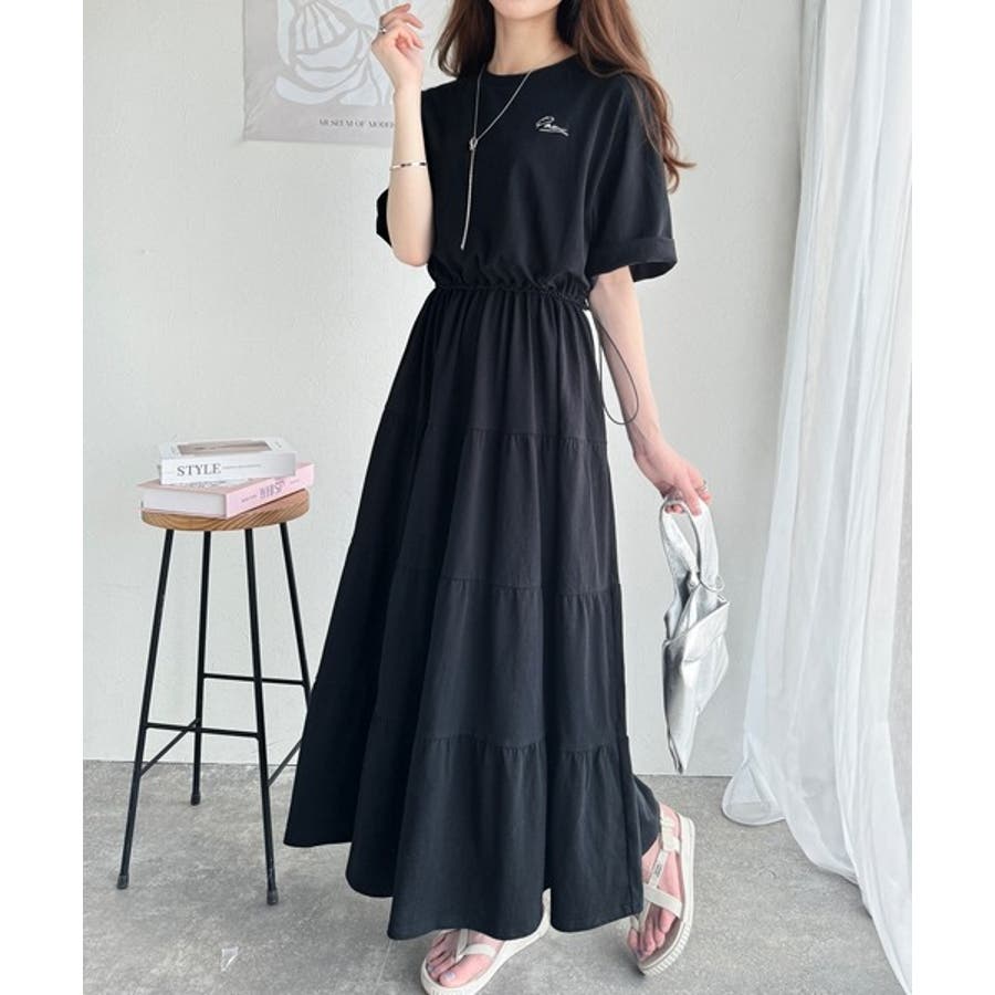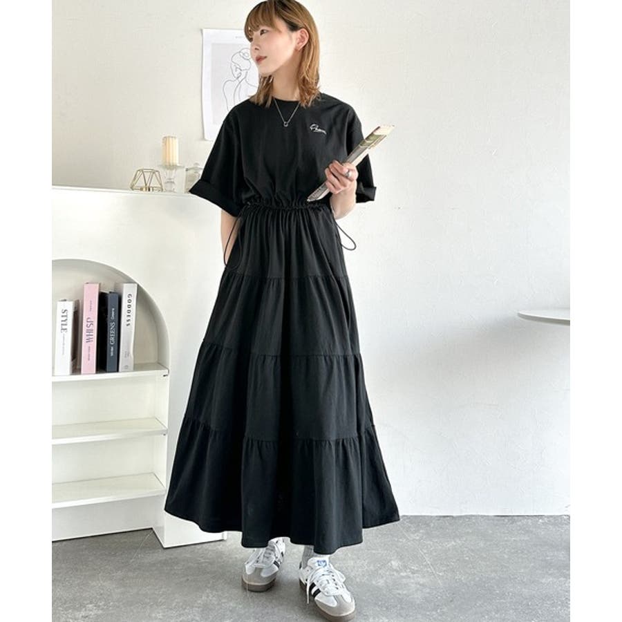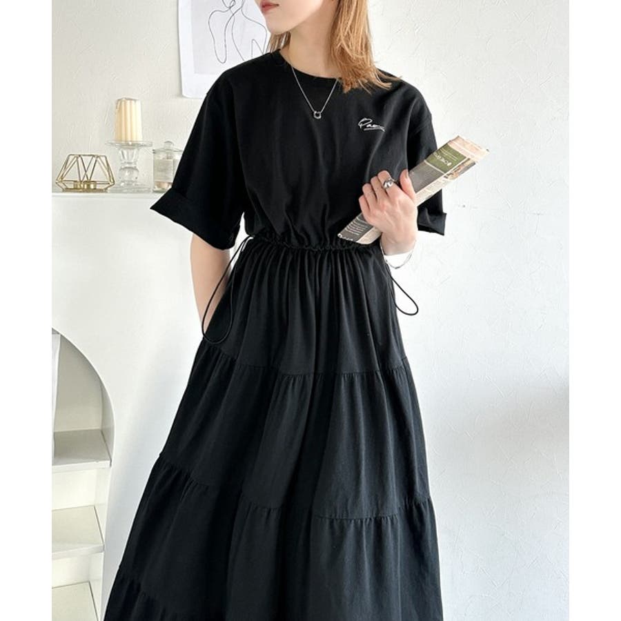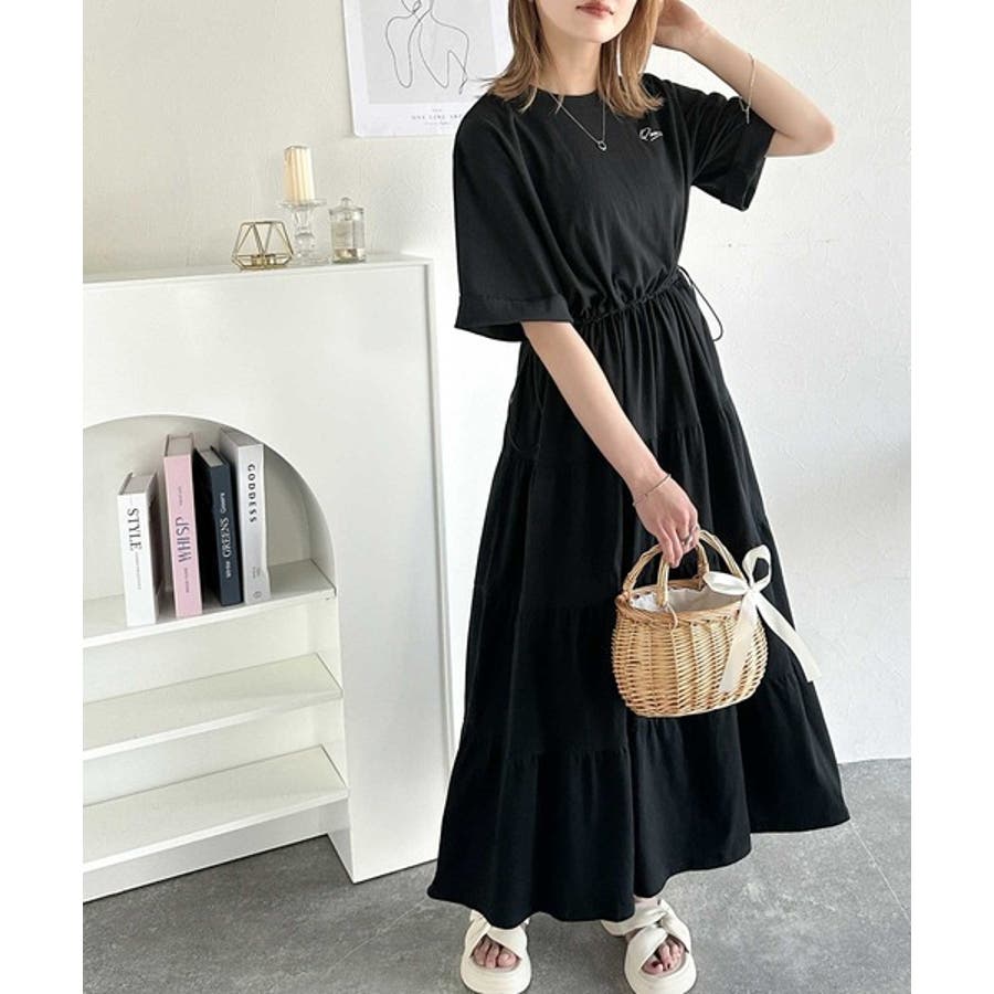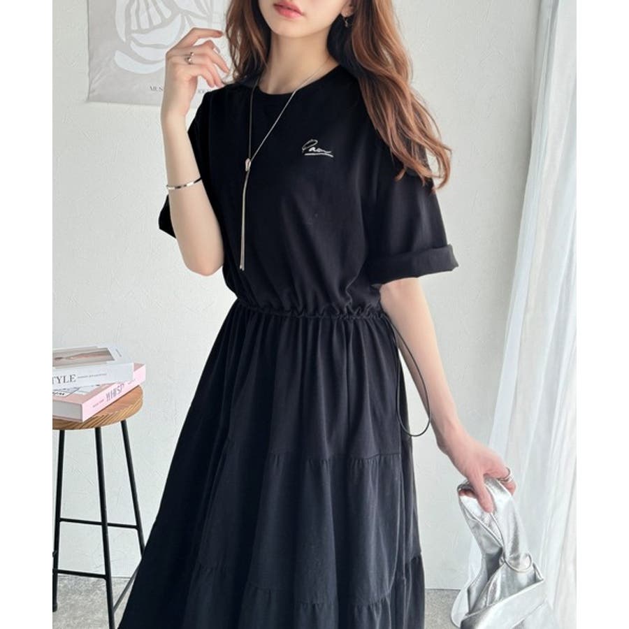 女性らしさを引き立てるデザインが魅力。胸刺繍ドロストティアードワンピース