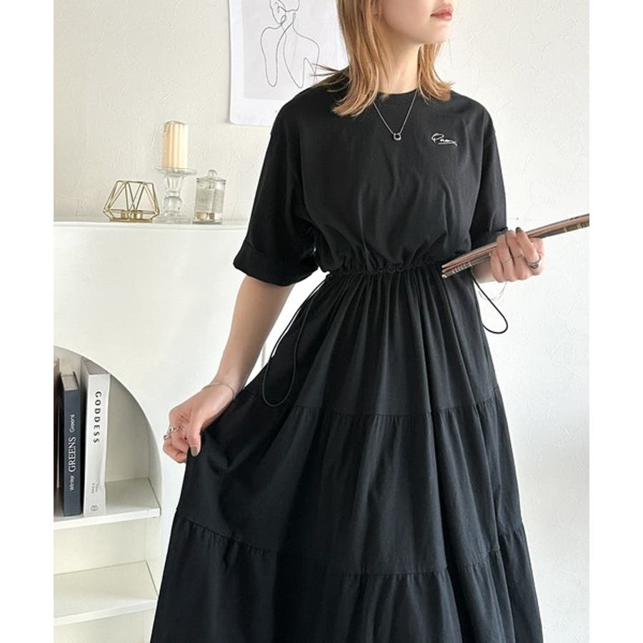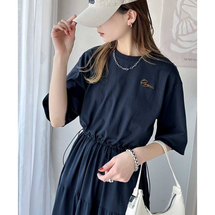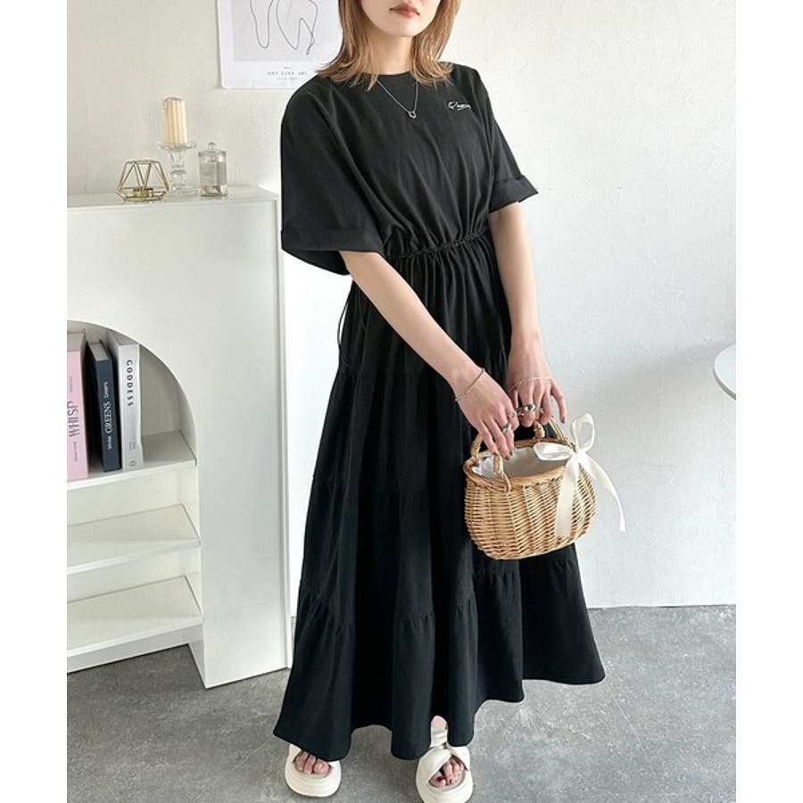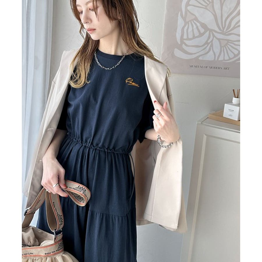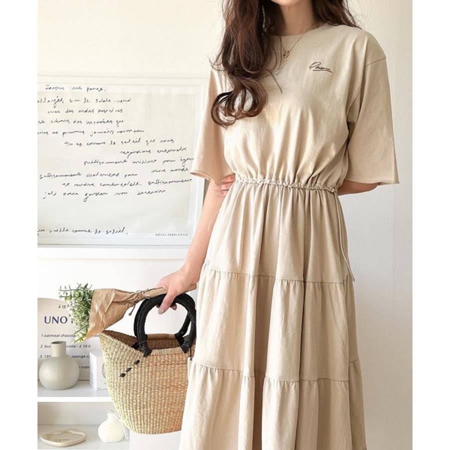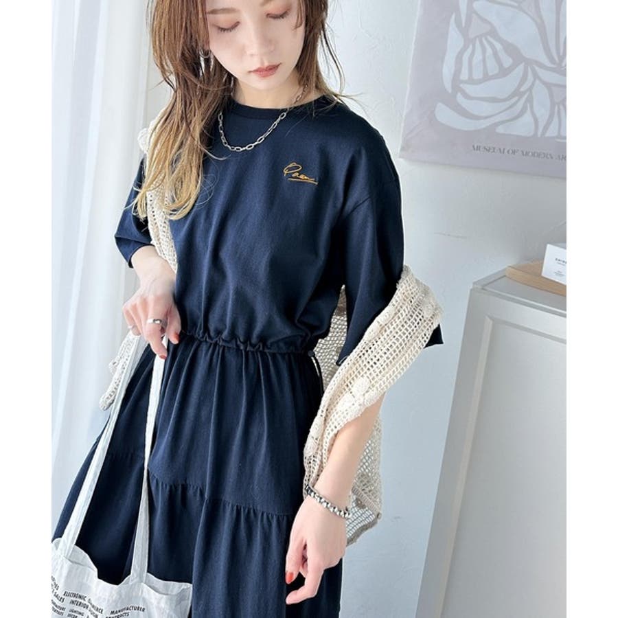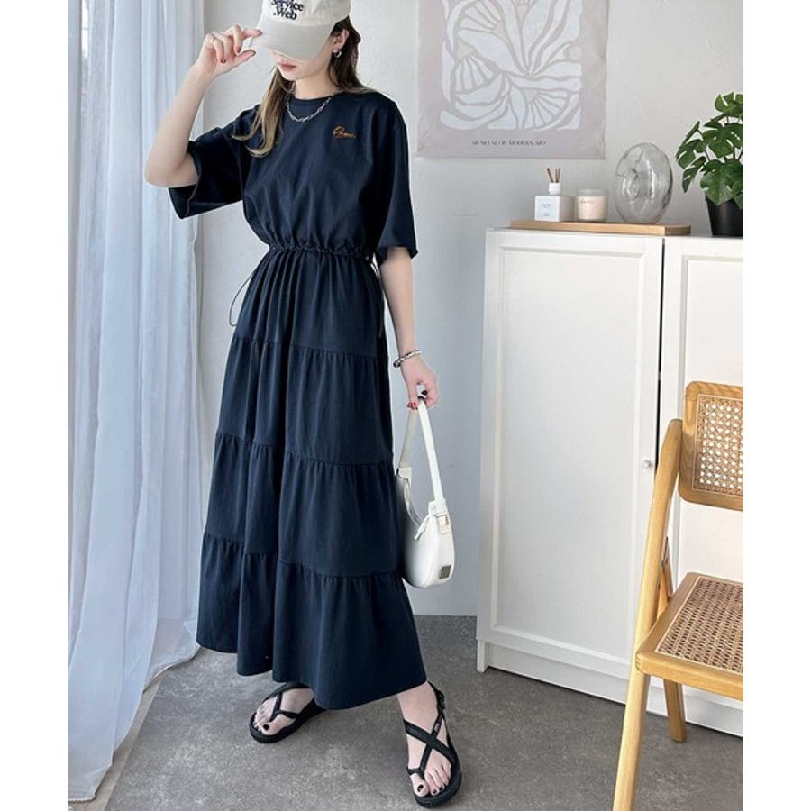 女性らしさを引き立てるデザインが魅力。胸刺繍ドロストティアードワンピース