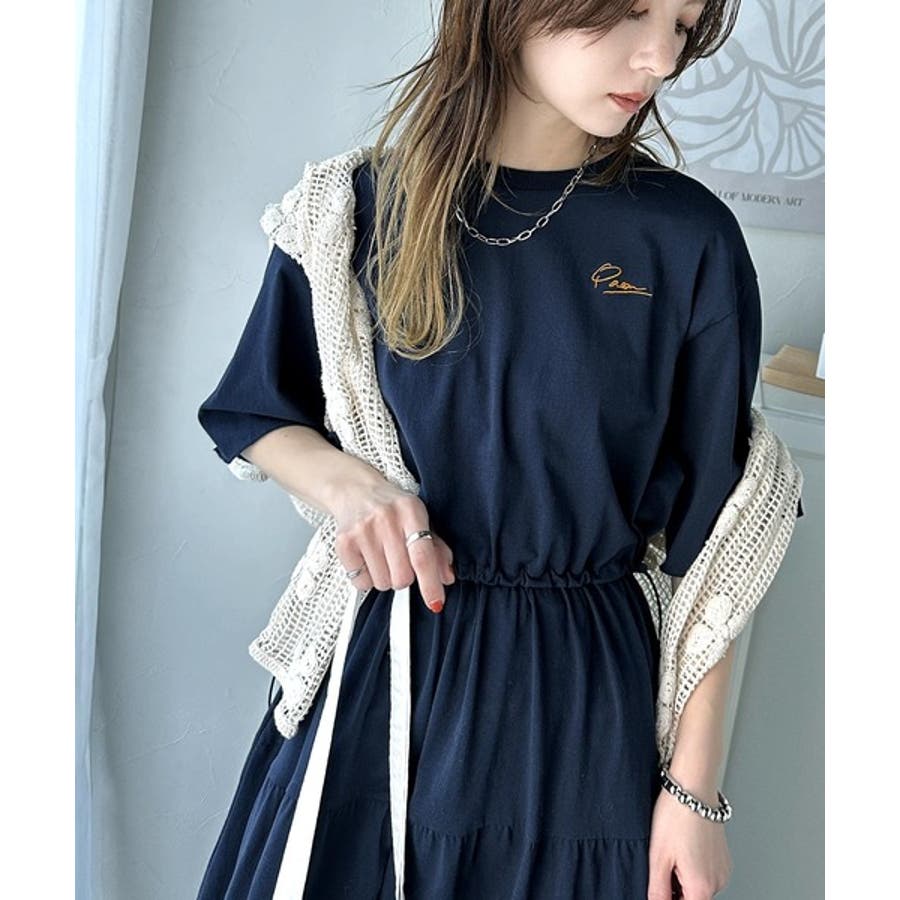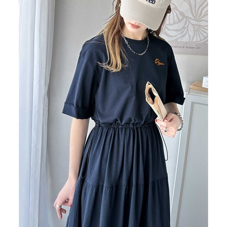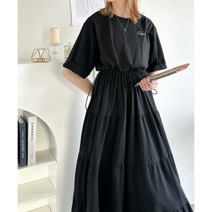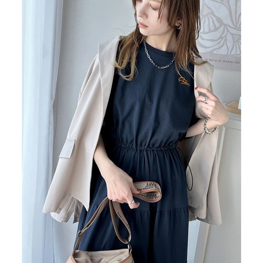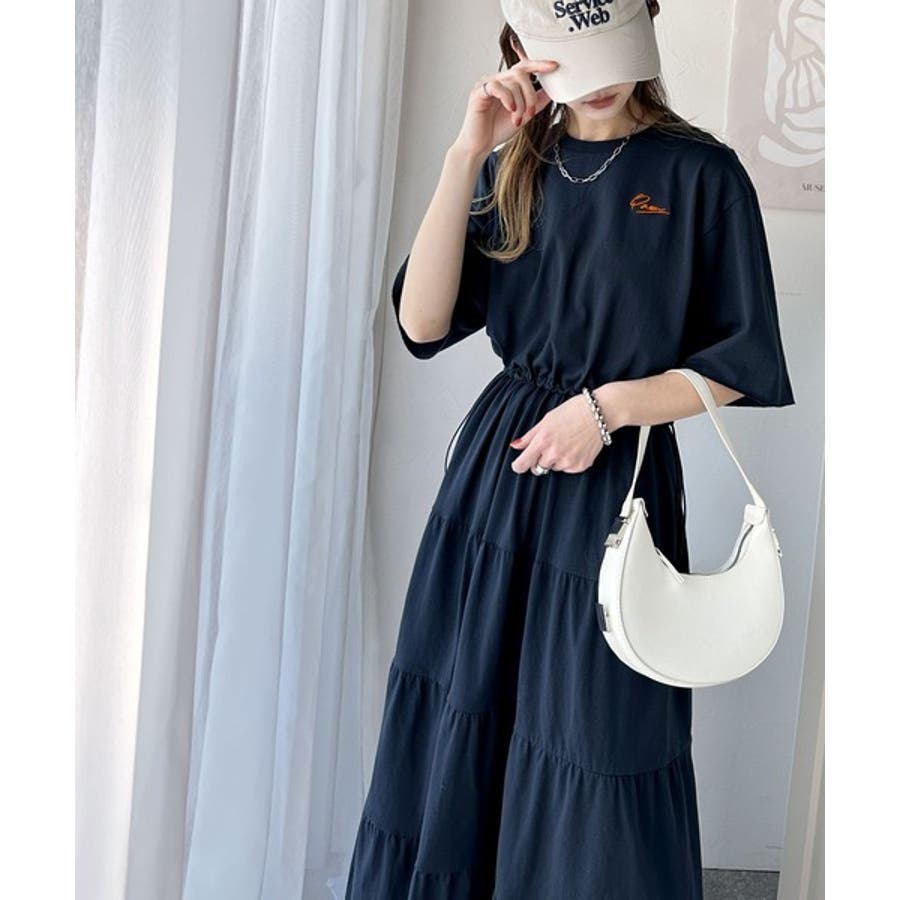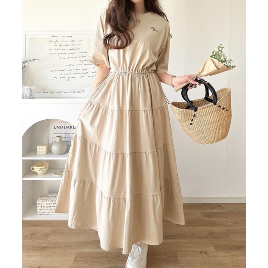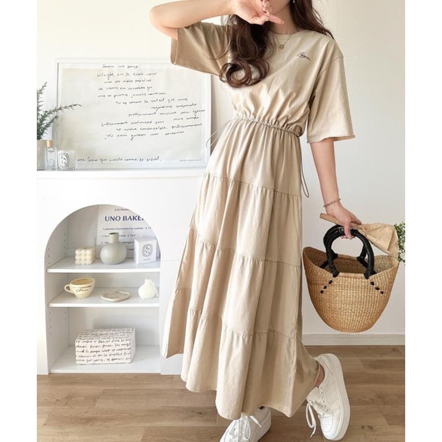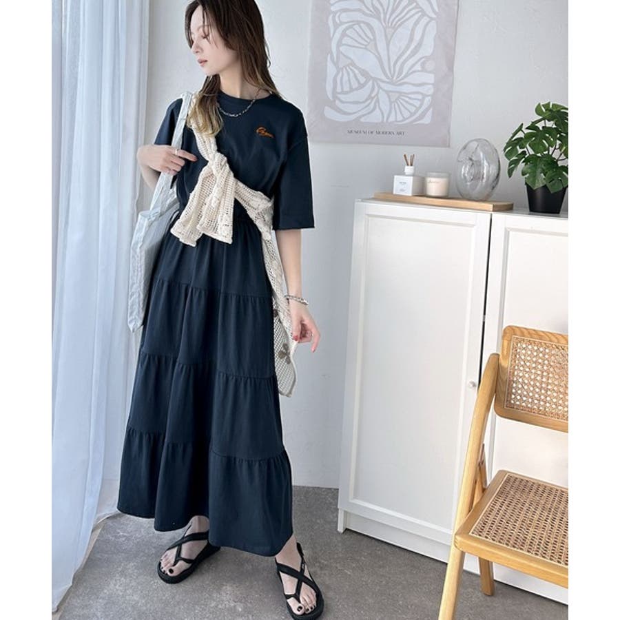 女性らしさを引き立てるデザインが魅力。胸刺繍ドロストティアードワンピース