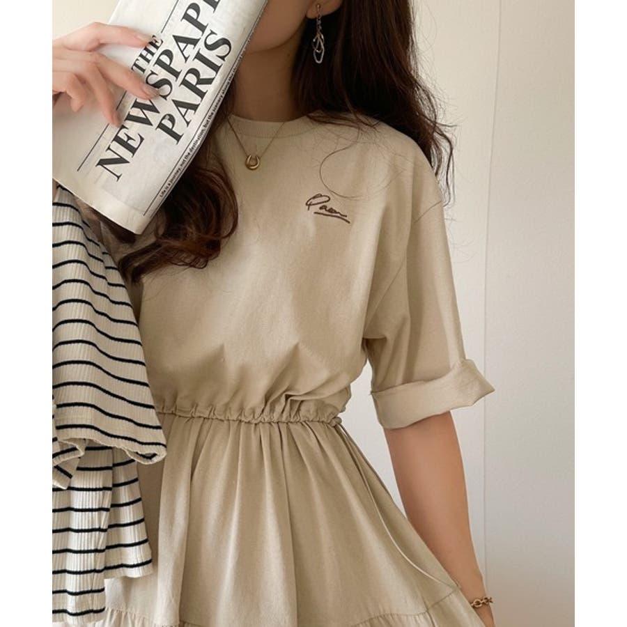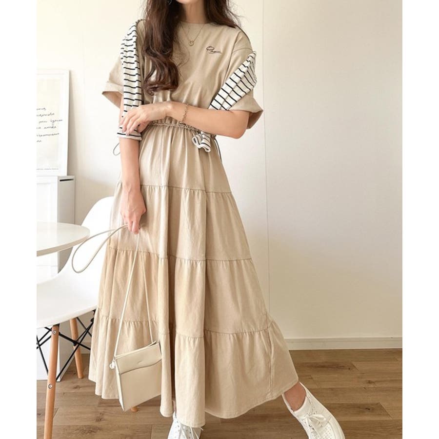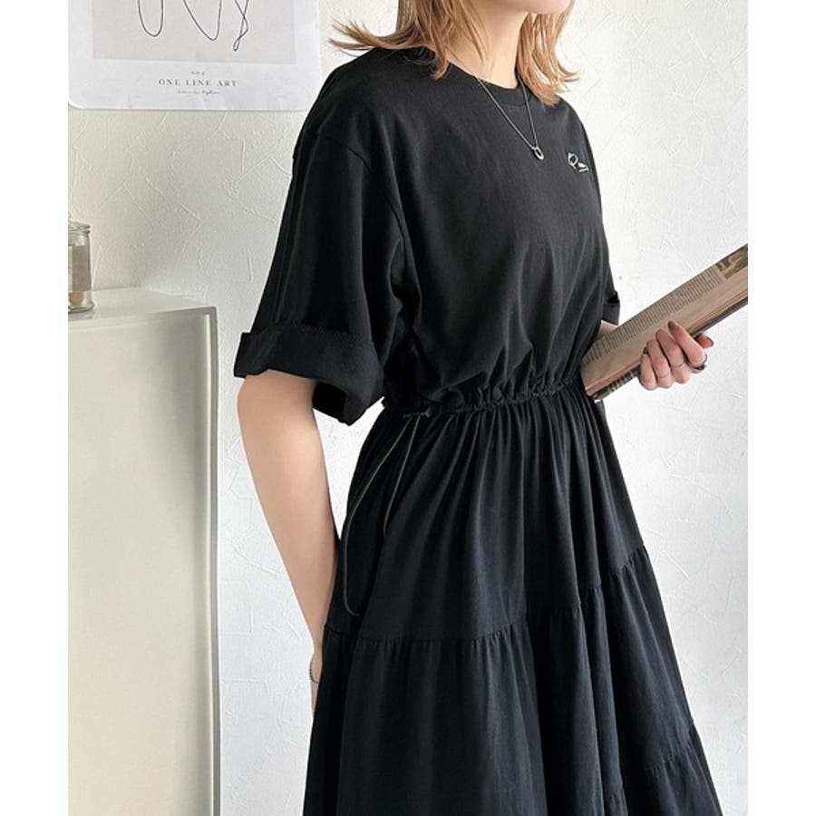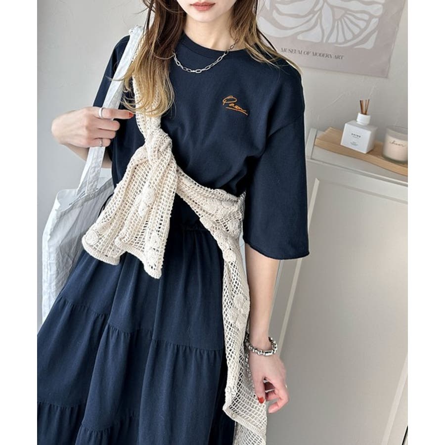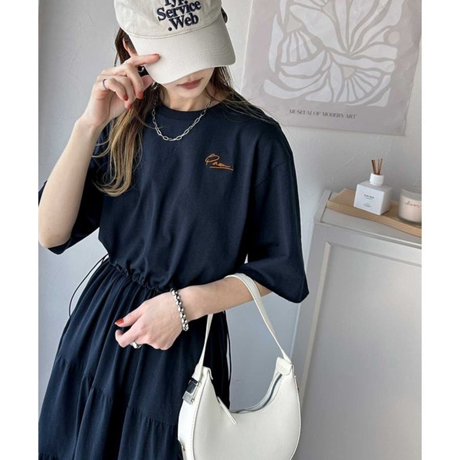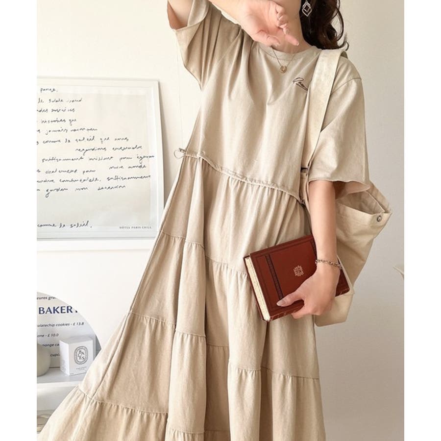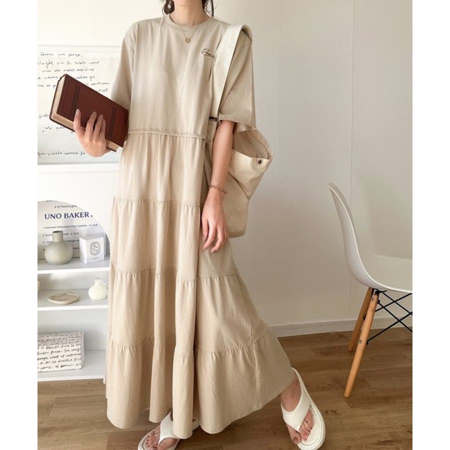 女性らしさを引き立てるデザインが魅力。胸刺繍ドロストティアードワンピース