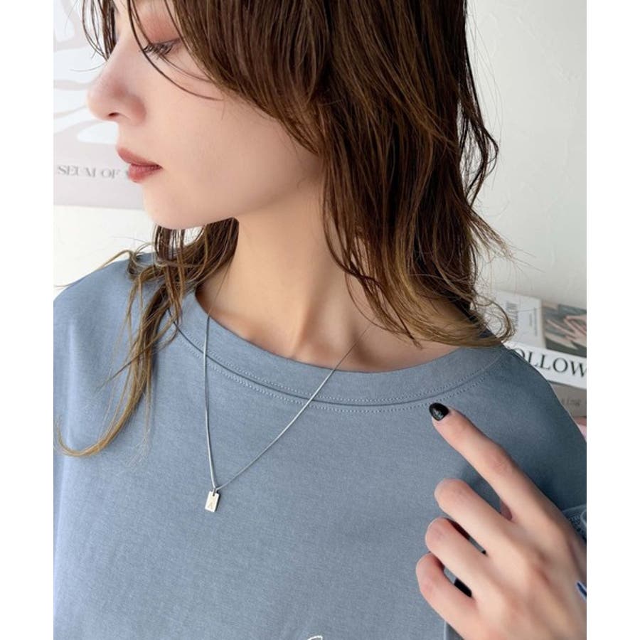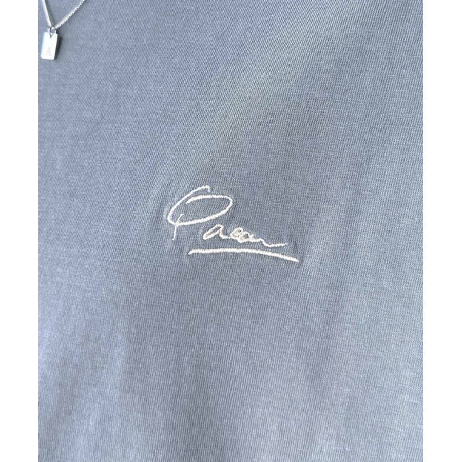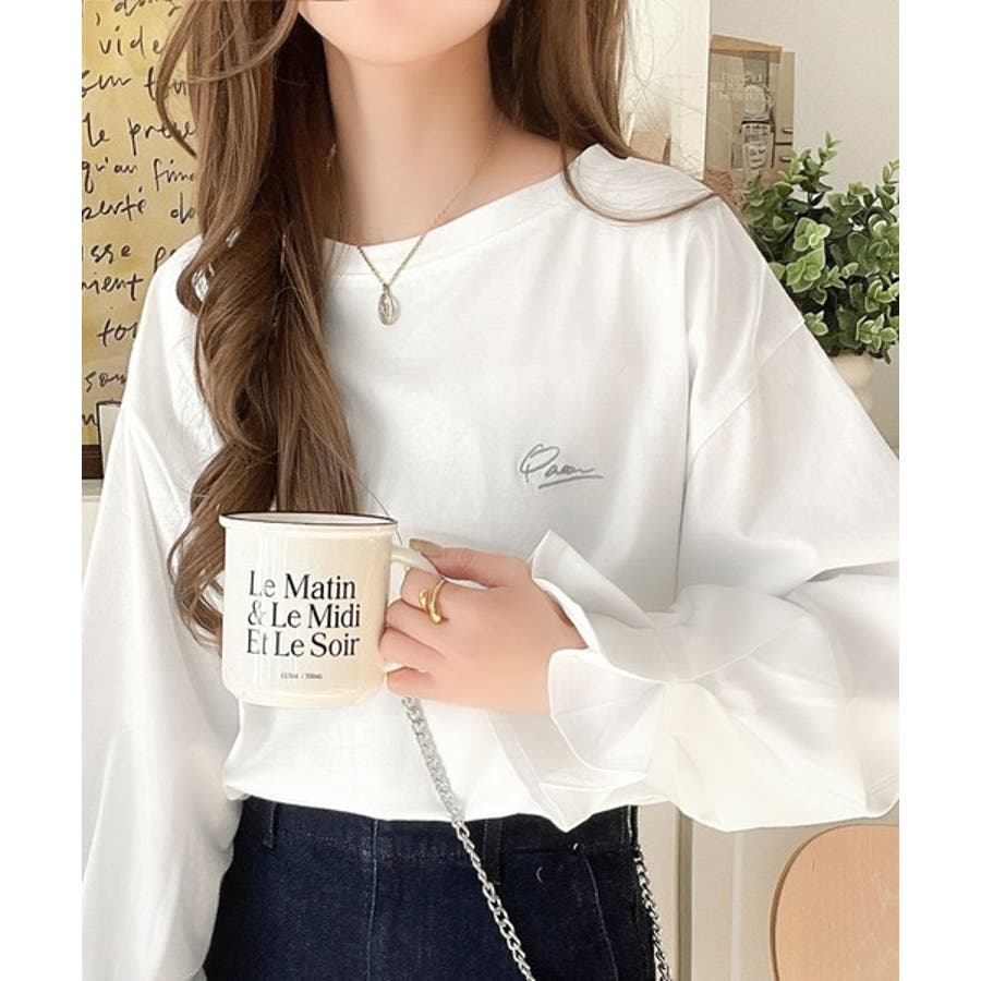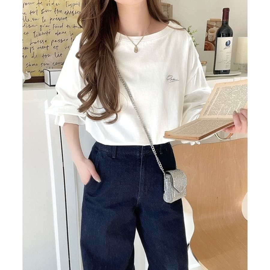 胸元に施された繊細な英字刺繍が、さりげないおしゃれ感を演出。