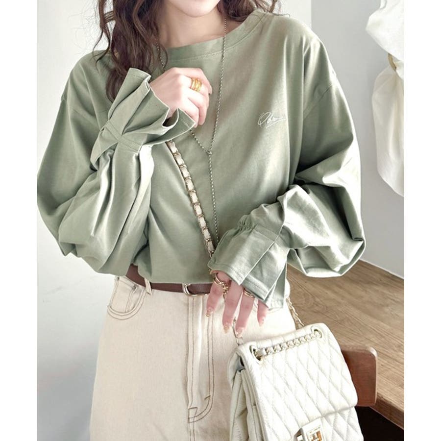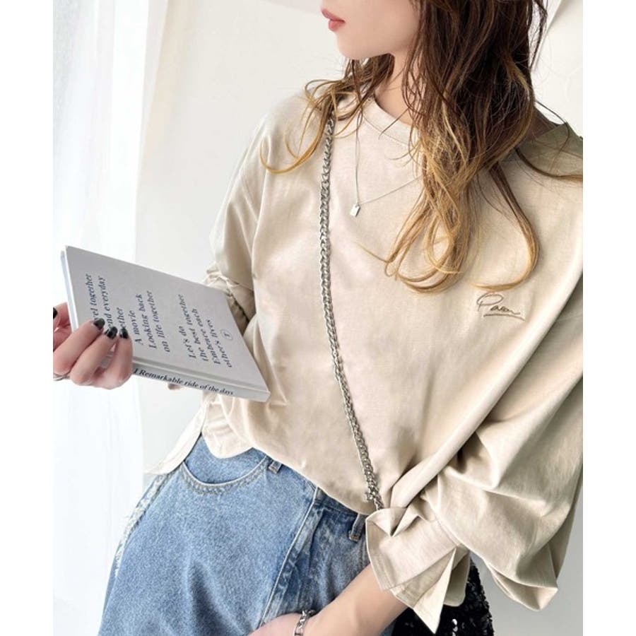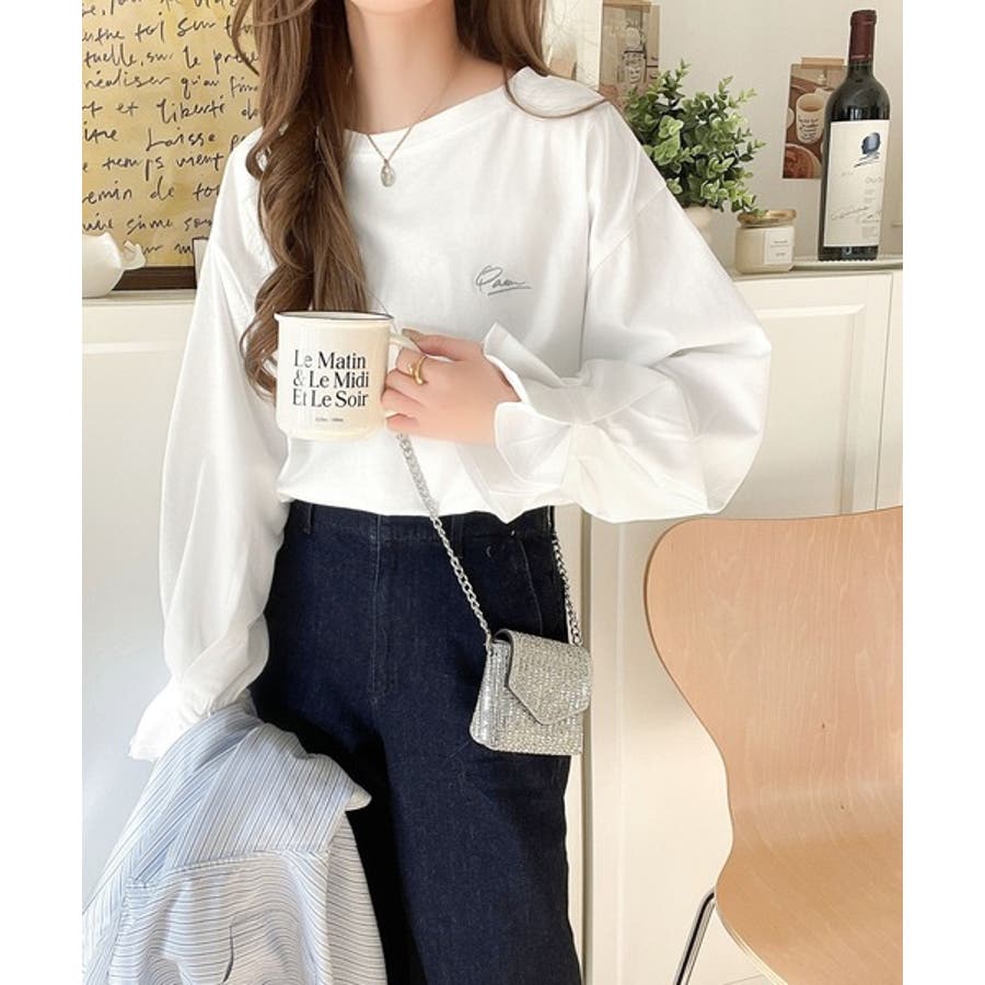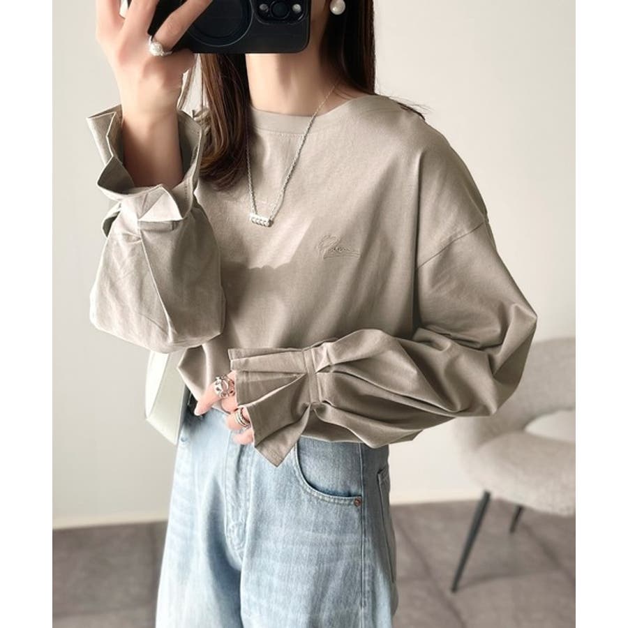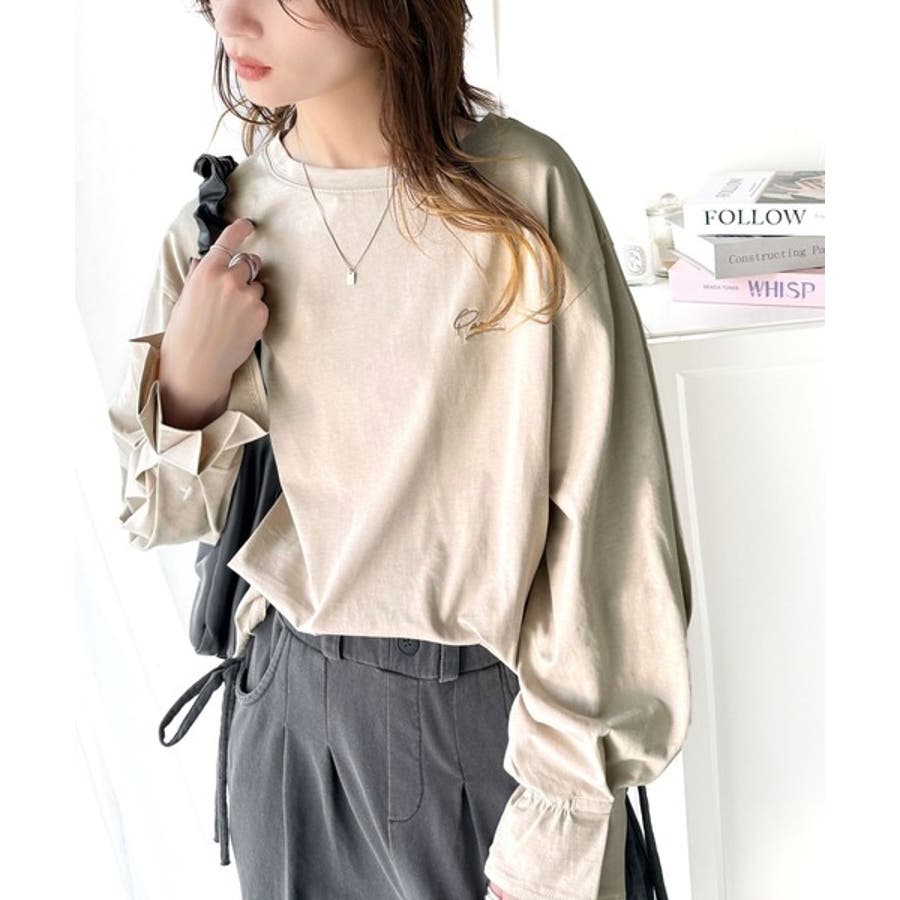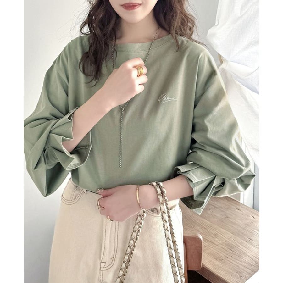 【グレイッシュベージュ】愛らしさを纏った。綿100%英字胸刺繍キャンディースリーブシルケットカットソー