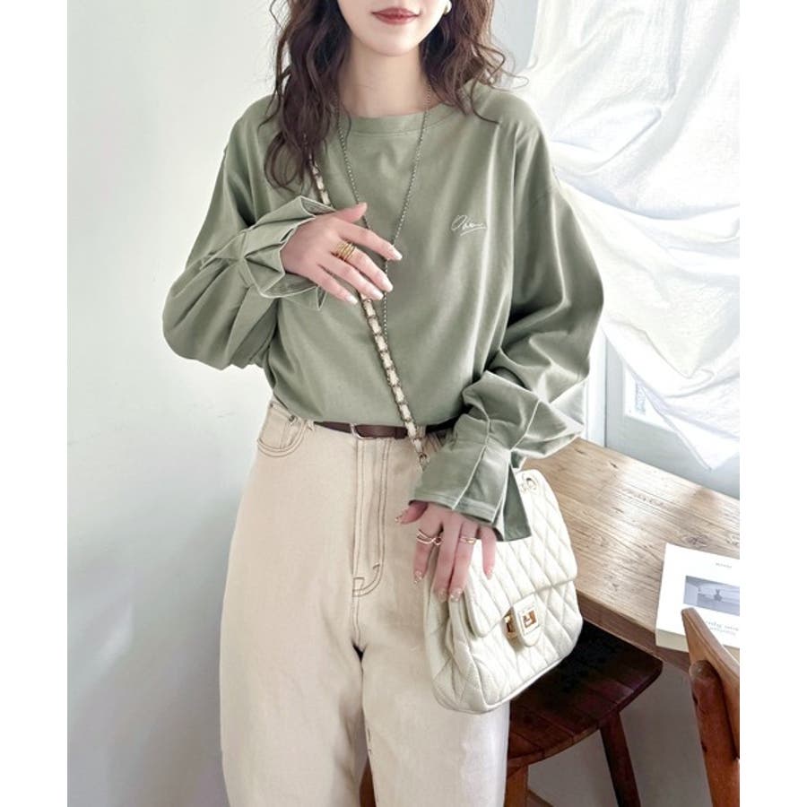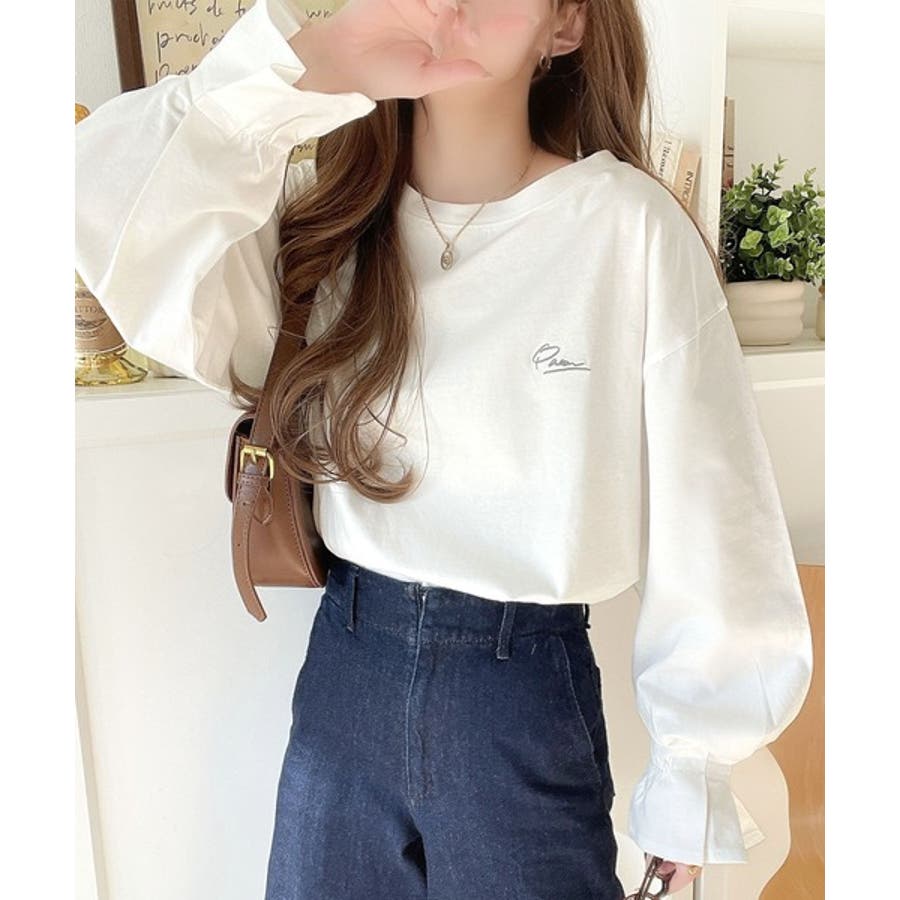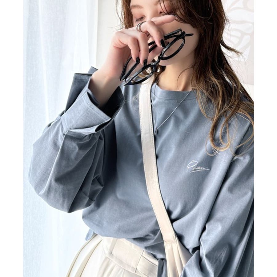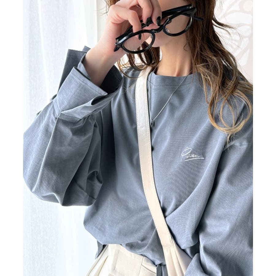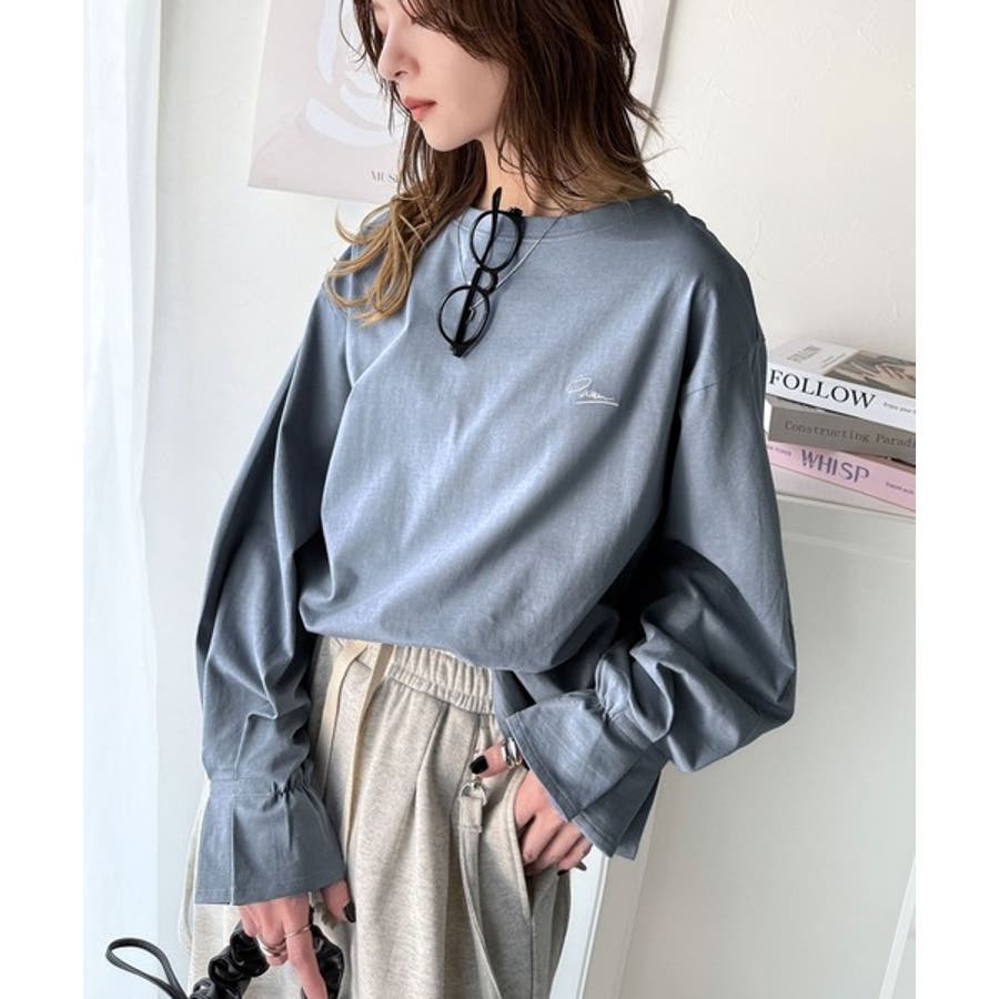 【グレイッシュベージュ】愛らしさを纏った。綿100%英字胸刺繍キャンディースリーブシルケットカットソー