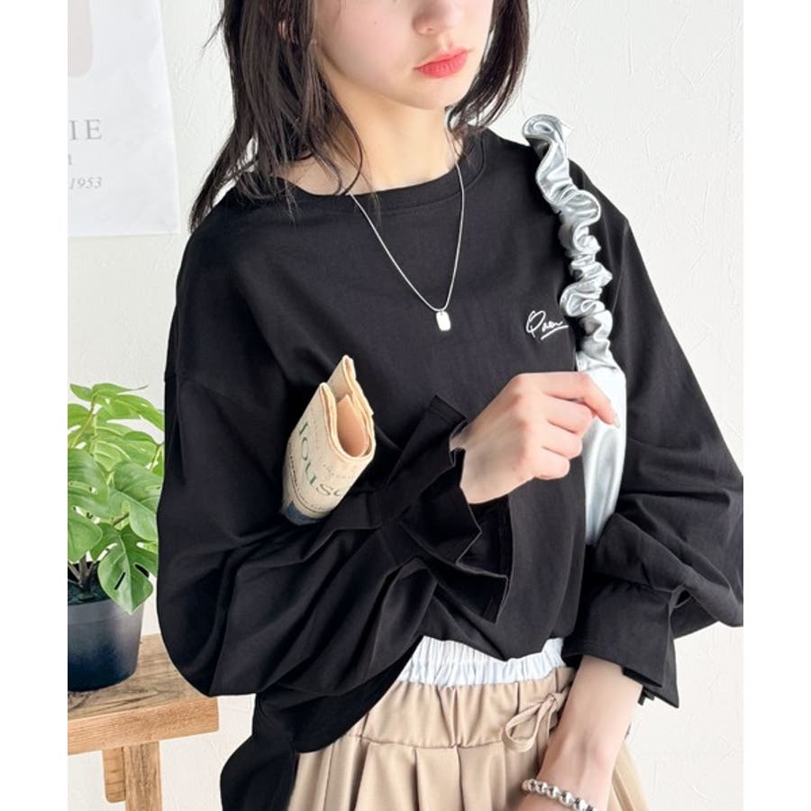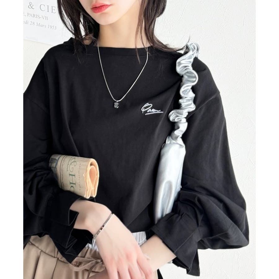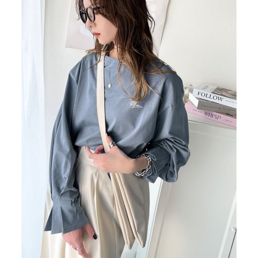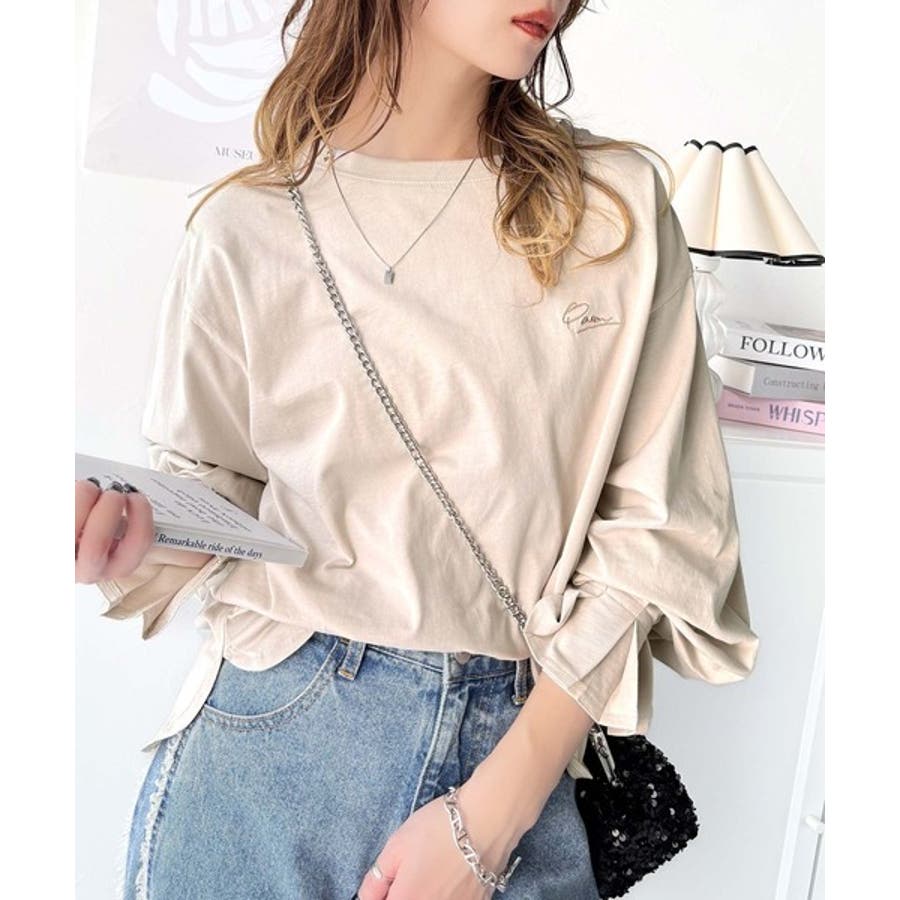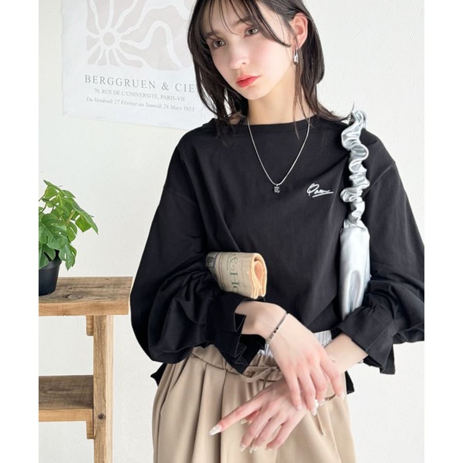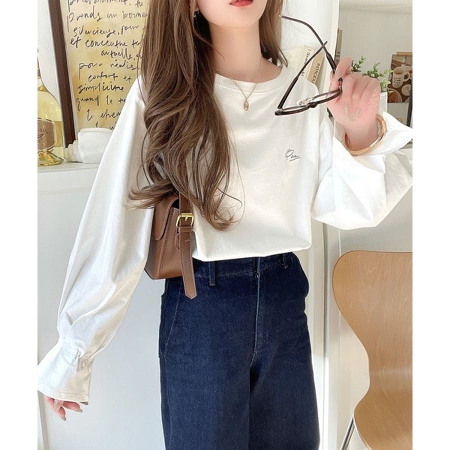 【グレイッシュベージュ】愛らしさを纏った。綿100%英字胸刺繍キャンディースリーブシルケットカットソー