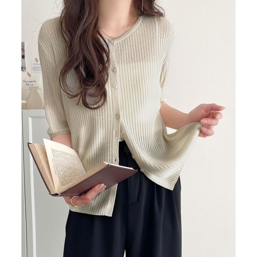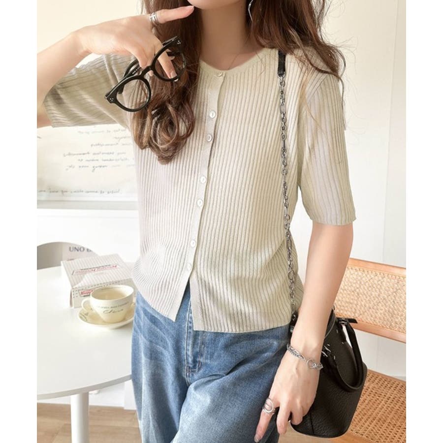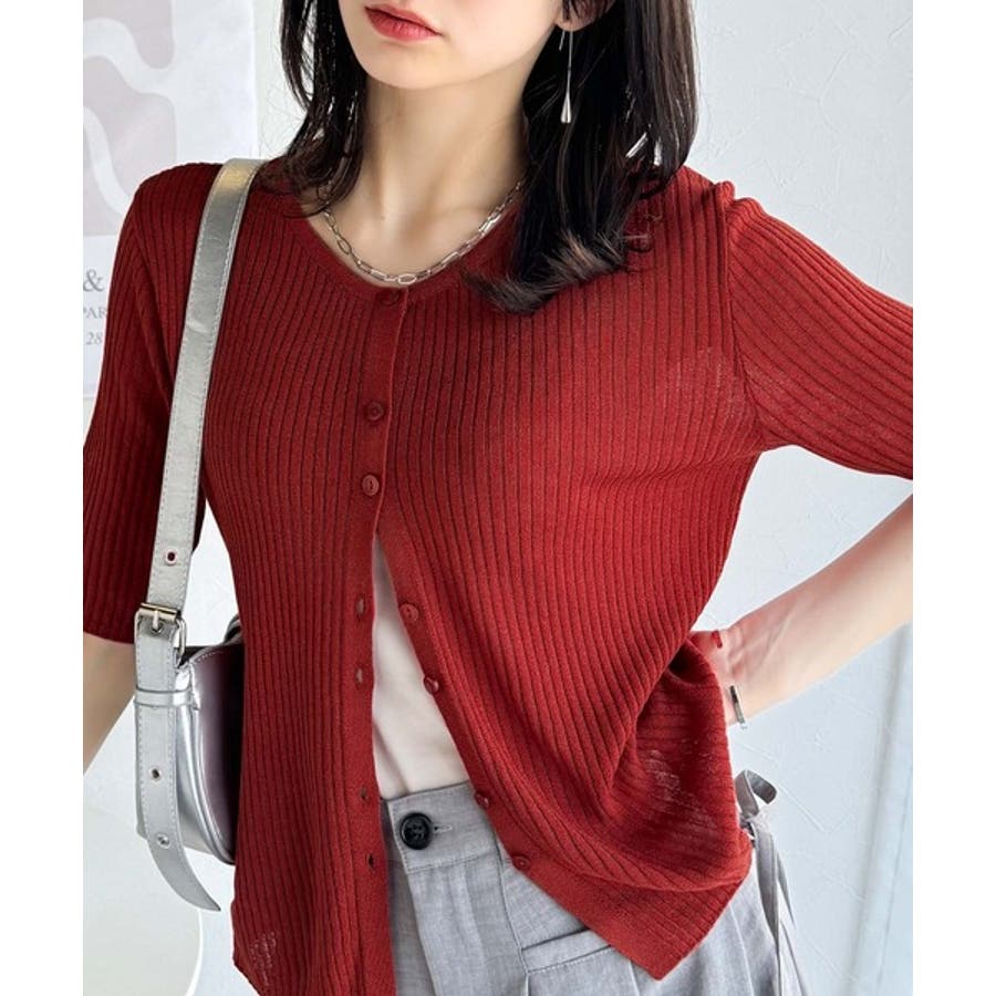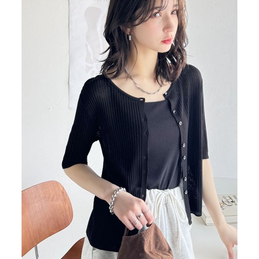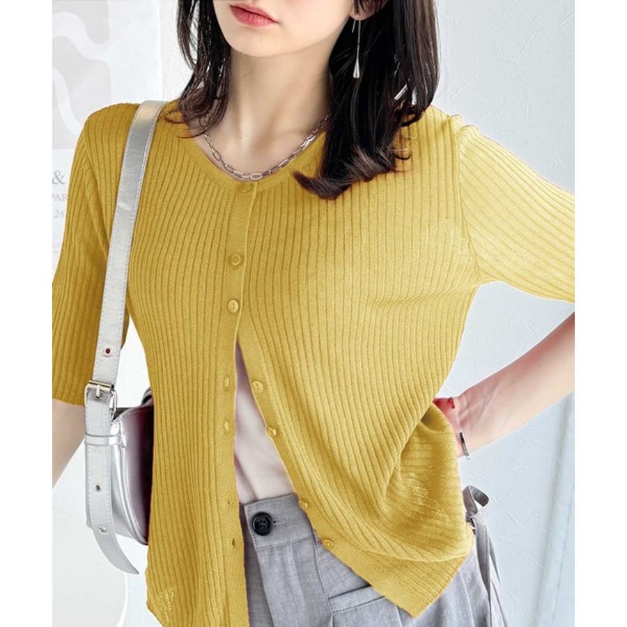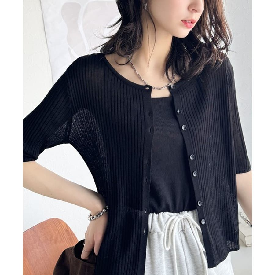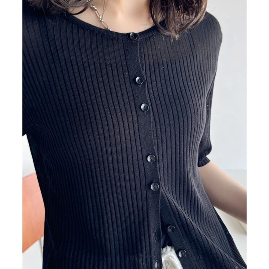 シアーな素材感と、縦ラインを強調するリブ編みが魅力の半袖カーディガン。