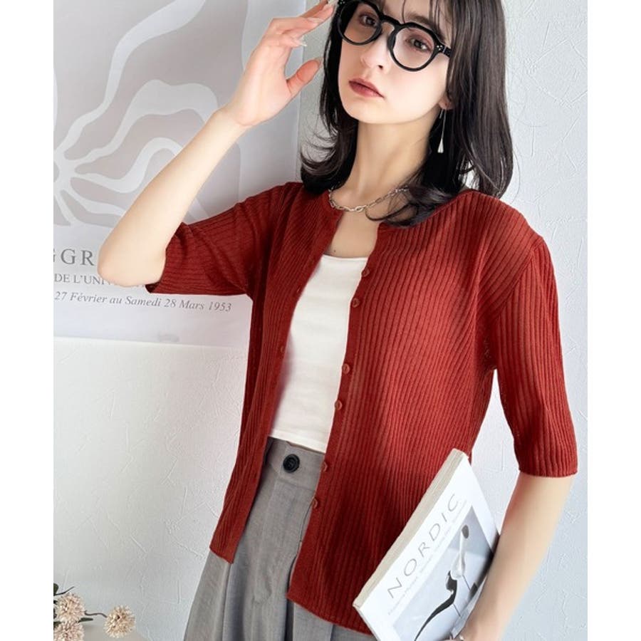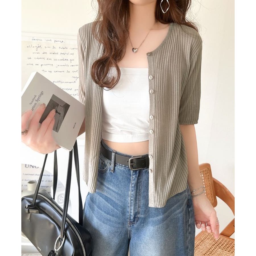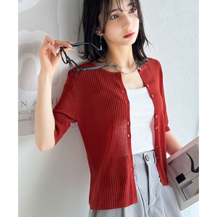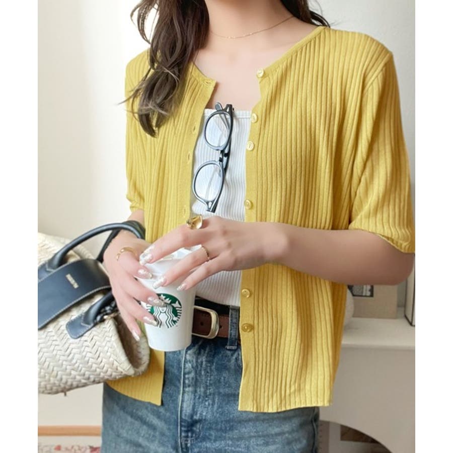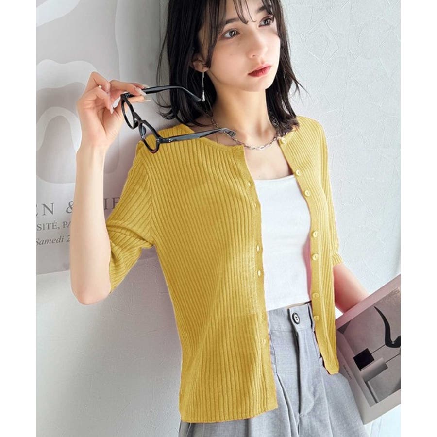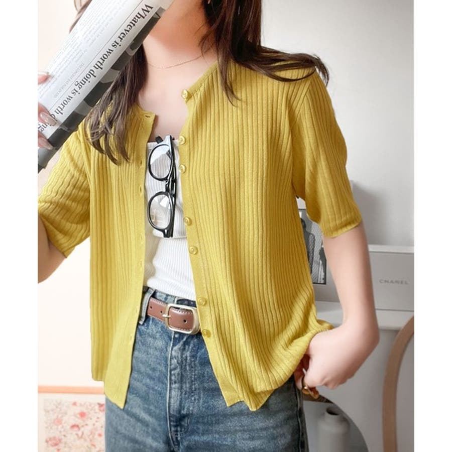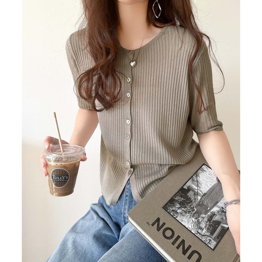 シアーな素材感と、縦ラインを強調するリブ編みが魅力の半袖カーディガン。