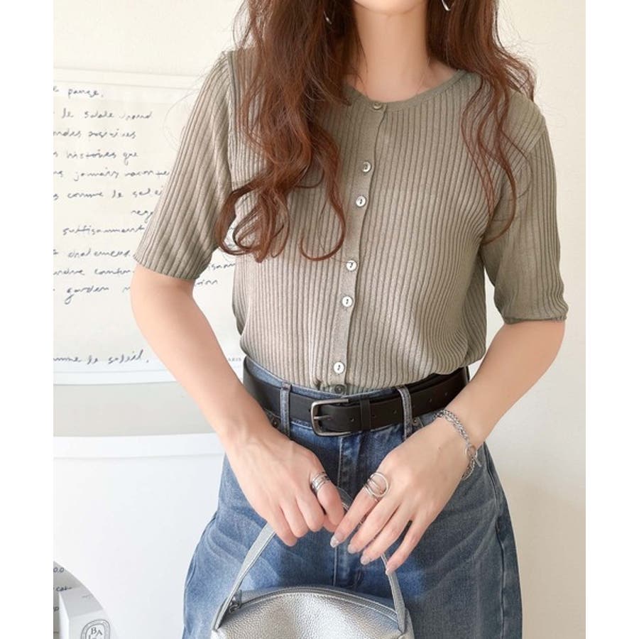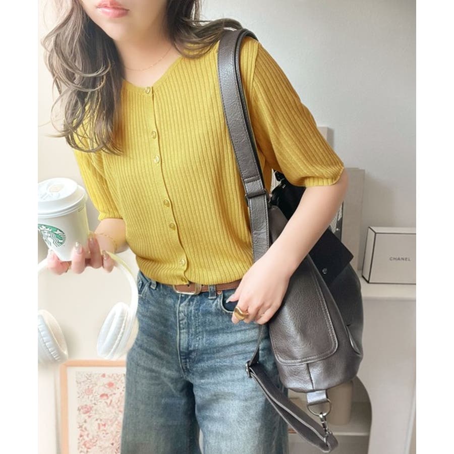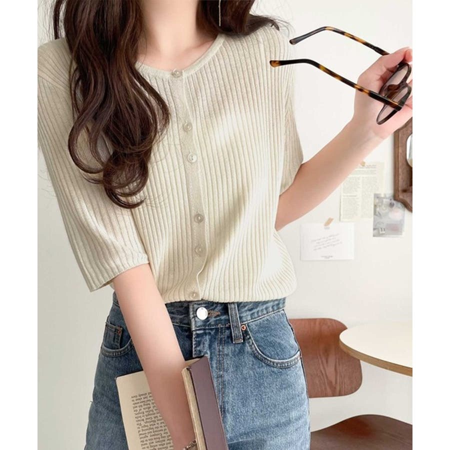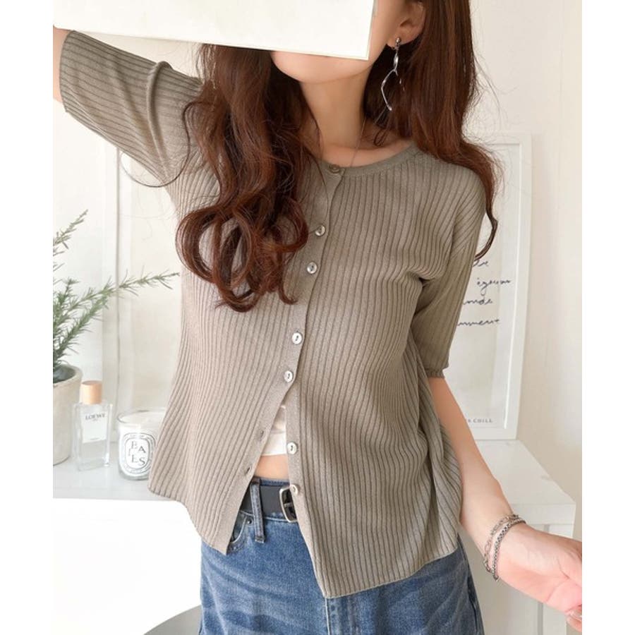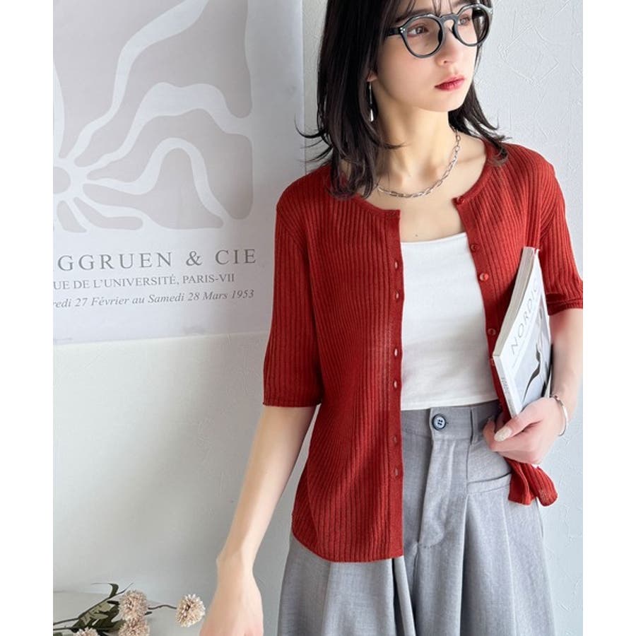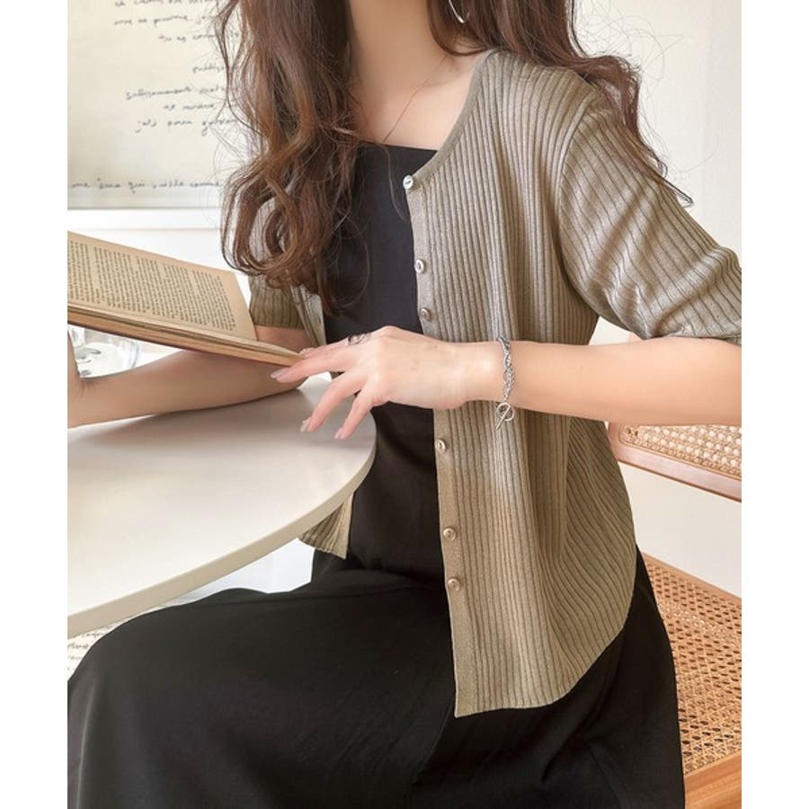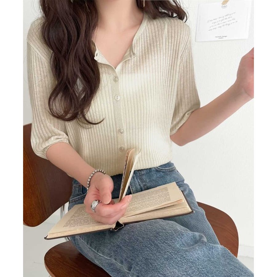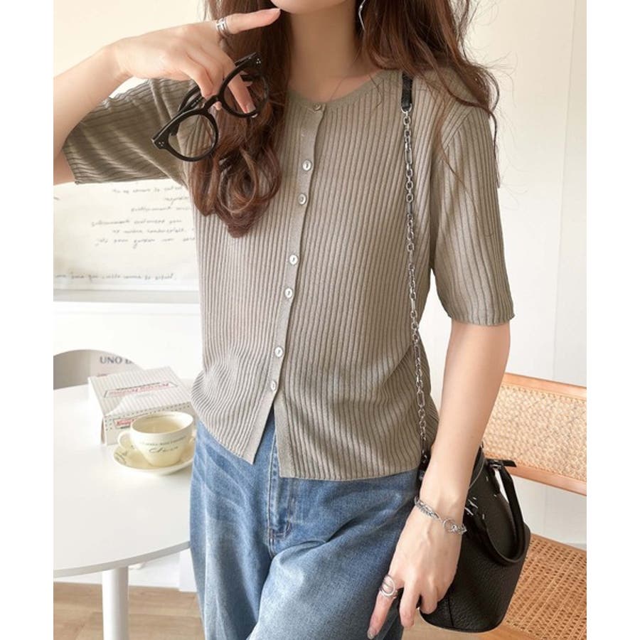 シアーな素材感と、縦ラインを強調するリブ編みが魅力の半袖カーディガン。