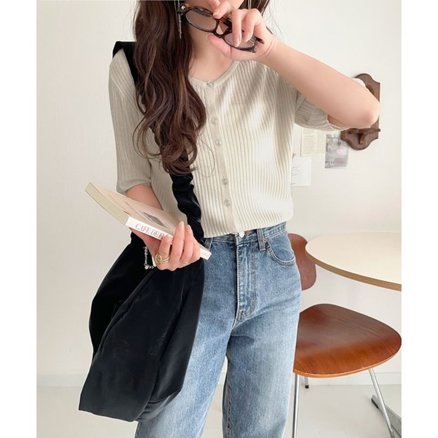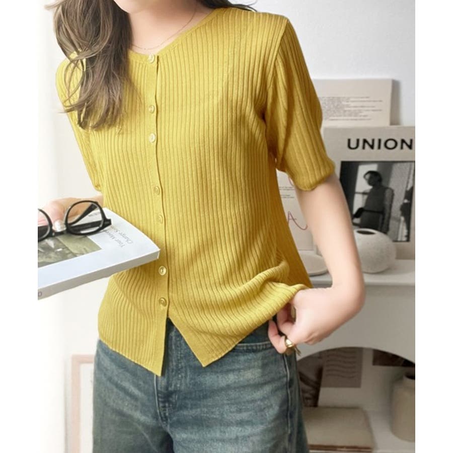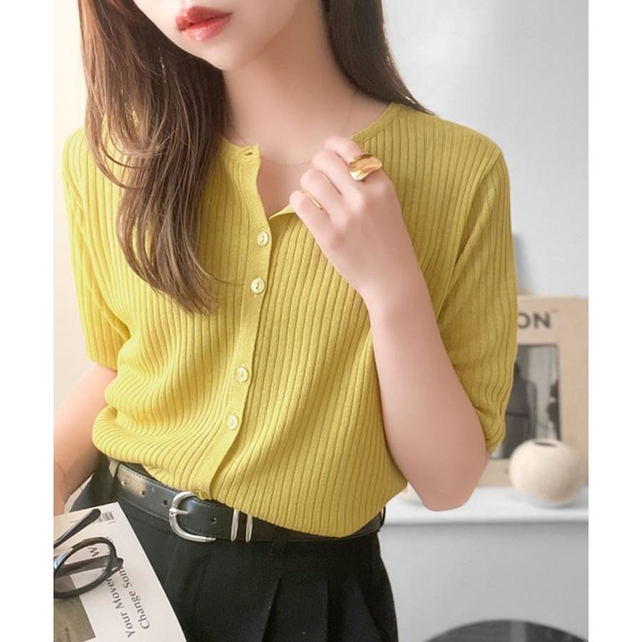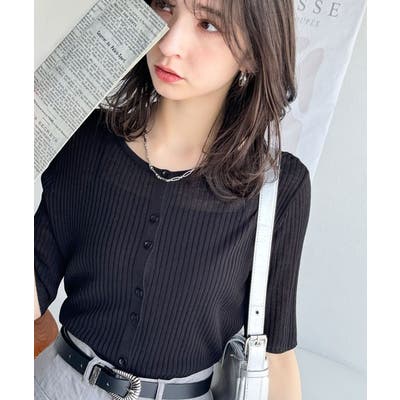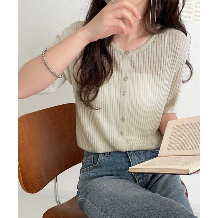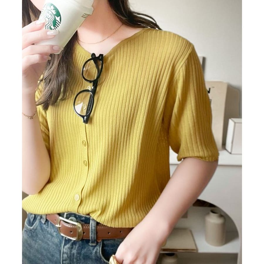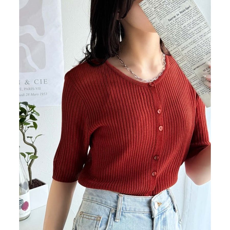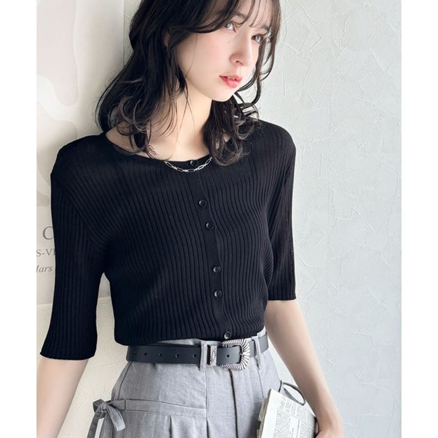 シアーな素材感と、縦ラインを強調するリブ編みが魅力の半袖カーディガン。