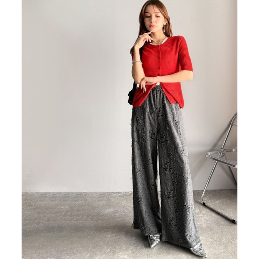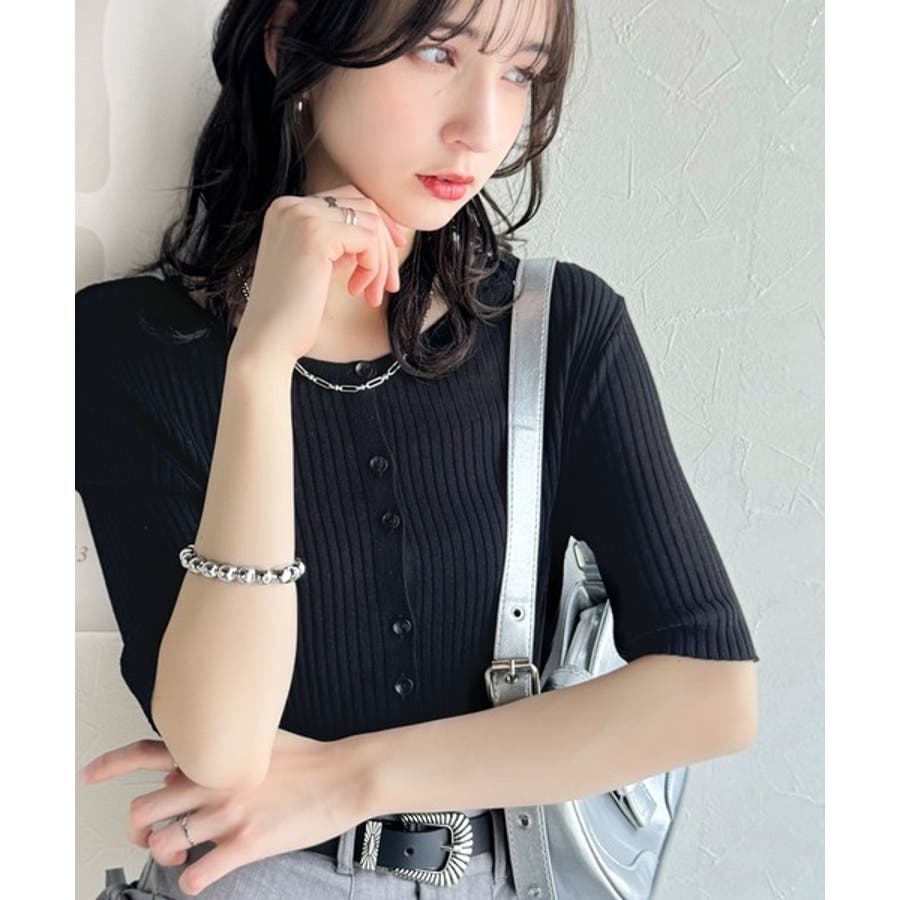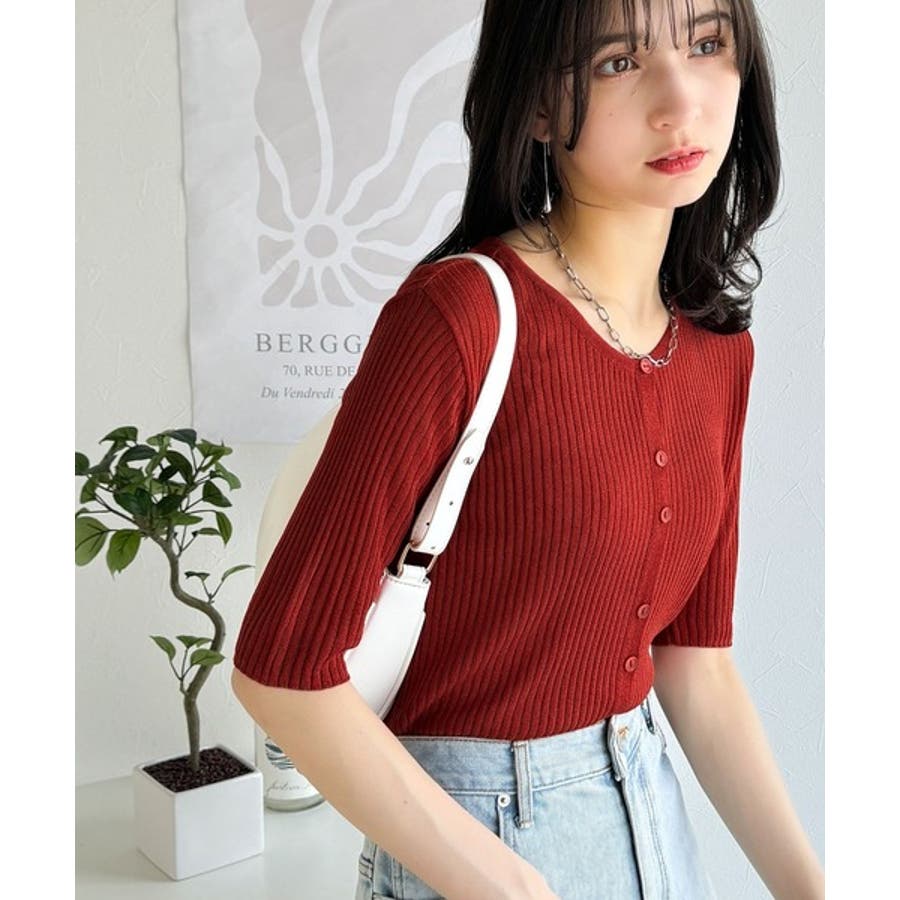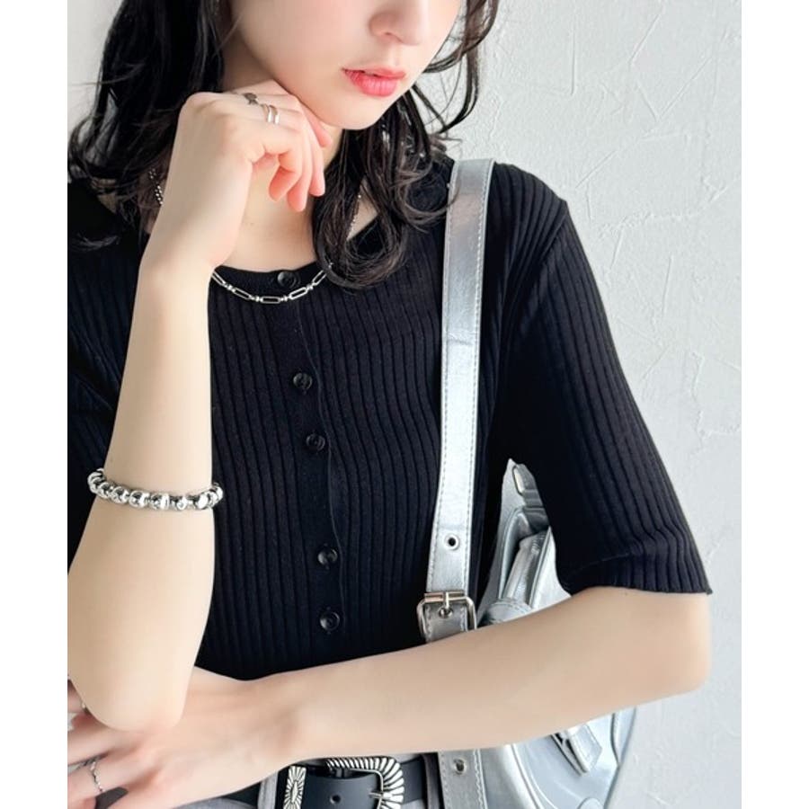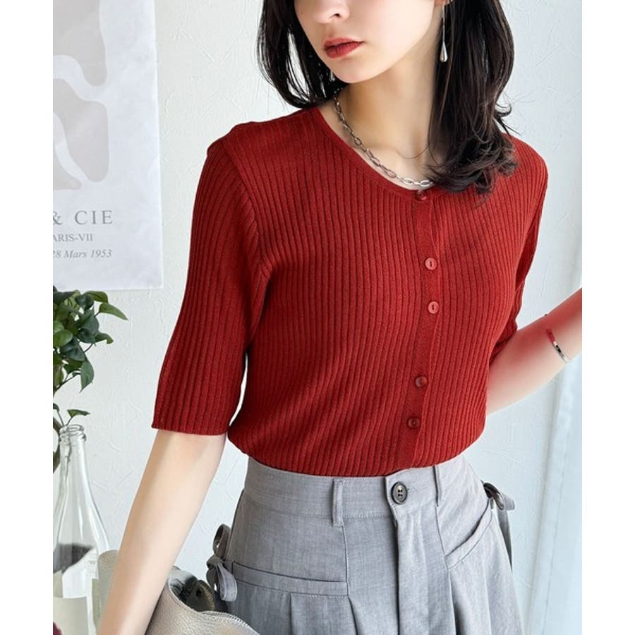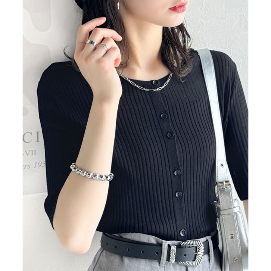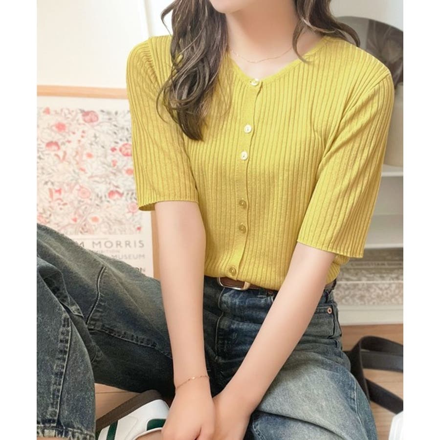 シアーな素材感と、縦ラインを強調するリブ編みが魅力の半袖カーディガン。
