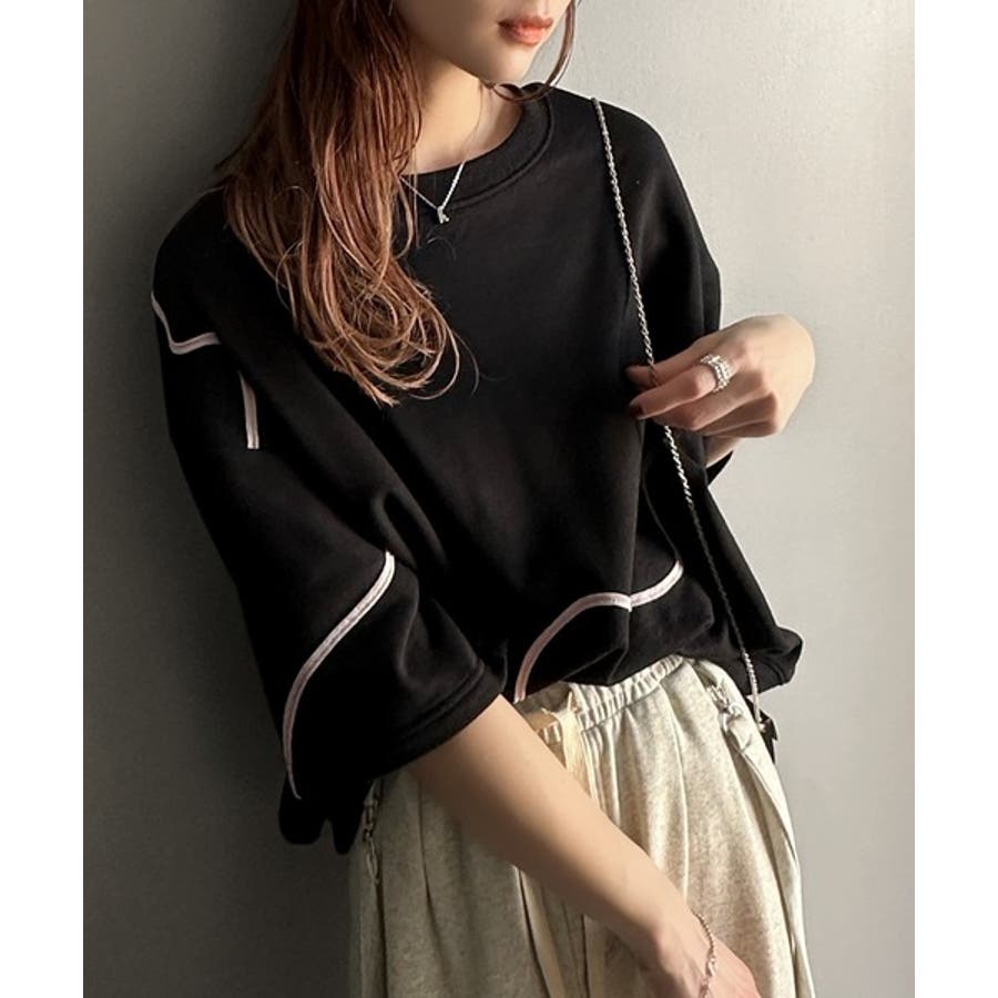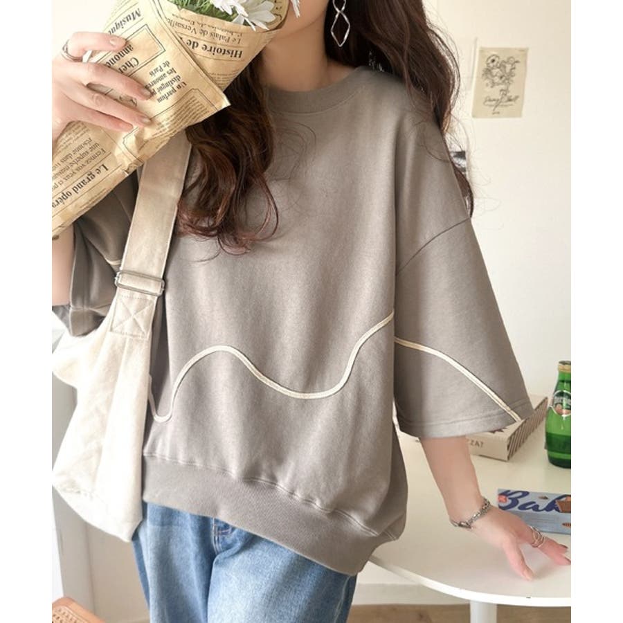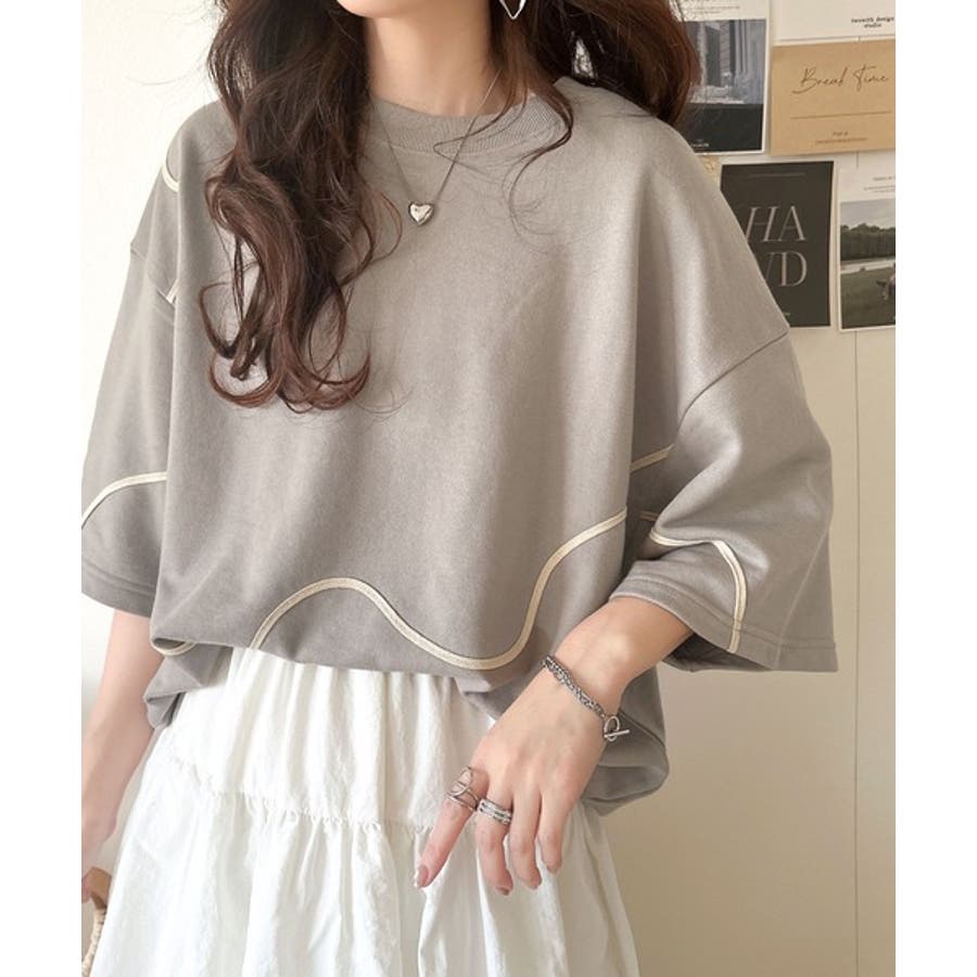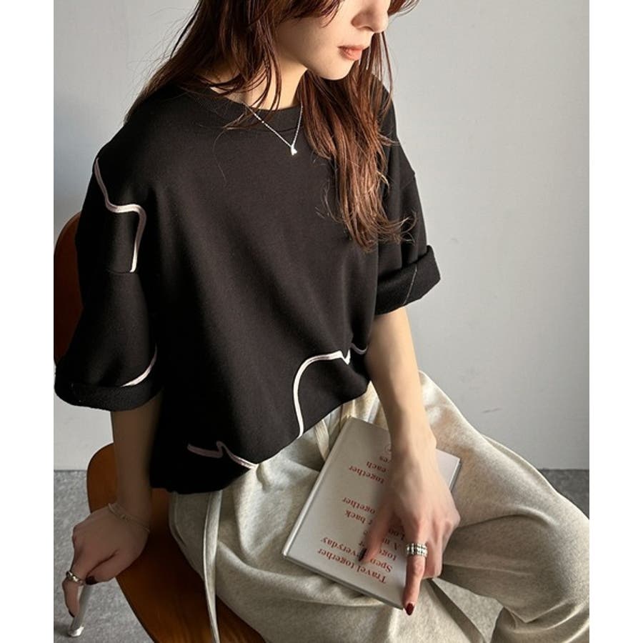 インパクトのあるウェーブコード刺繍のハーフスリーブスウェットトップスは、