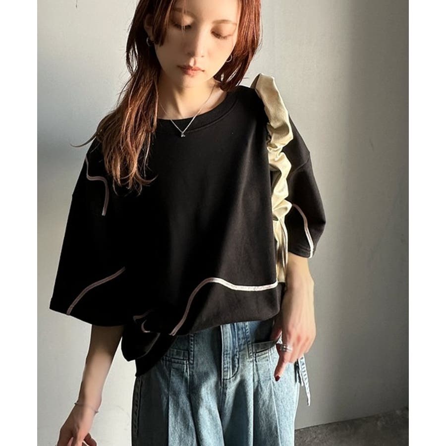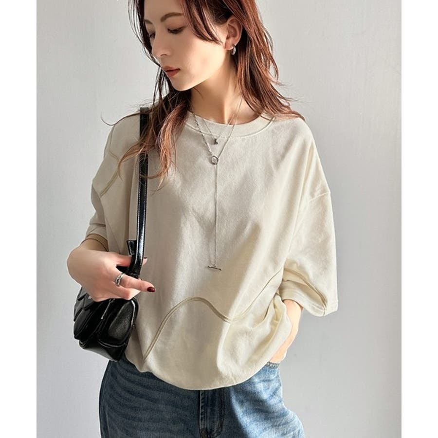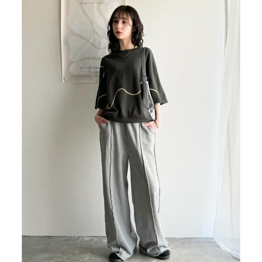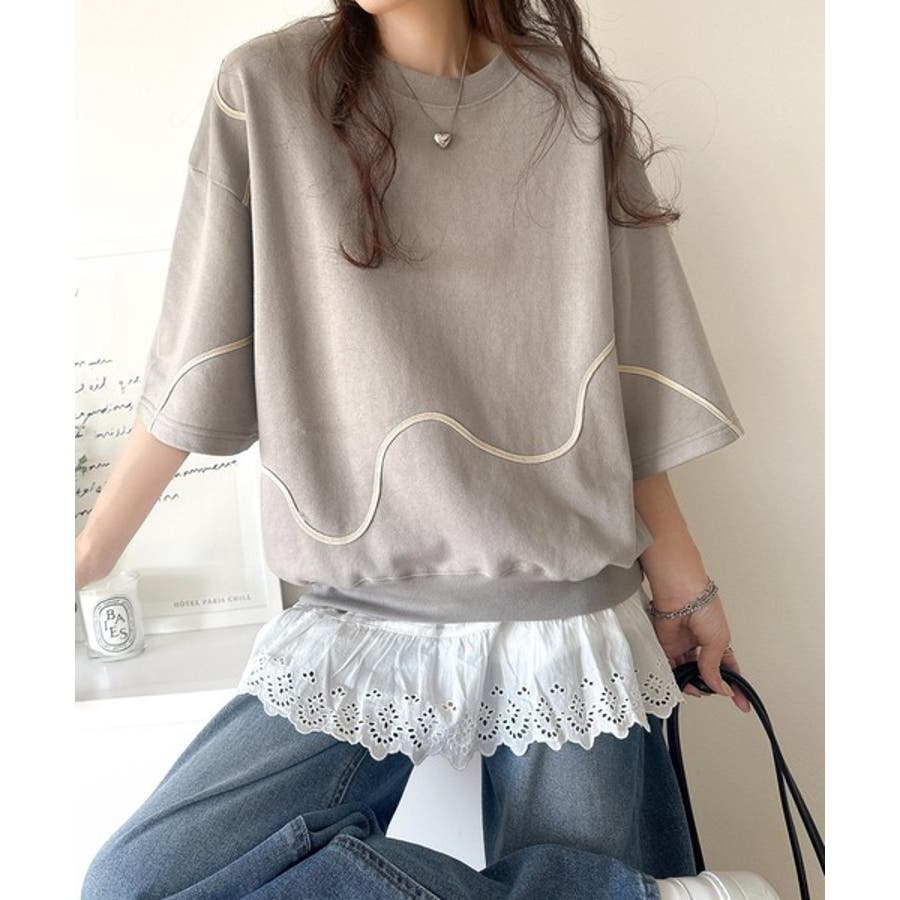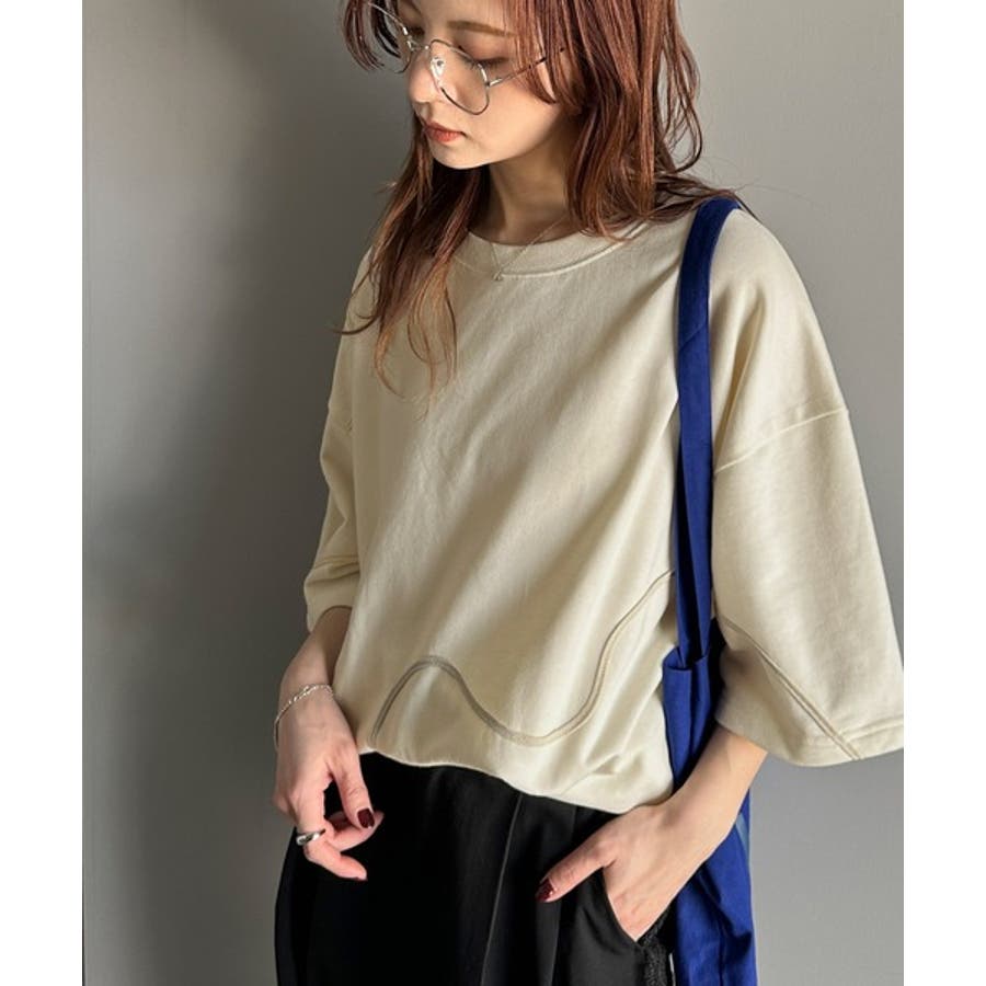 インパクトのあるウェーブコード刺繍のハーフスリーブスウェットトップスは、