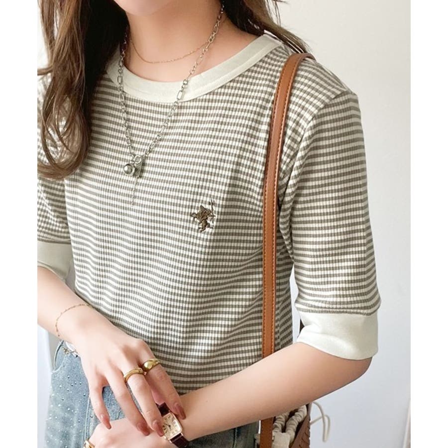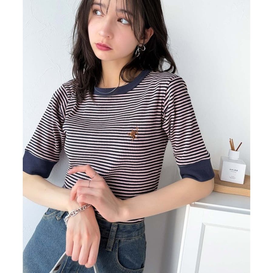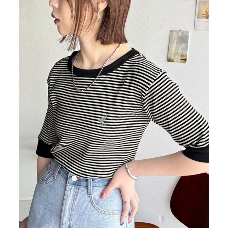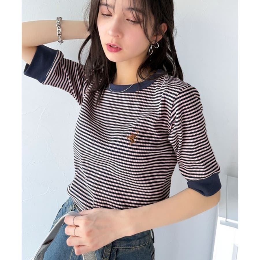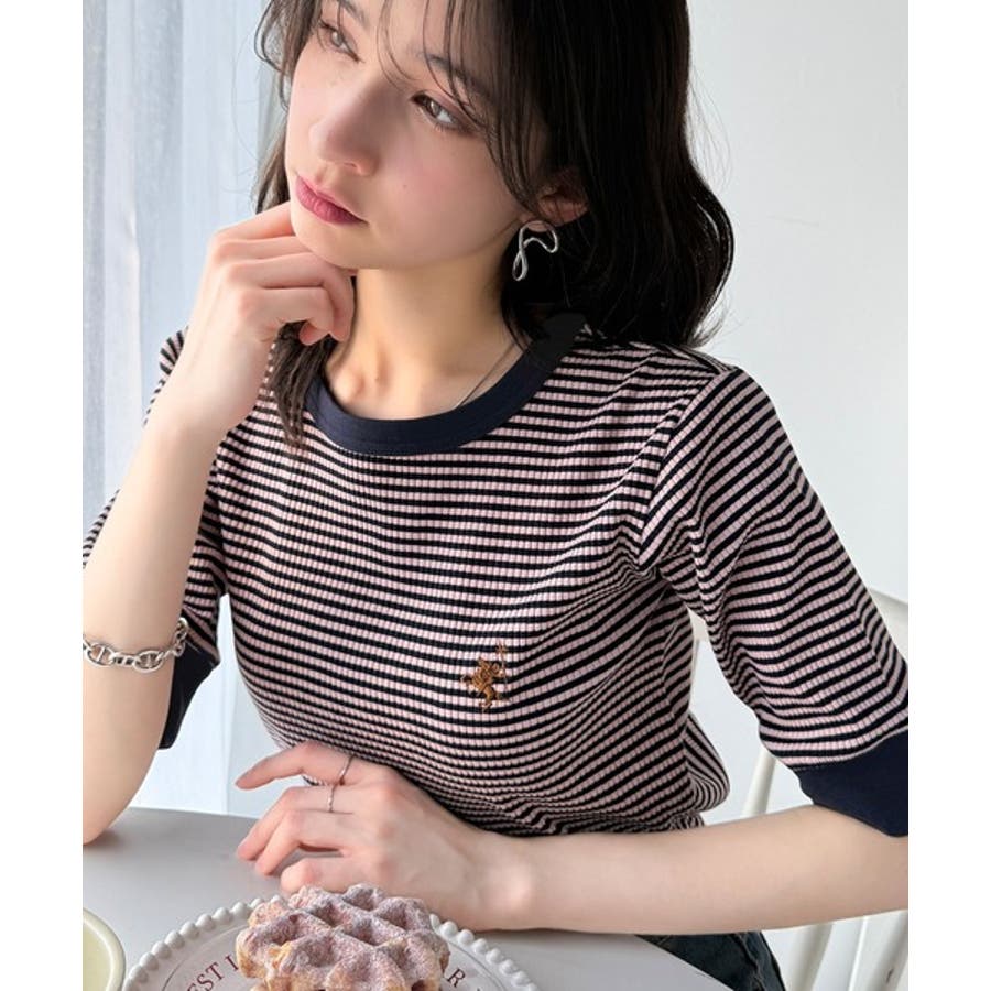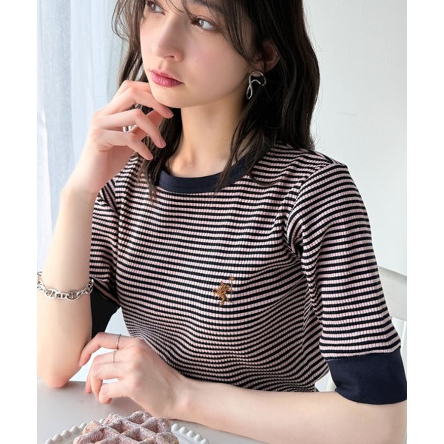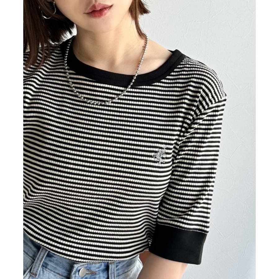 大人可愛いの新定番。袖リンガーボートネック胸刺繍ボーダーTシャツ(半袖)