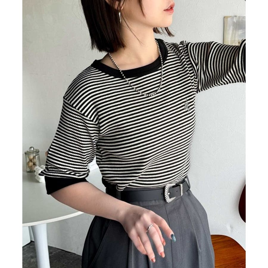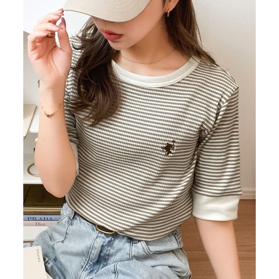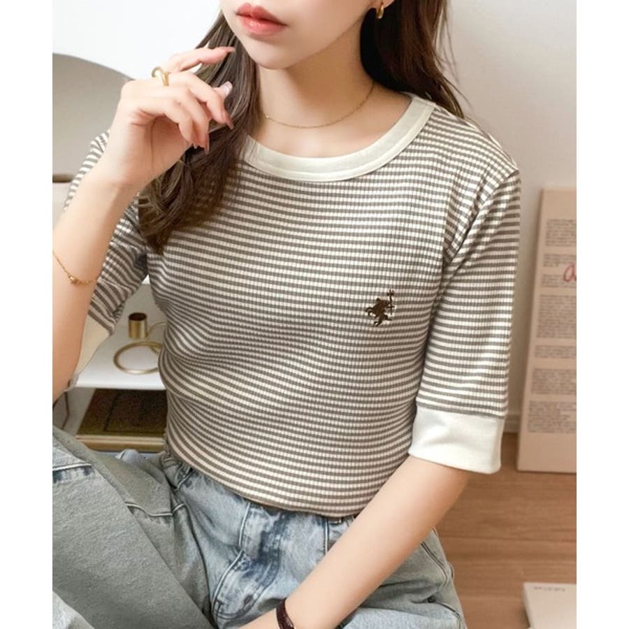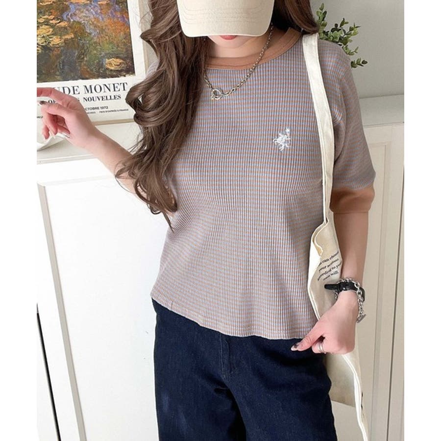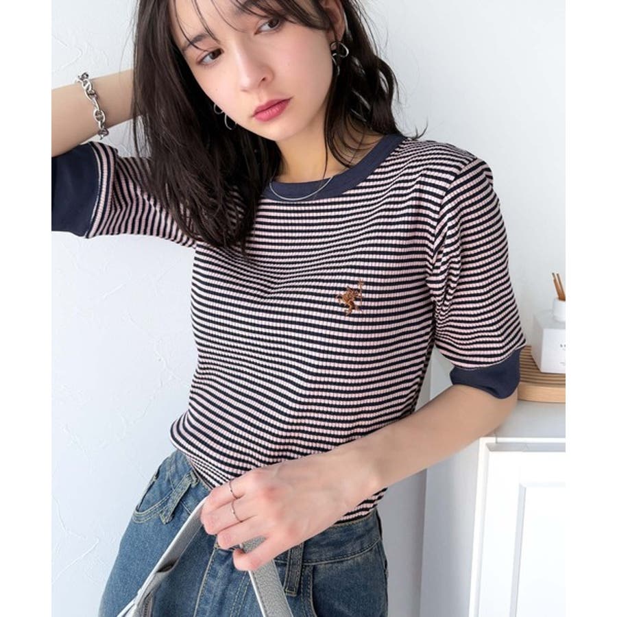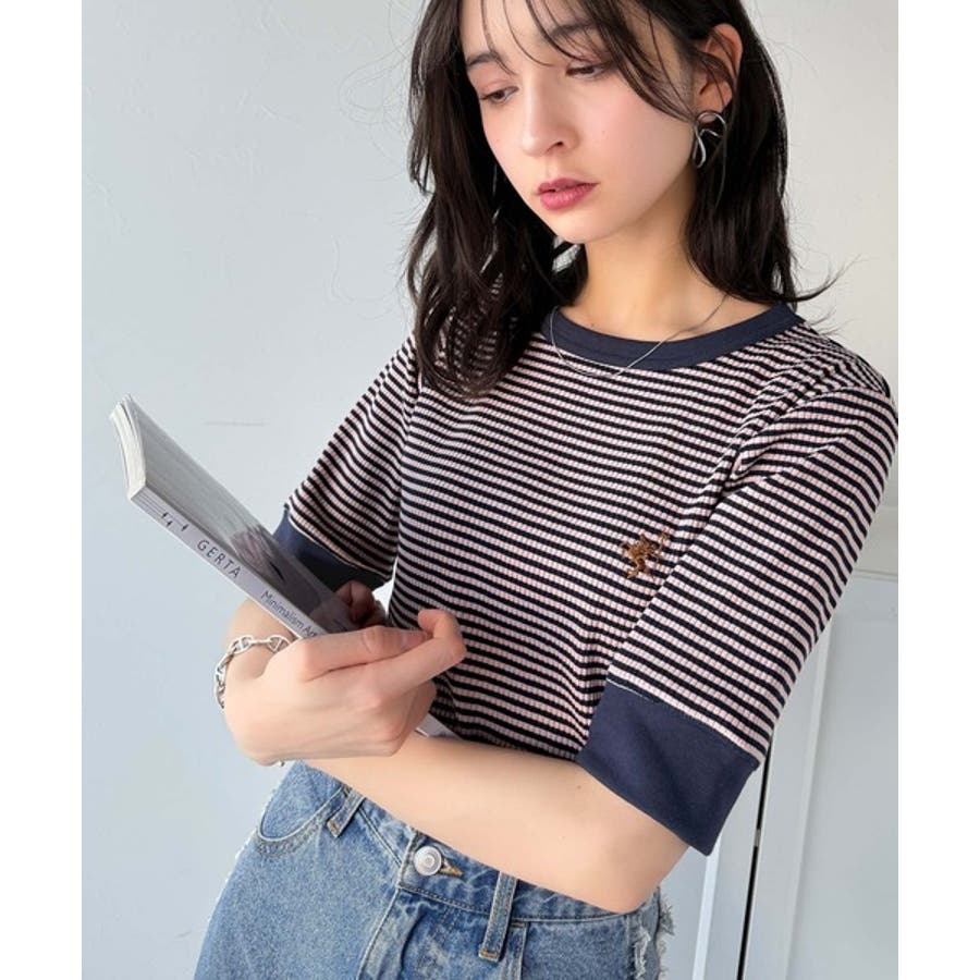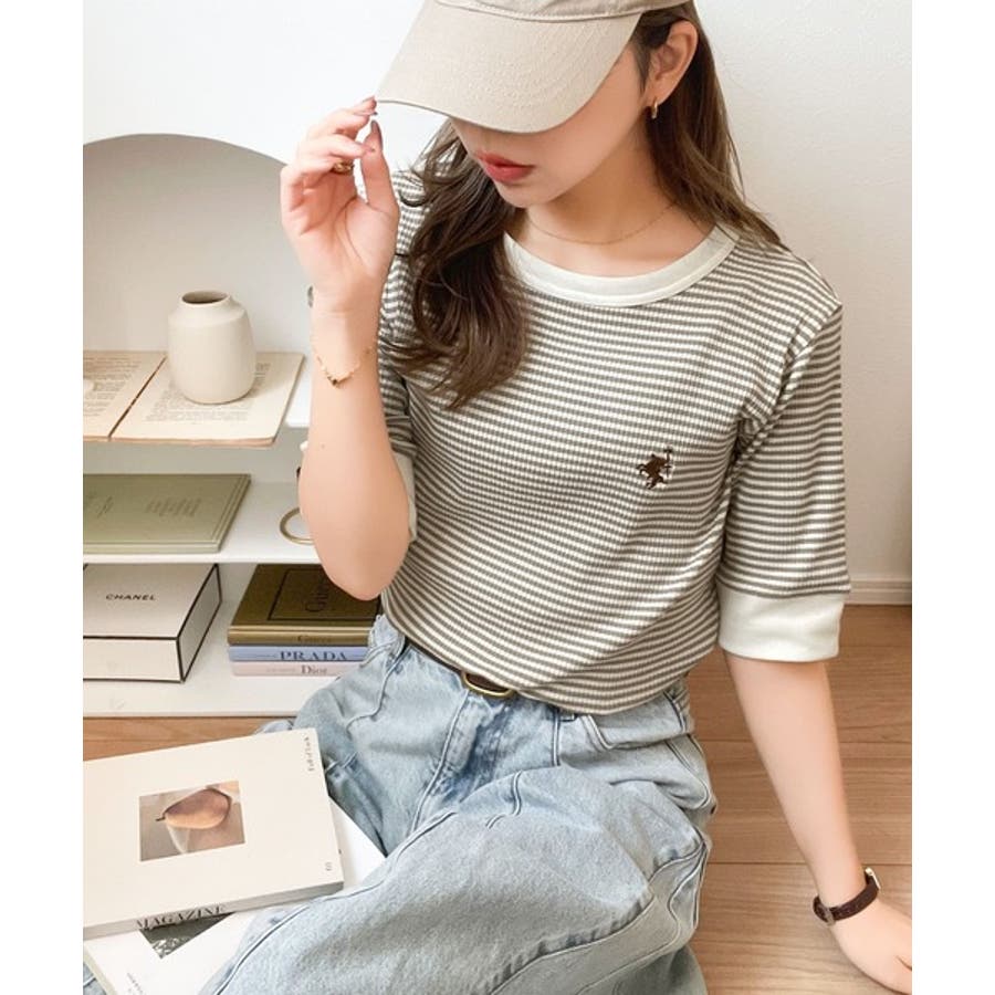 大人可愛いの新定番。袖リンガーボートネック胸刺繍ボーダーTシャツ(半袖)