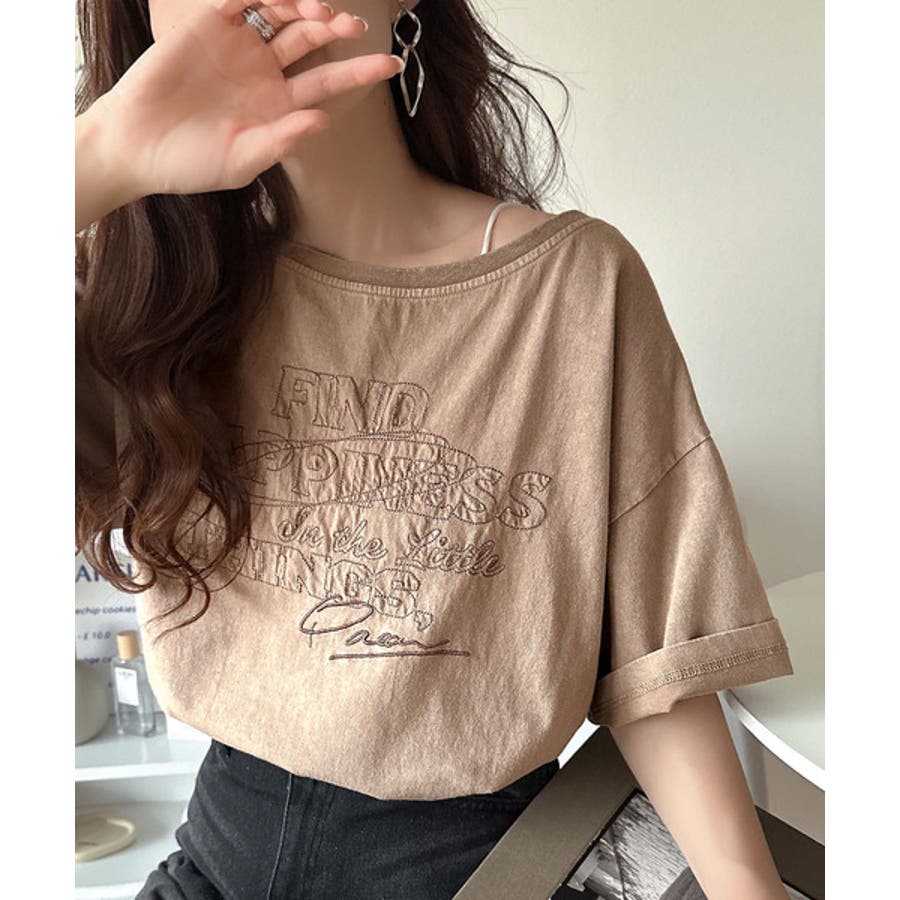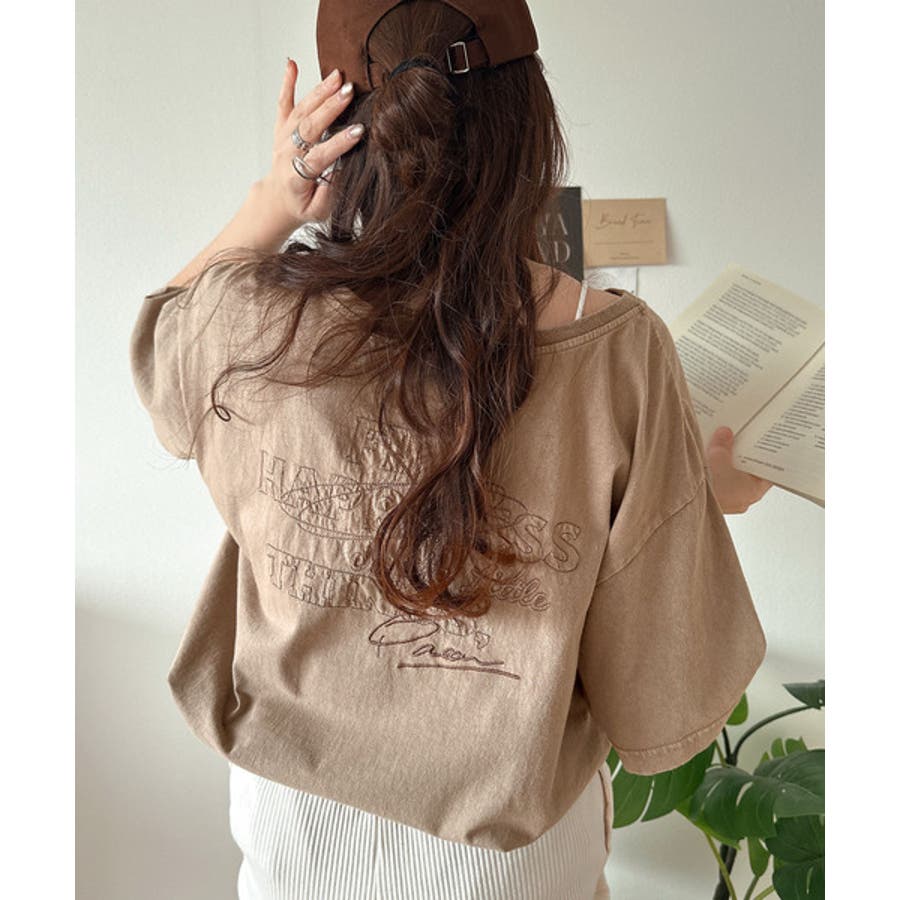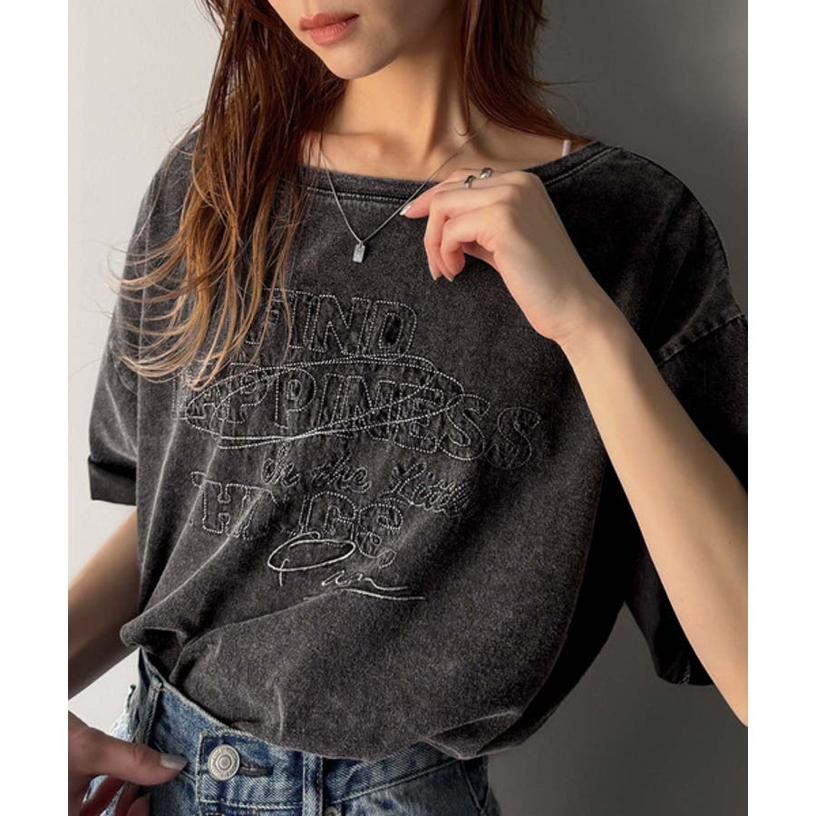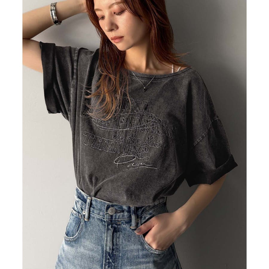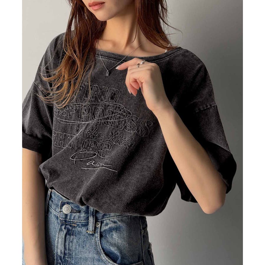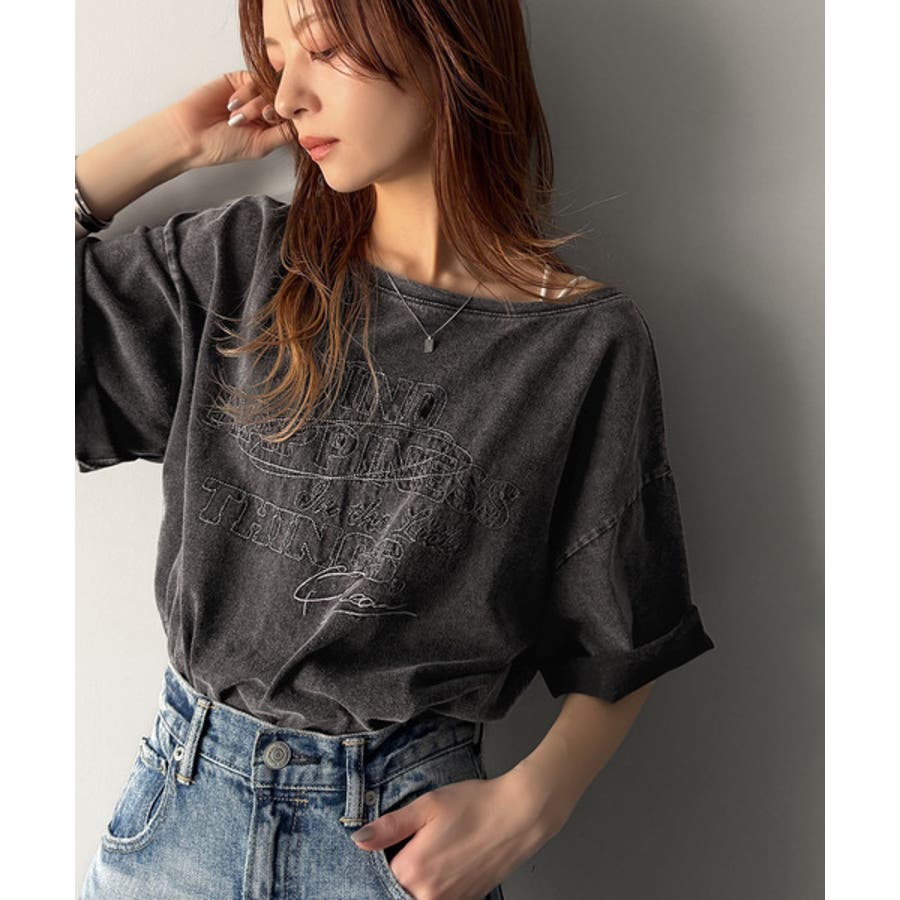 綿100%ヴィンテージウォッシュ☆前後2way刺繍ワイドネックTシャツ