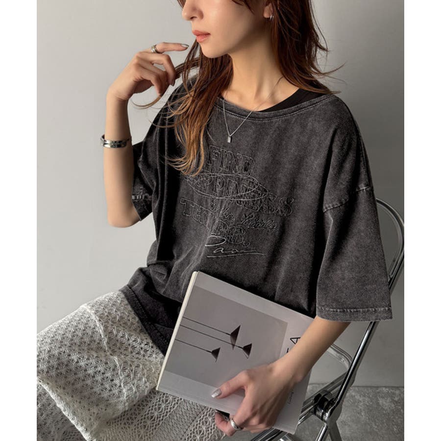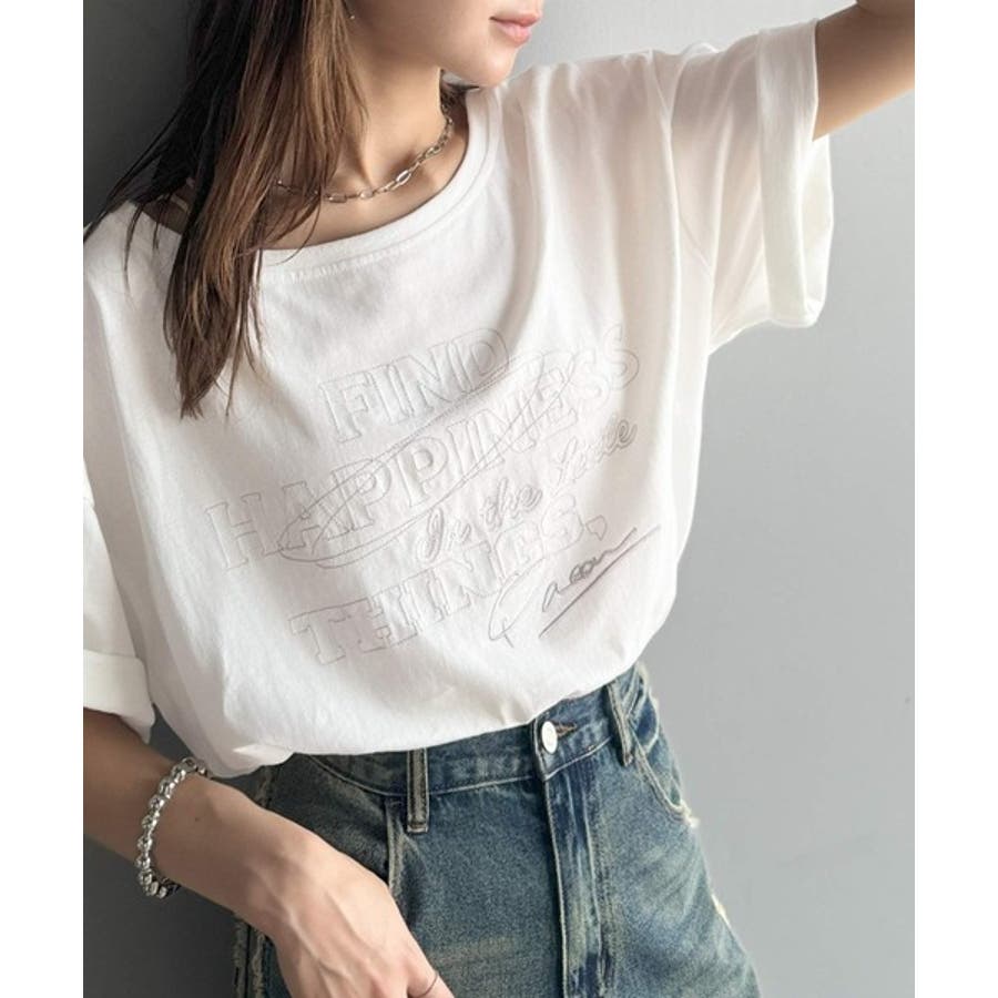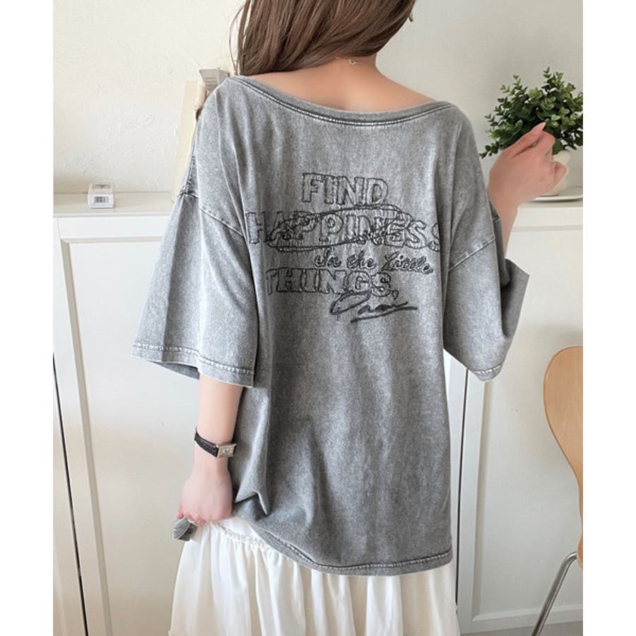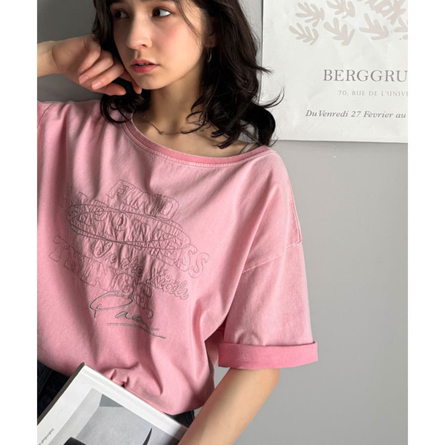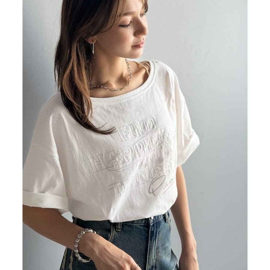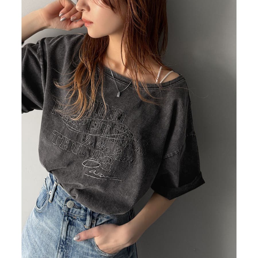 綿100%ヴィンテージウォッシュ☆前後2way刺繍ワイドネックTシャツ