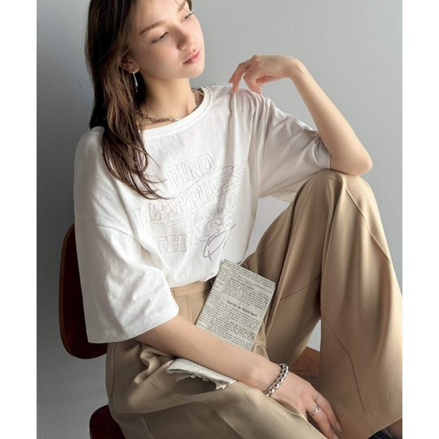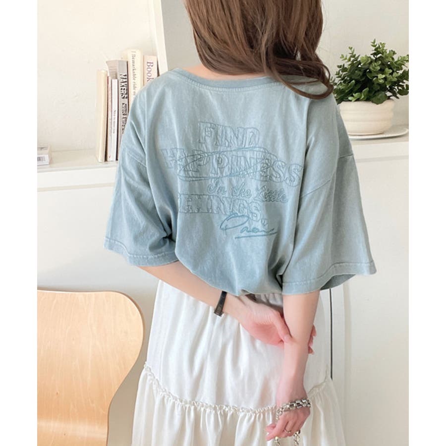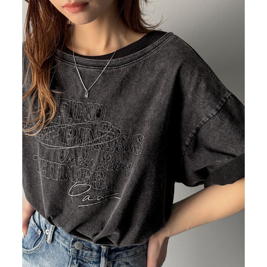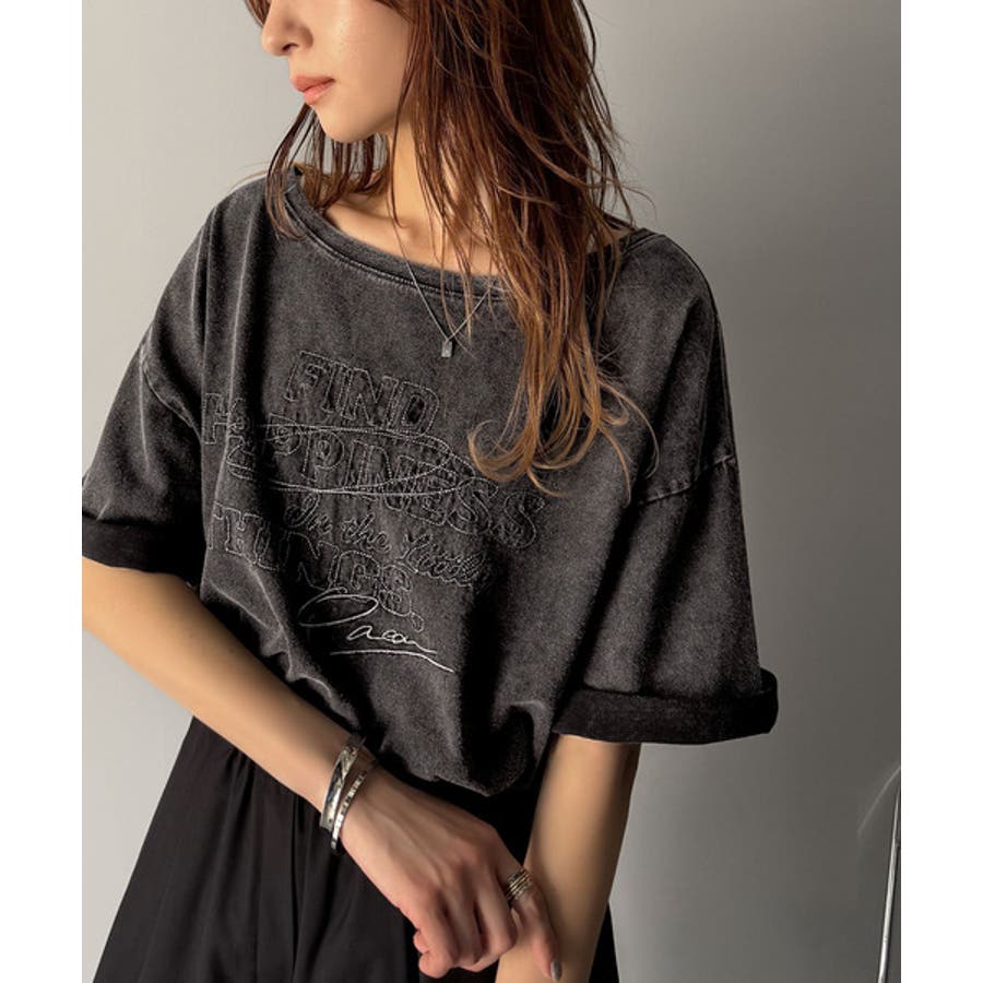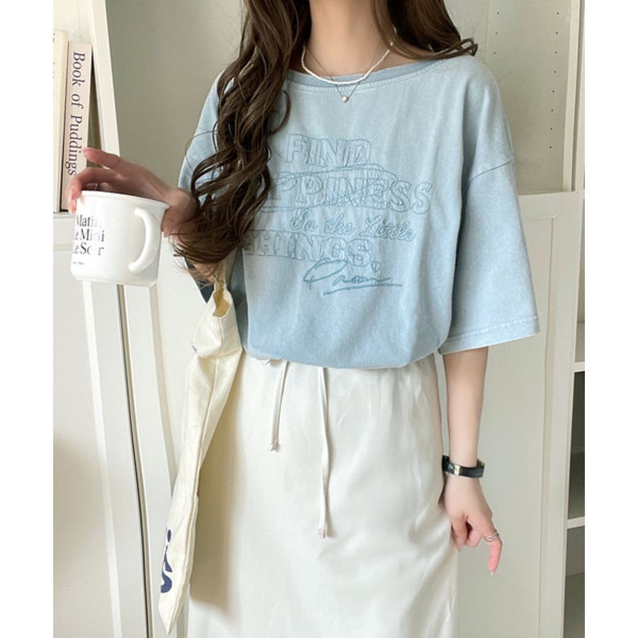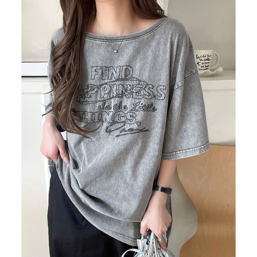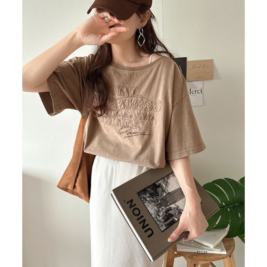 綿100%ヴィンテージウォッシュ☆前後2way刺繍ワイドネックTシャツ