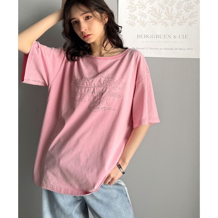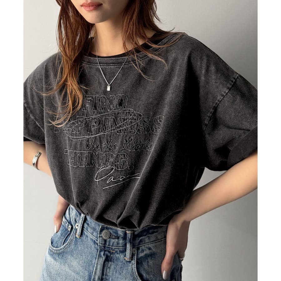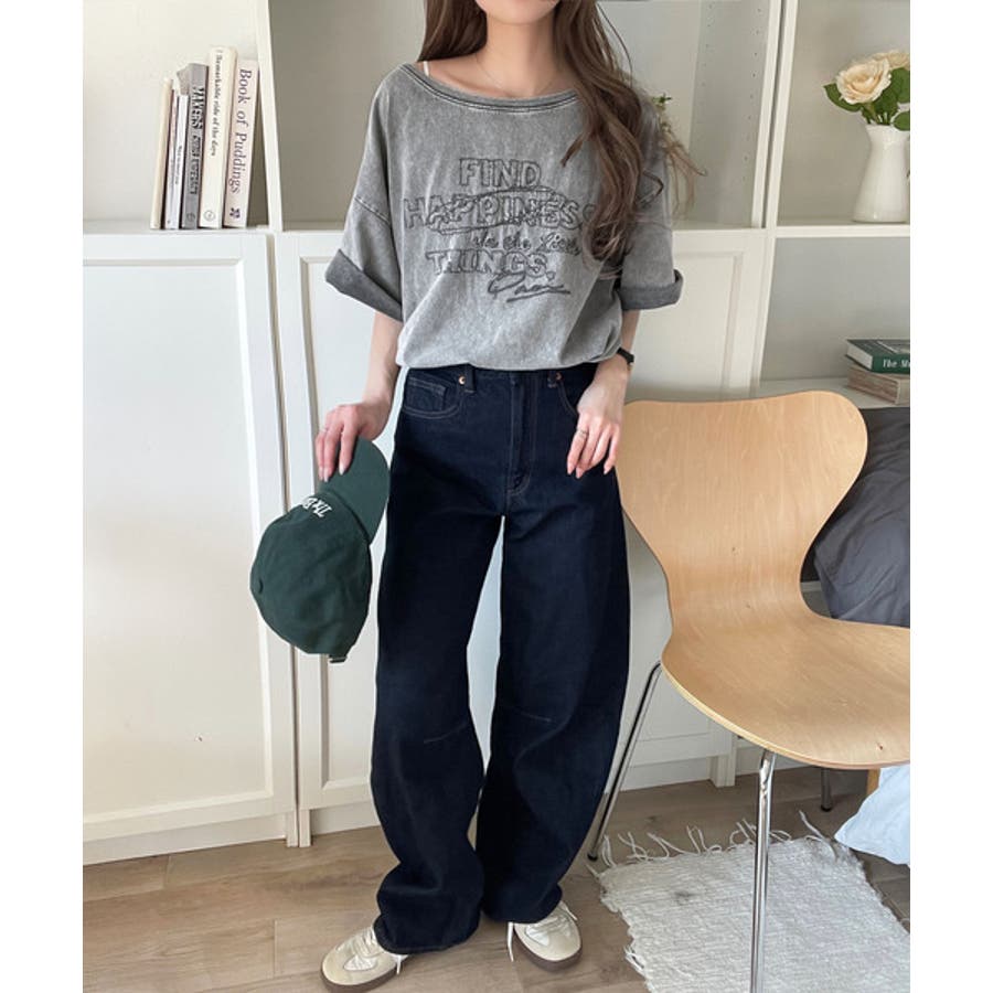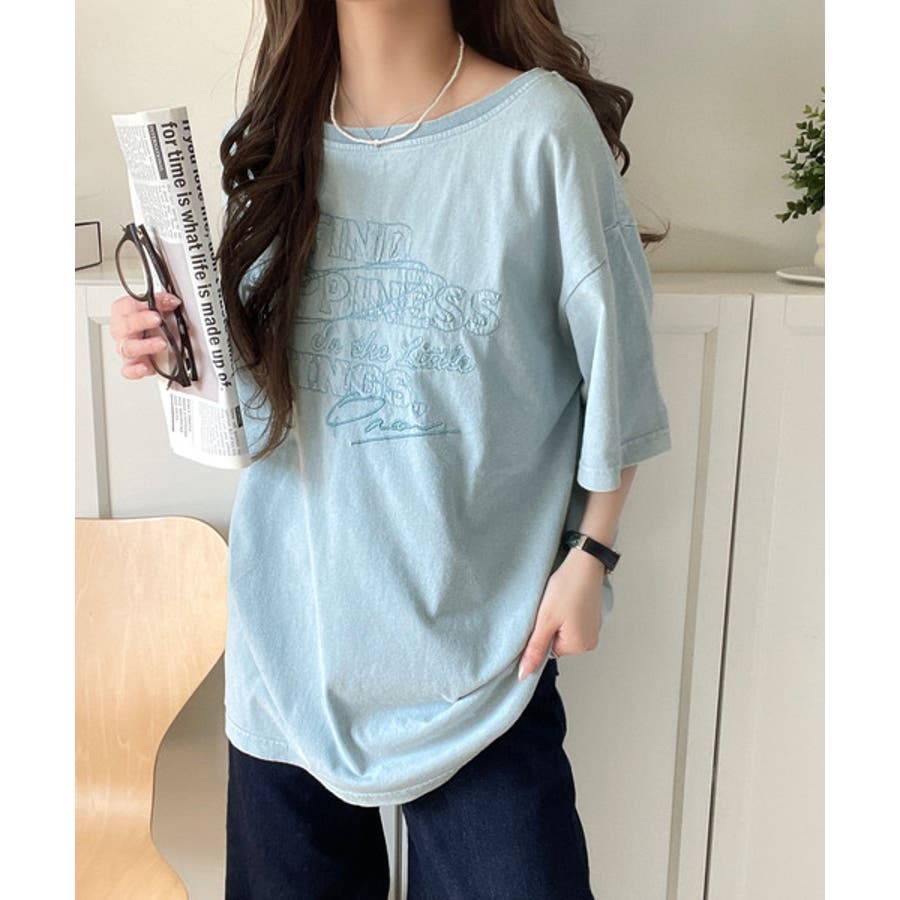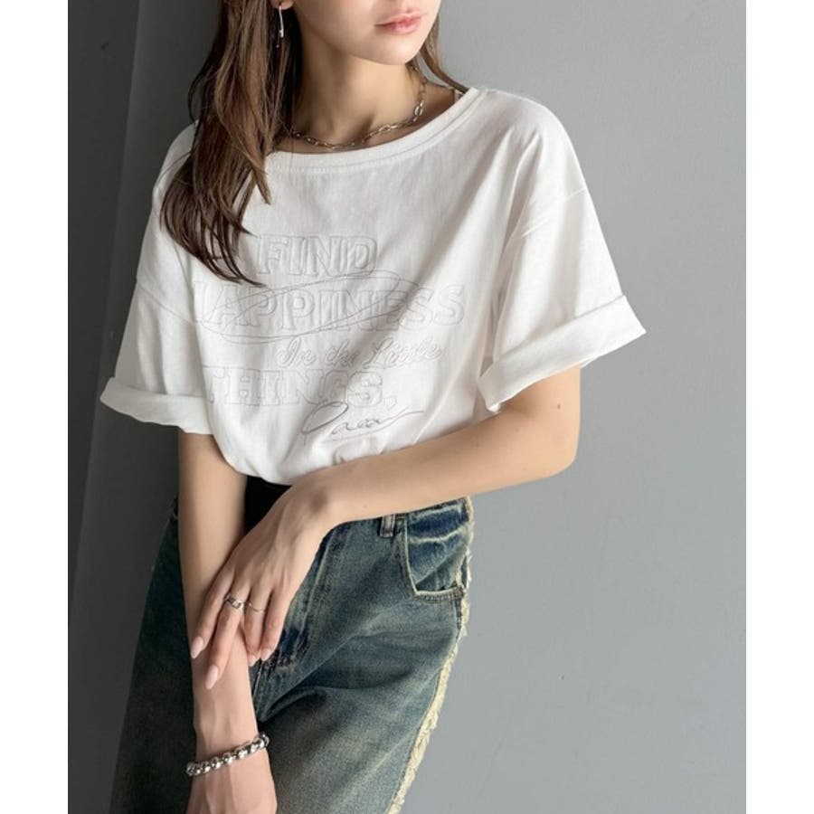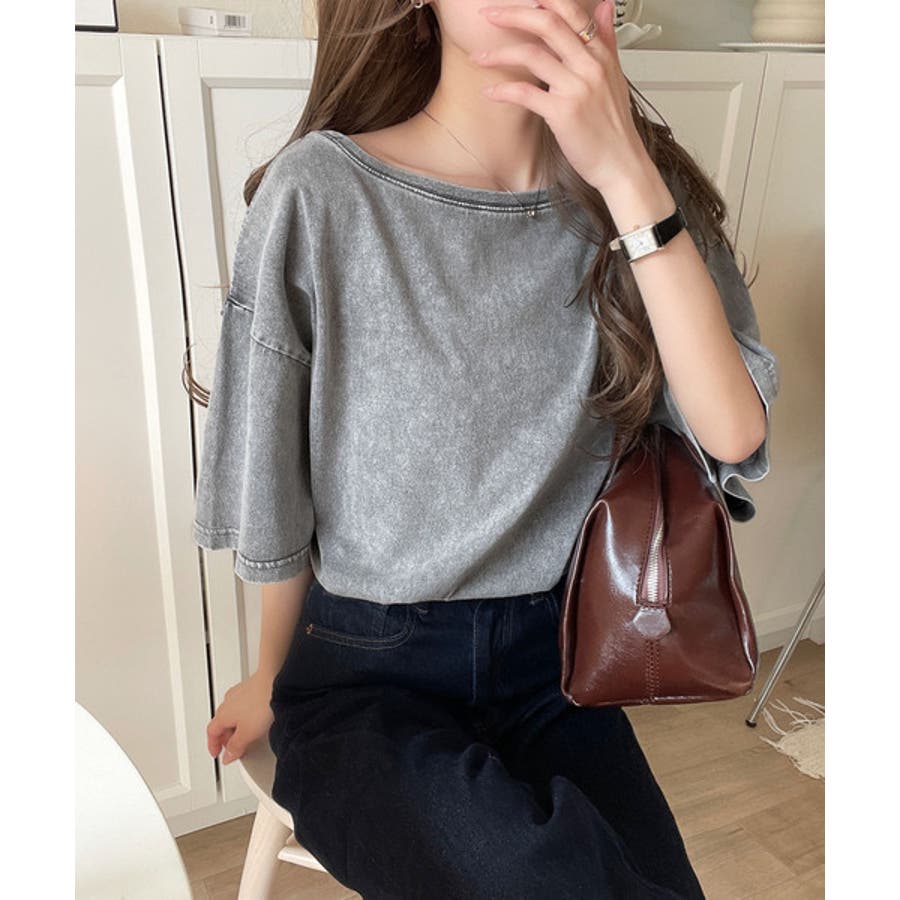 綿100%ヴィンテージウォッシュ☆前後2way刺繍ワイドネックTシャツ