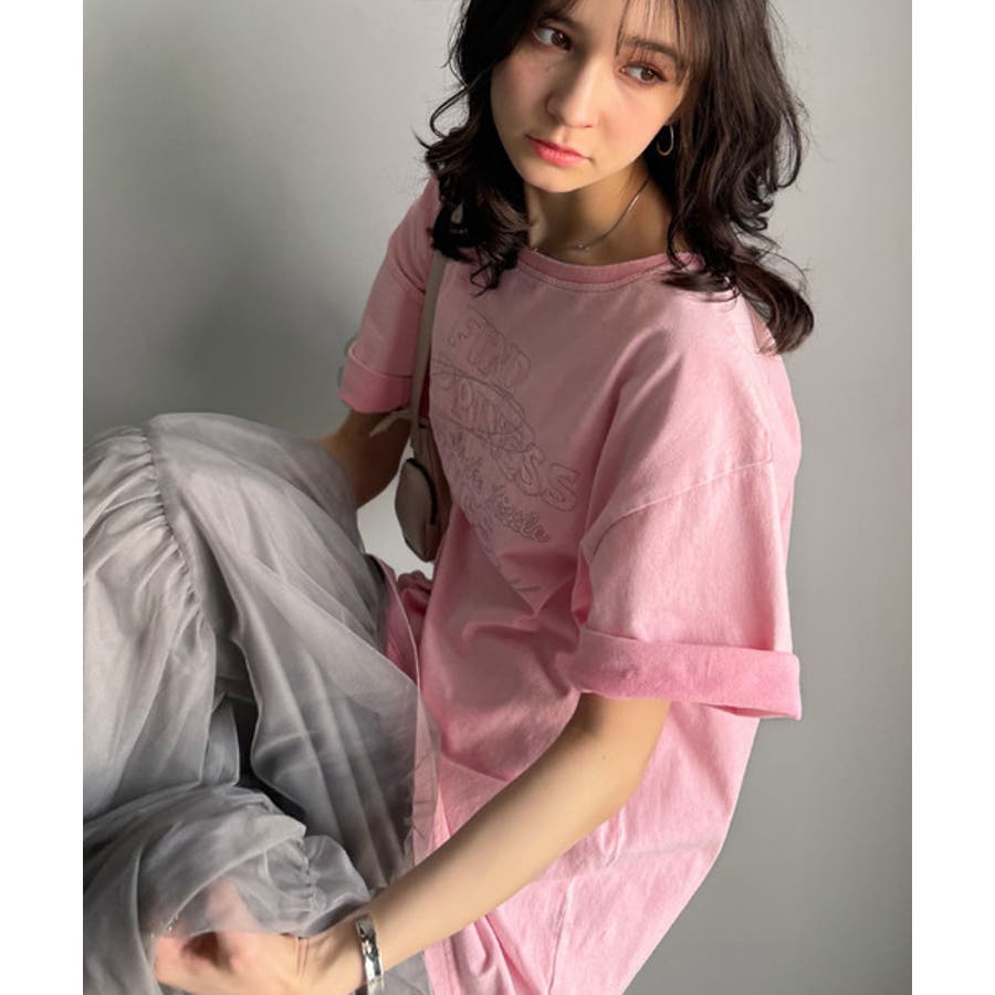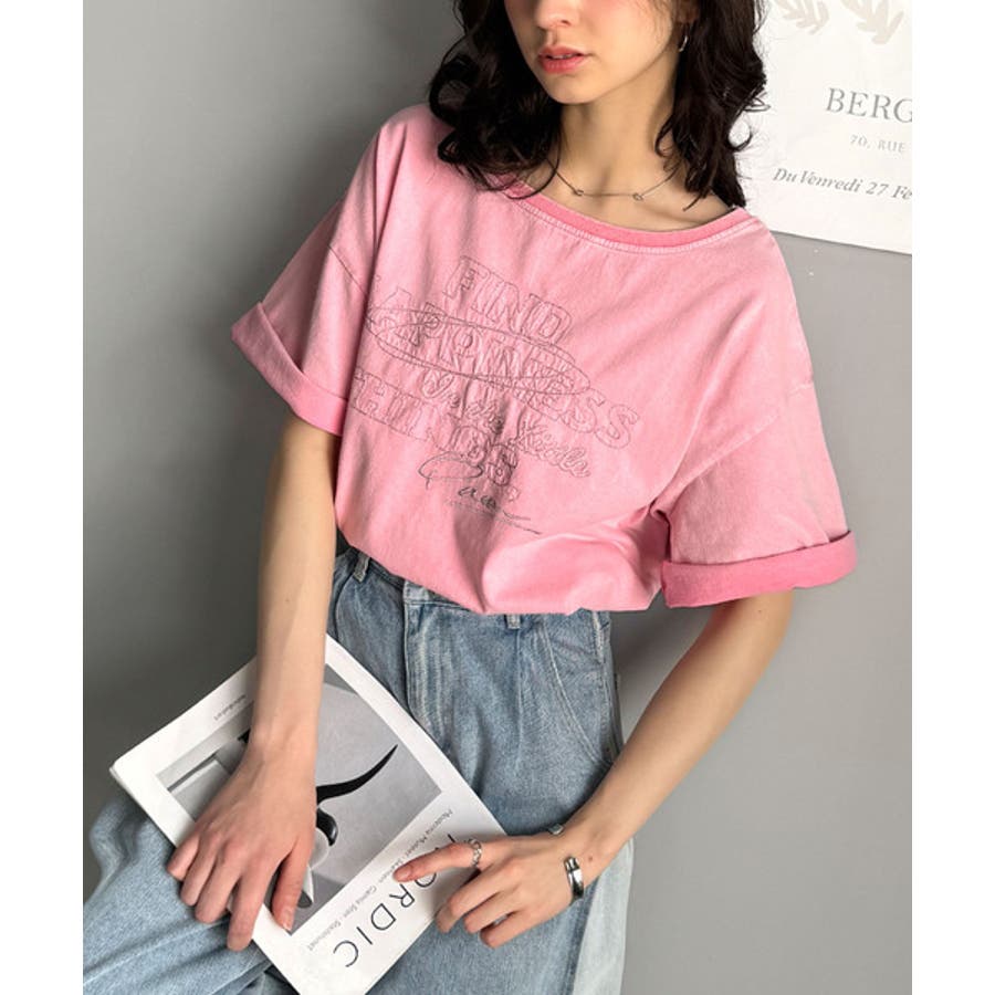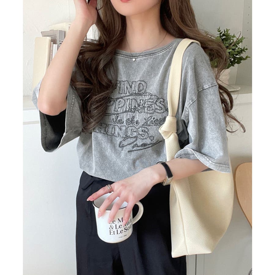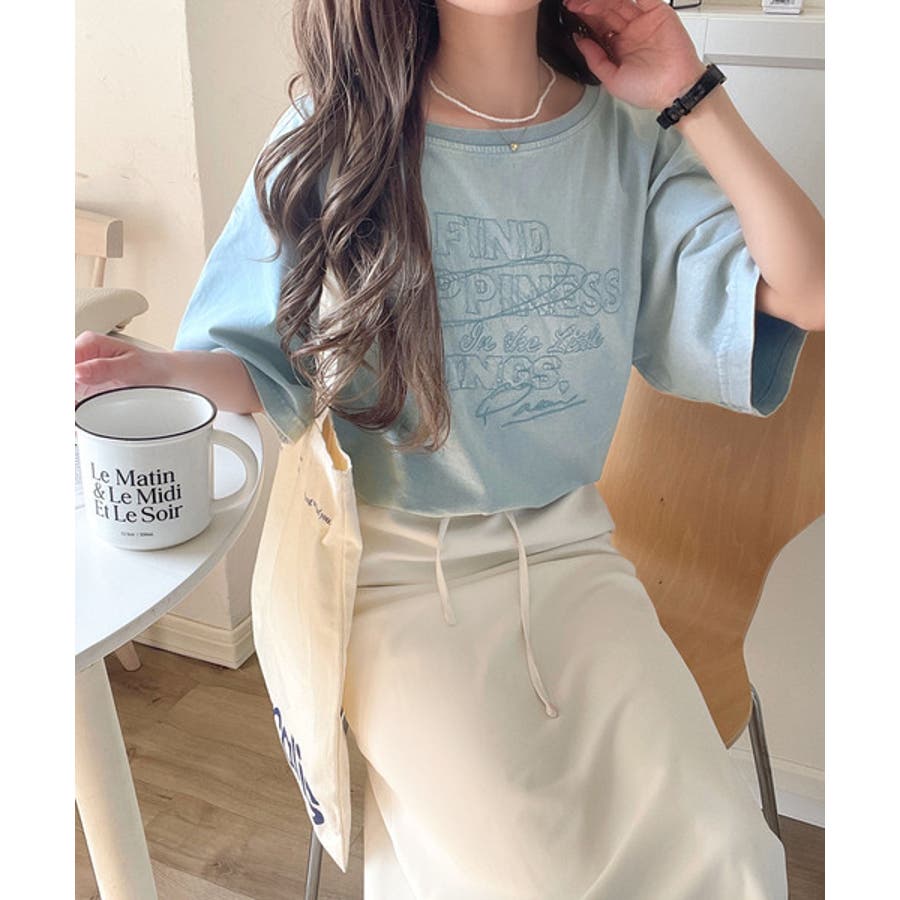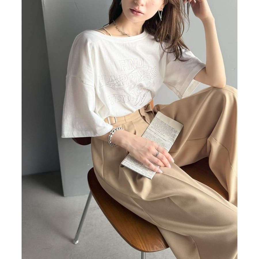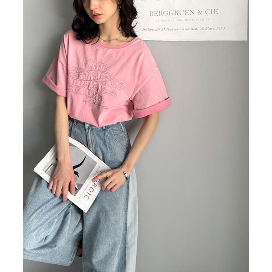 綿100%ヴィンテージウォッシュ☆前後2way刺繍ワイドネックTシャツ