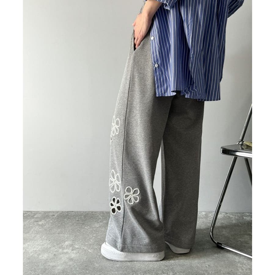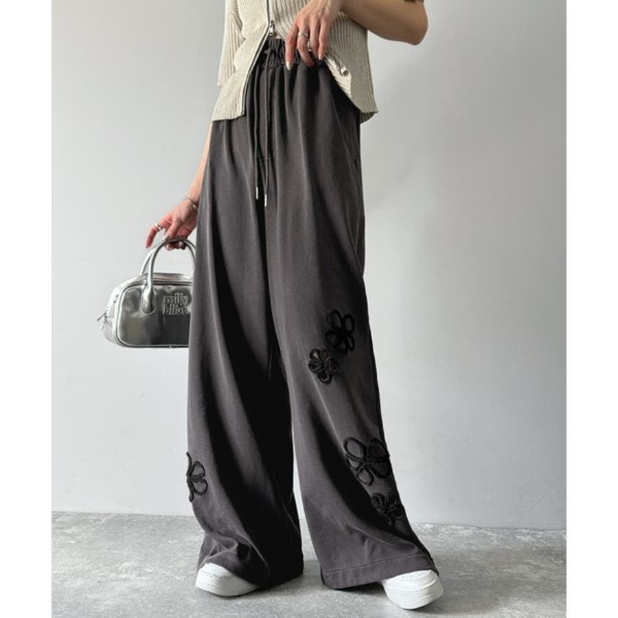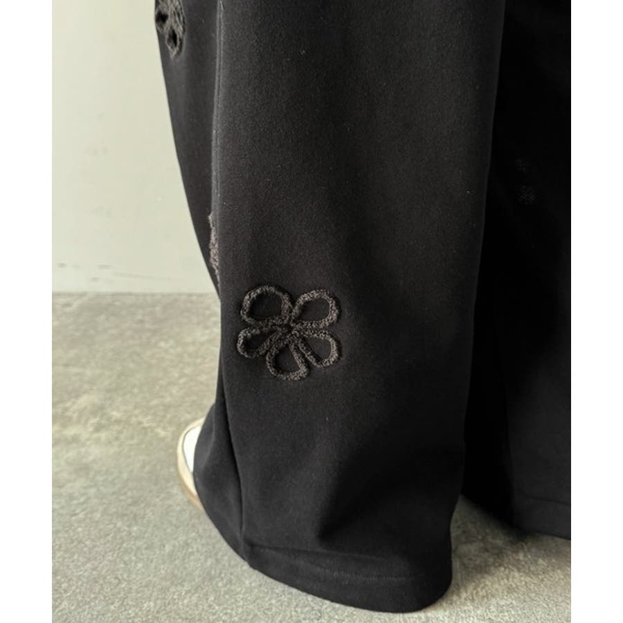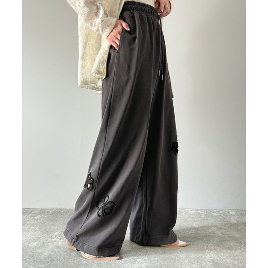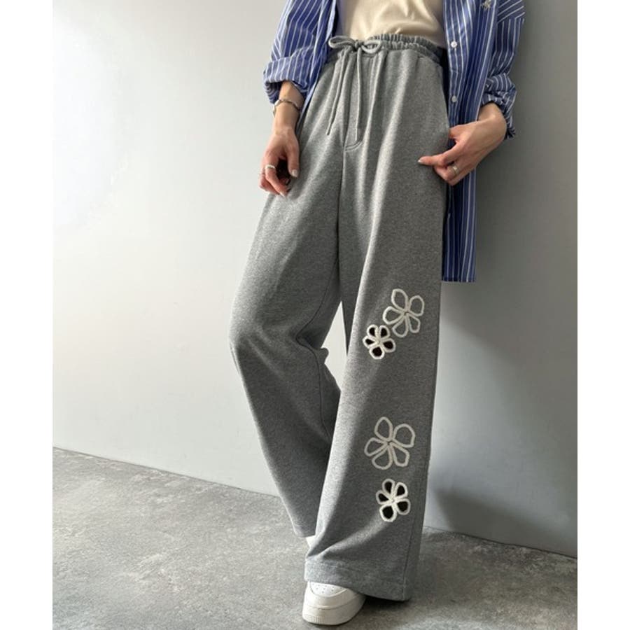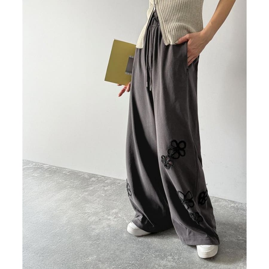 大人の遊び心が光る。フラワーサガラ刺繍くり抜き裏毛スウェットワイドパンツ